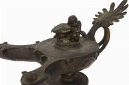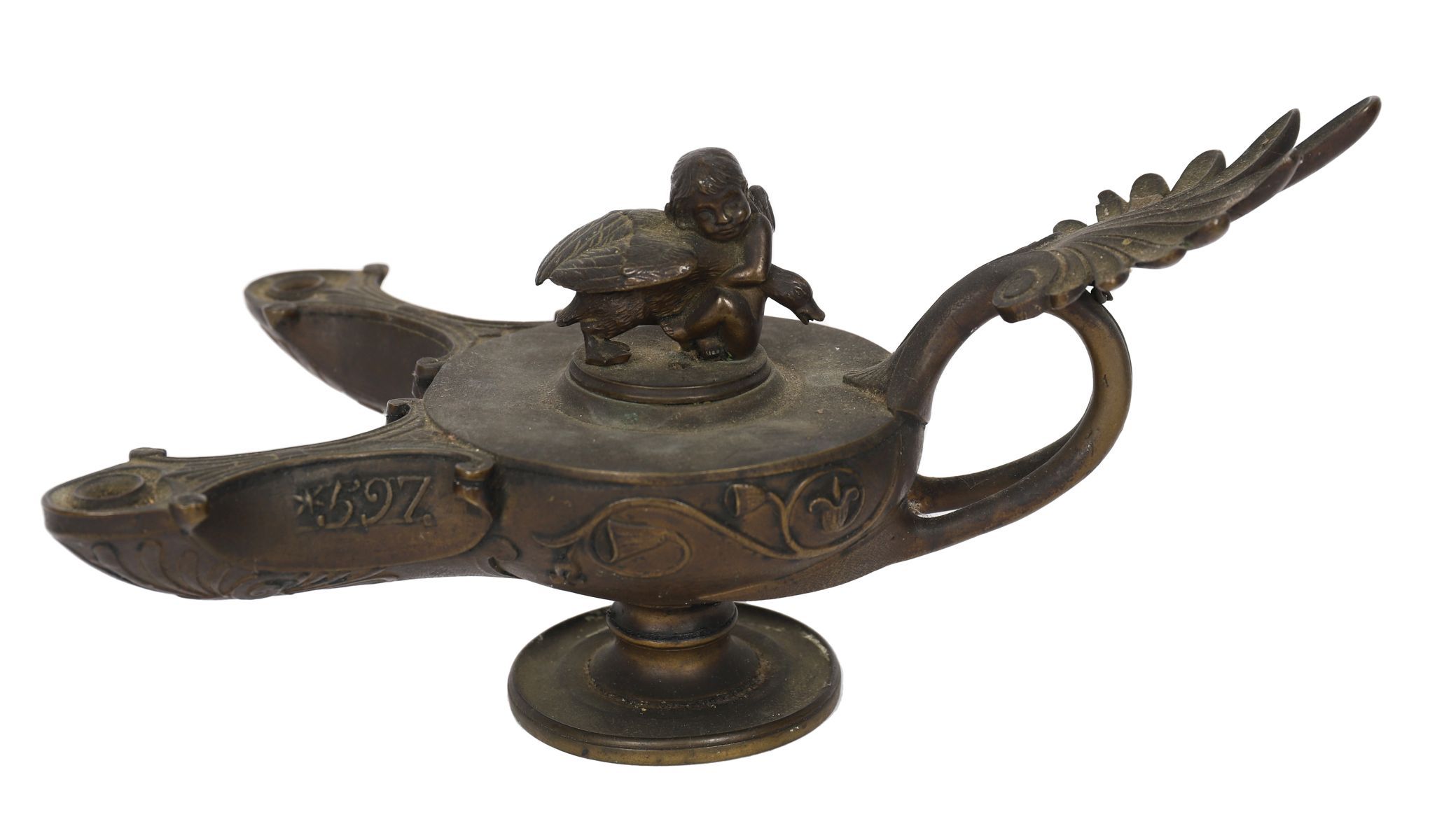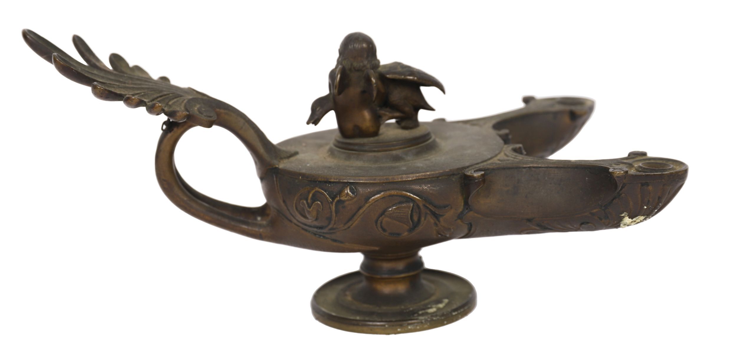 A neoclassical bronze table lamp modelled in the form of a classical oil lamp, with figural finial and scrolling handle, raised on a circular base. Converted to electricity.