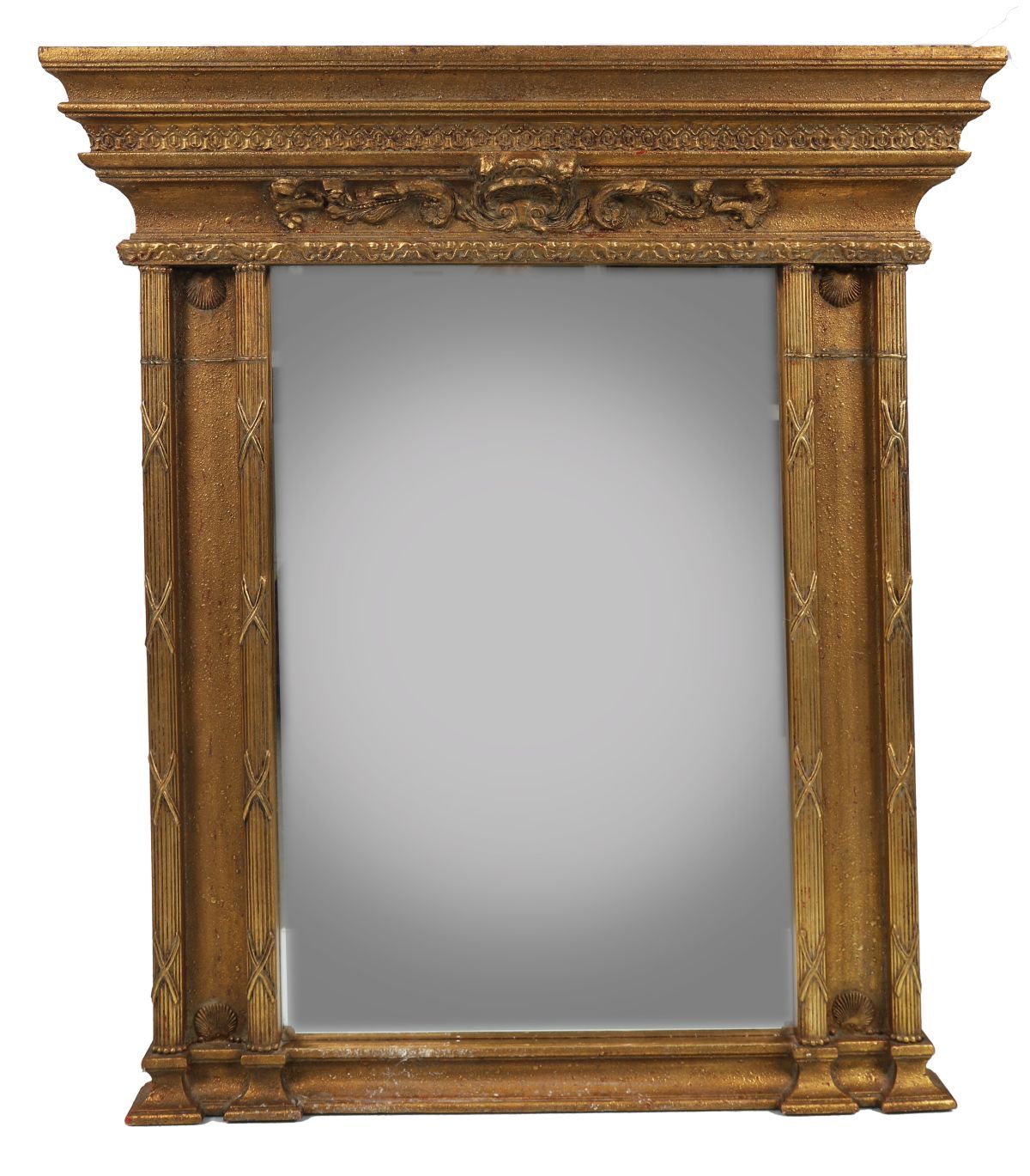 The rectangular bevelled plate is flanked by ribbon-tied reeded columns below a stepped moulded pediment.