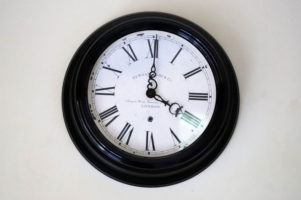 With Roman numeral dial inscribed Newgate Works, Oswestry, Shropshire & London, within a circular black frame.