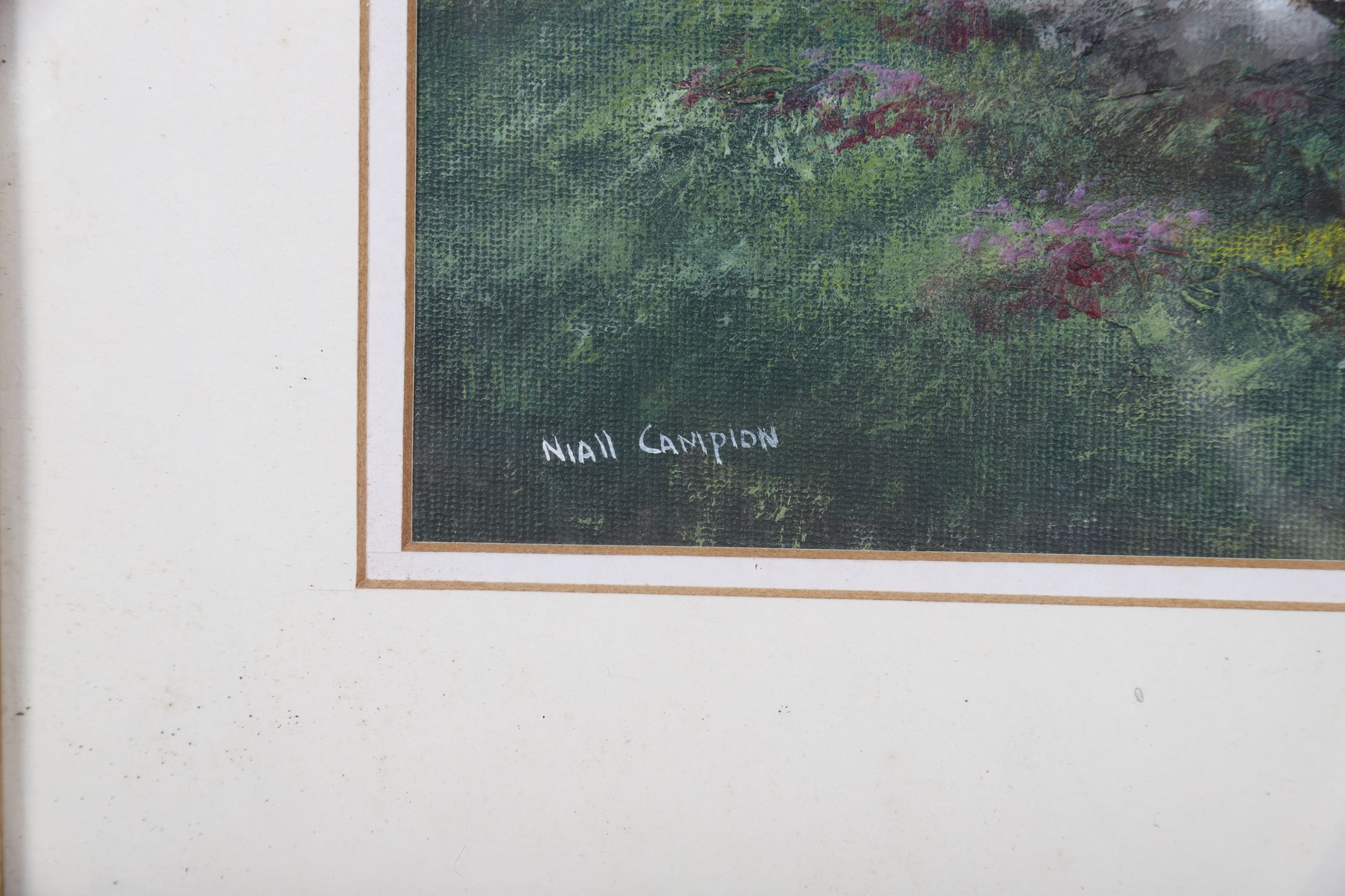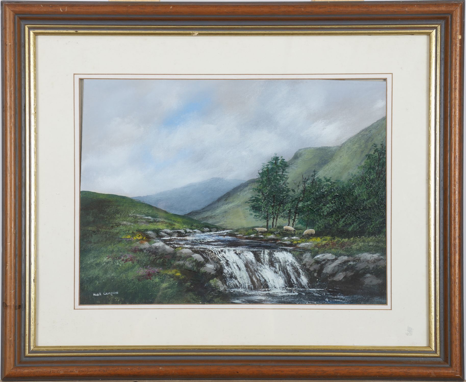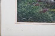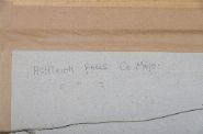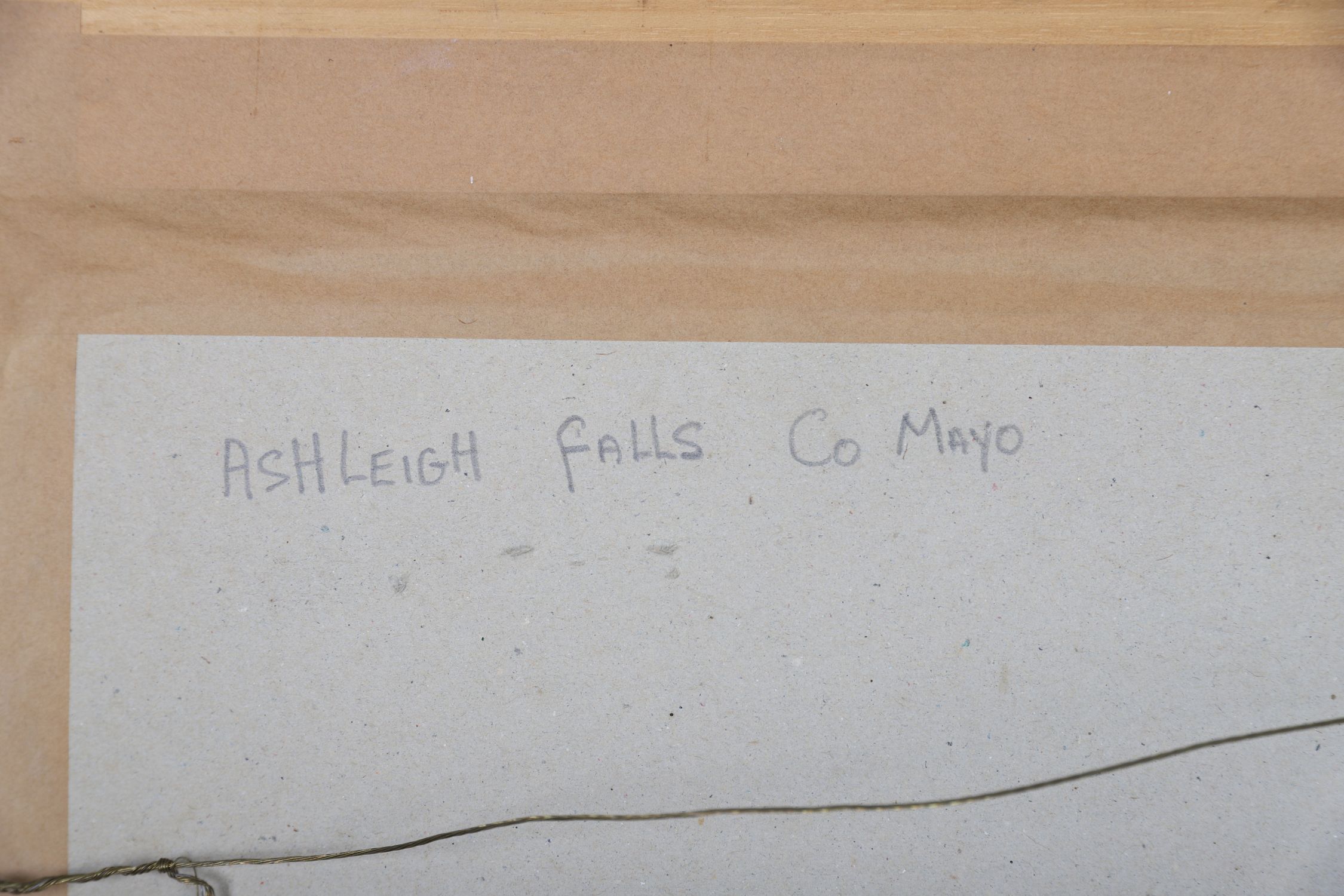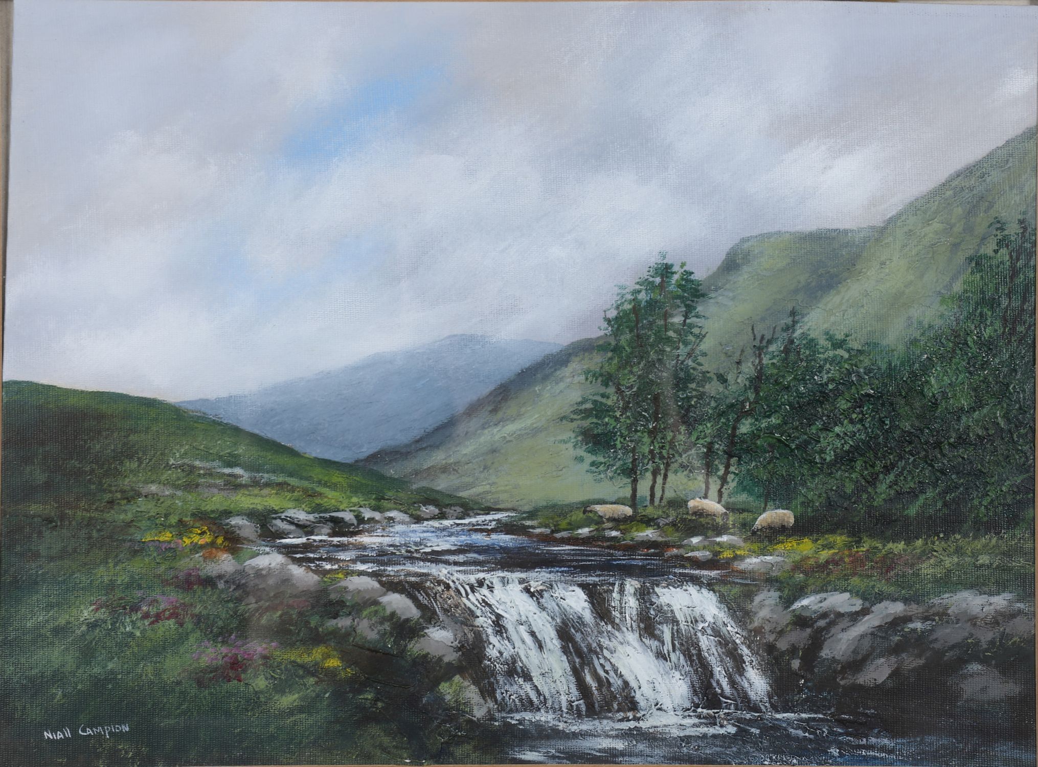 Description: A naturalistic painting of Ashleigh Falls set among soft green hills. A calm, detailed landscape. Signed lower left.
