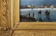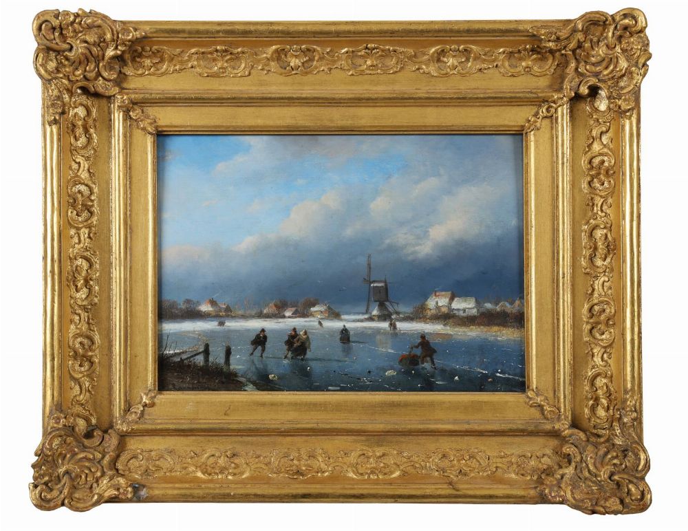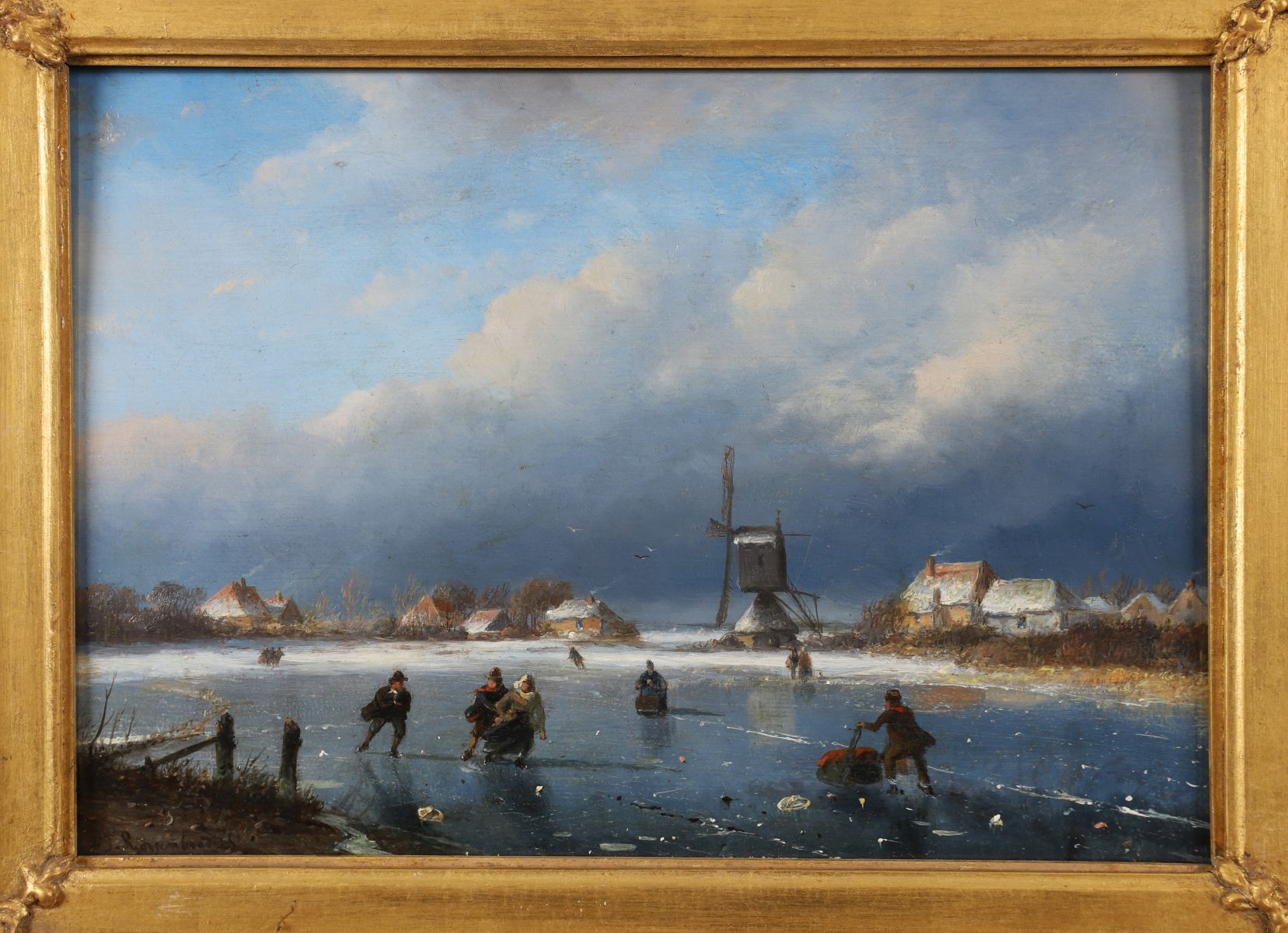 A crisp winter scene showing figures skating on a frozen river before a Dutch village, under a blue sky with drifting clouds. Oil on panel, signed lower left. Presented in an ornate gilt frame.