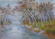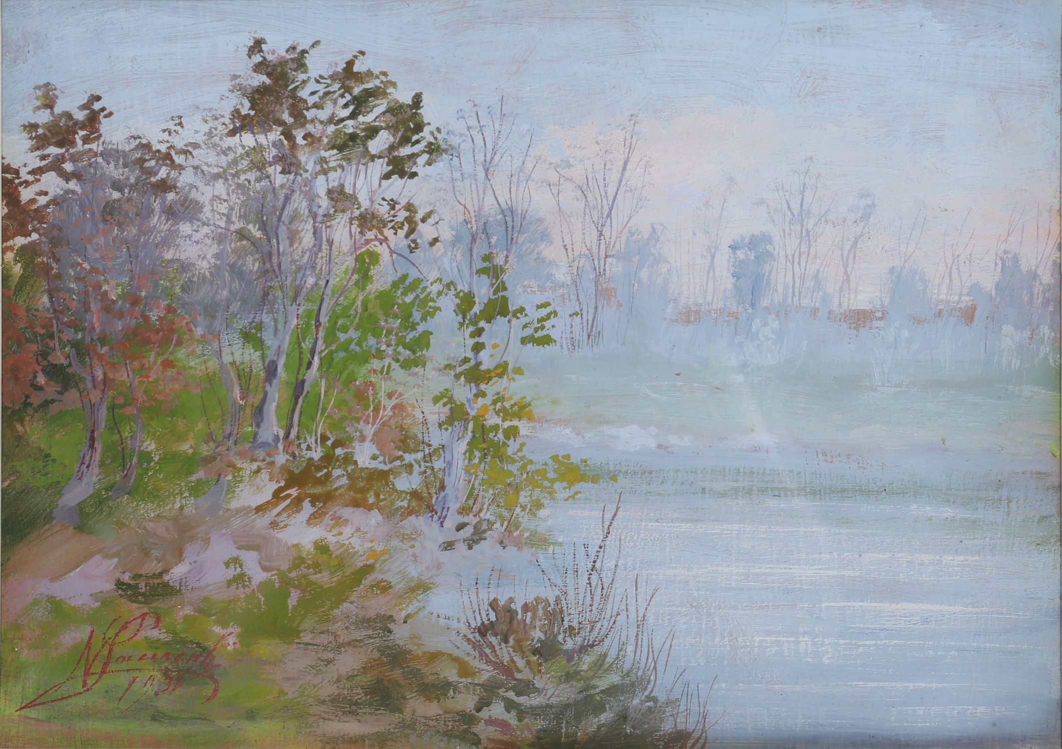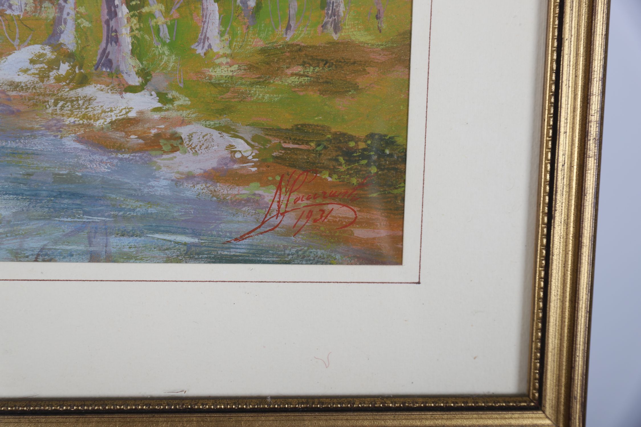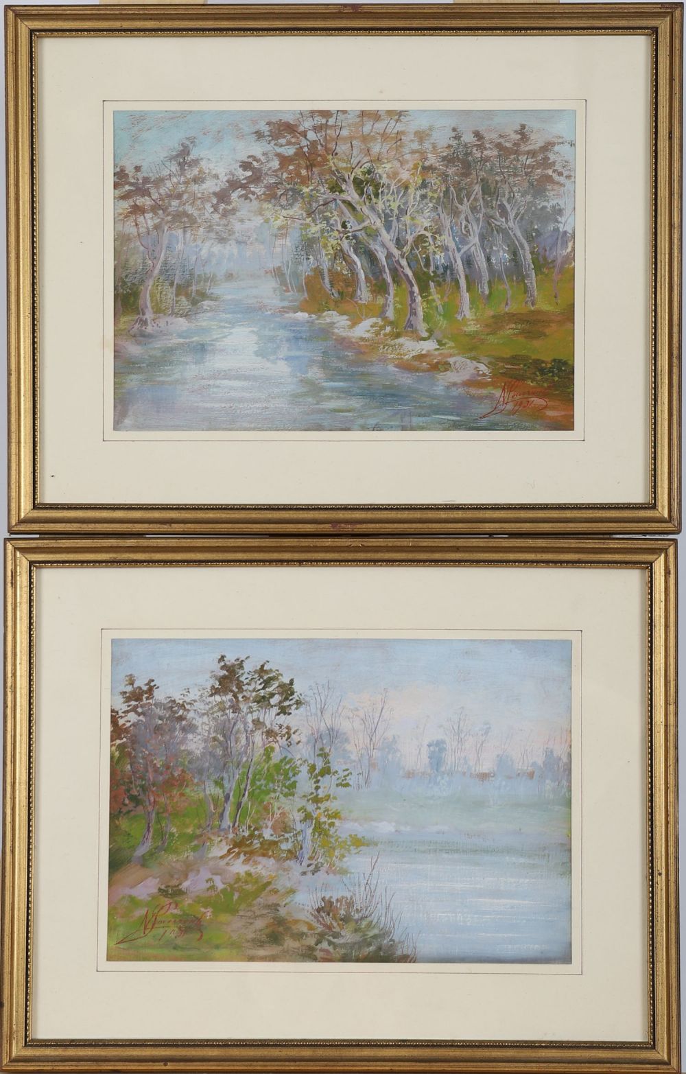 A pair of watercolour river landscapes, each depicting wooded riverside views with autumnal tones, Waterway, Milano; Waterway, Milano. Both framed and glazed. Watercolour.