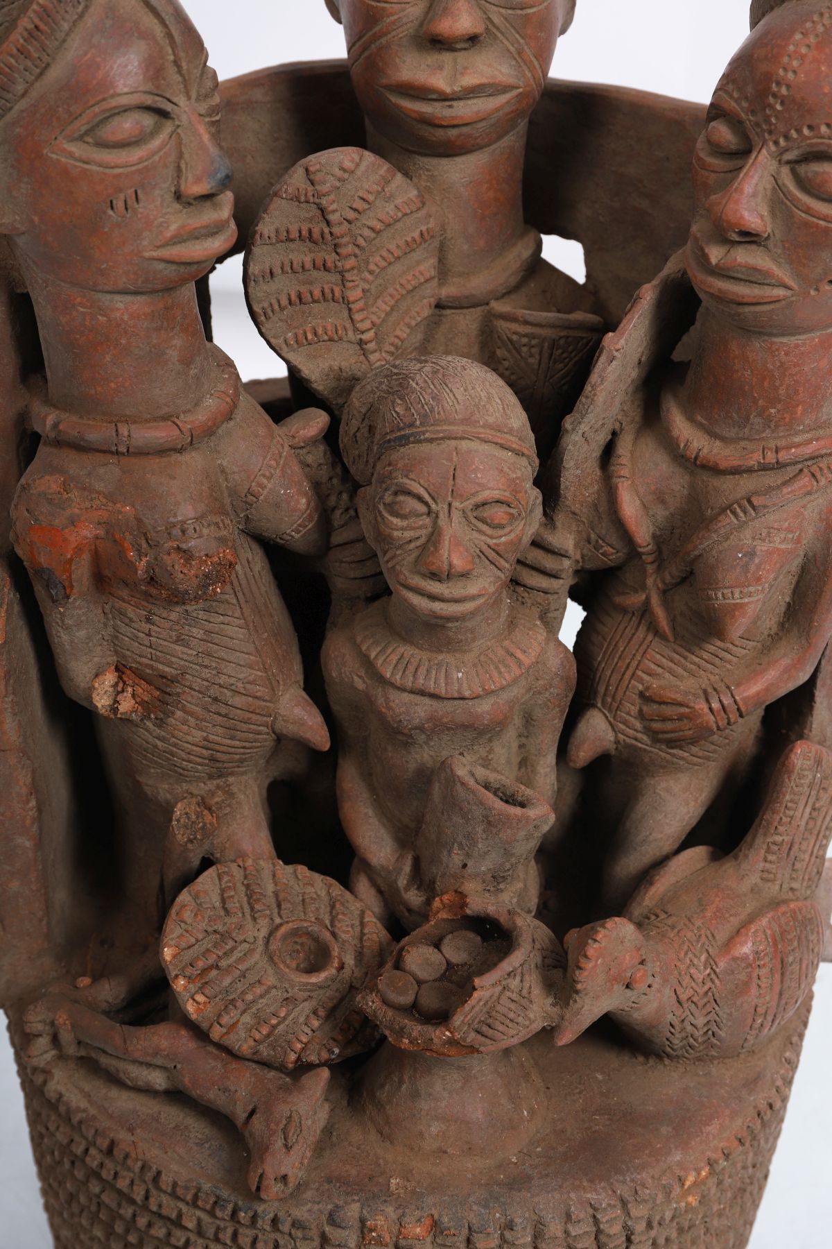 A Nigerian terracotta figural group, Yoruba or from the Lower Niger region, depicting a communal or familial scene, late 19th or early 20th century, with surface wear and patination consistent with age and use.