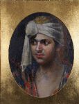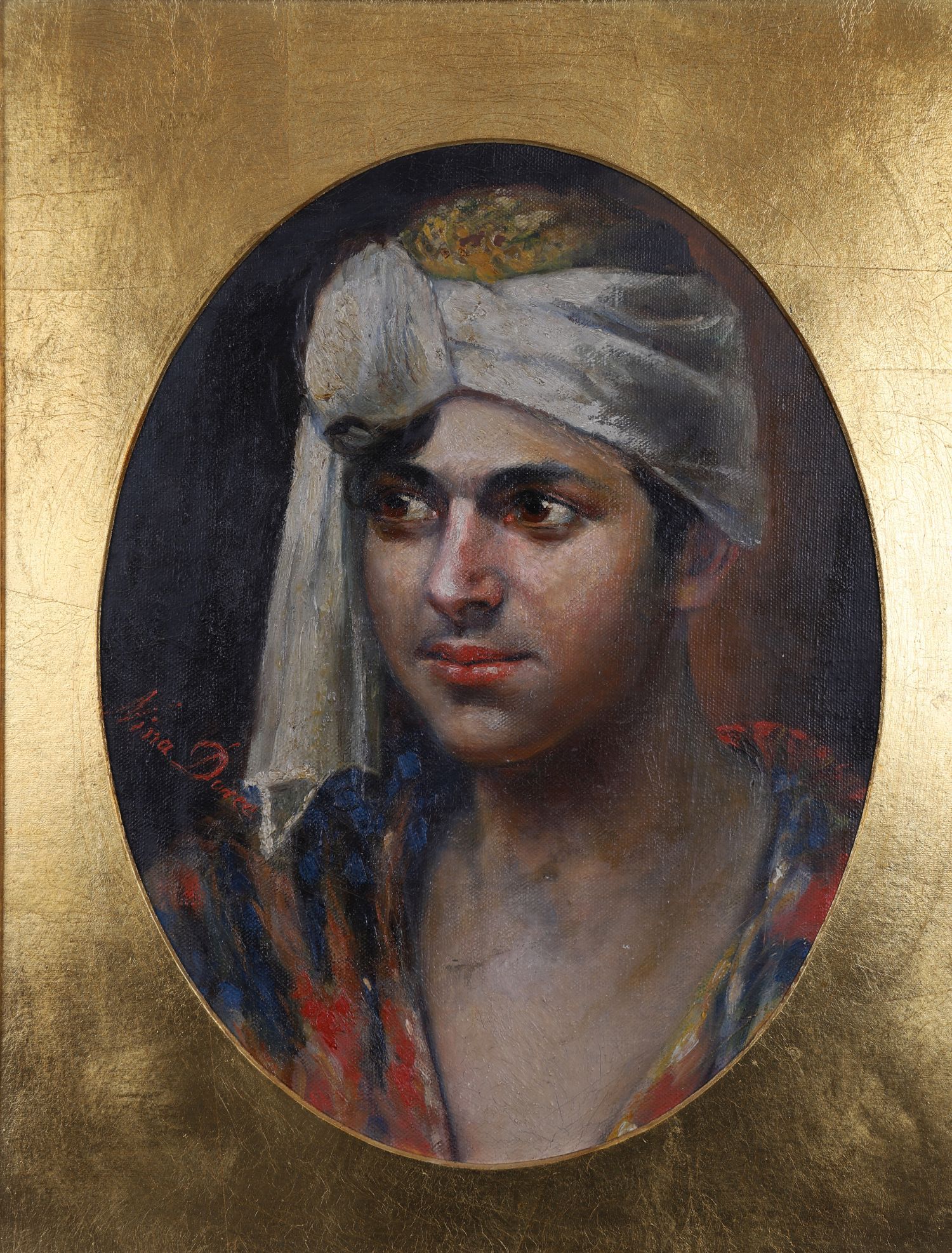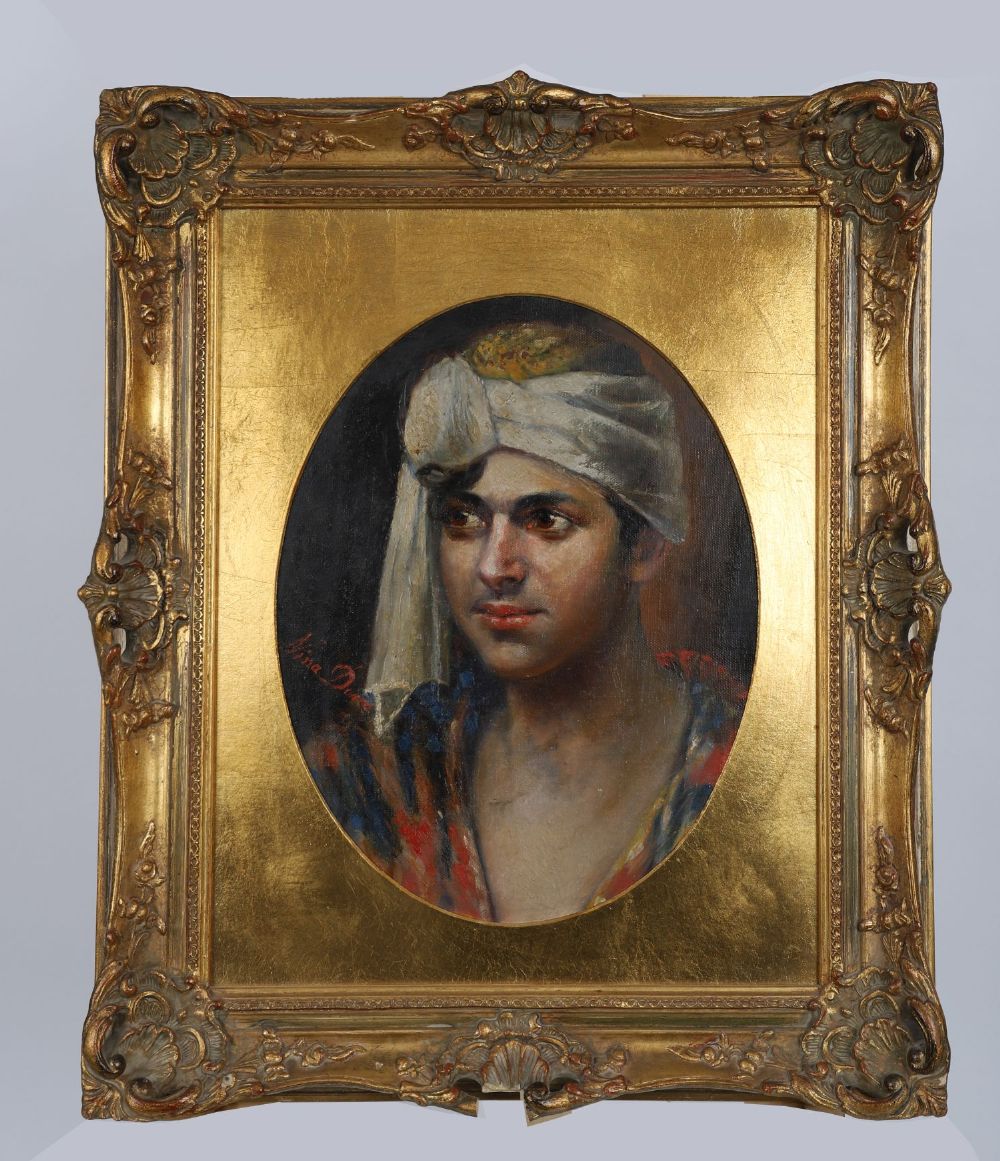Portrait of a Persian with turban. Oil on board. Signed mid left. Enclosed in a gilt frame.