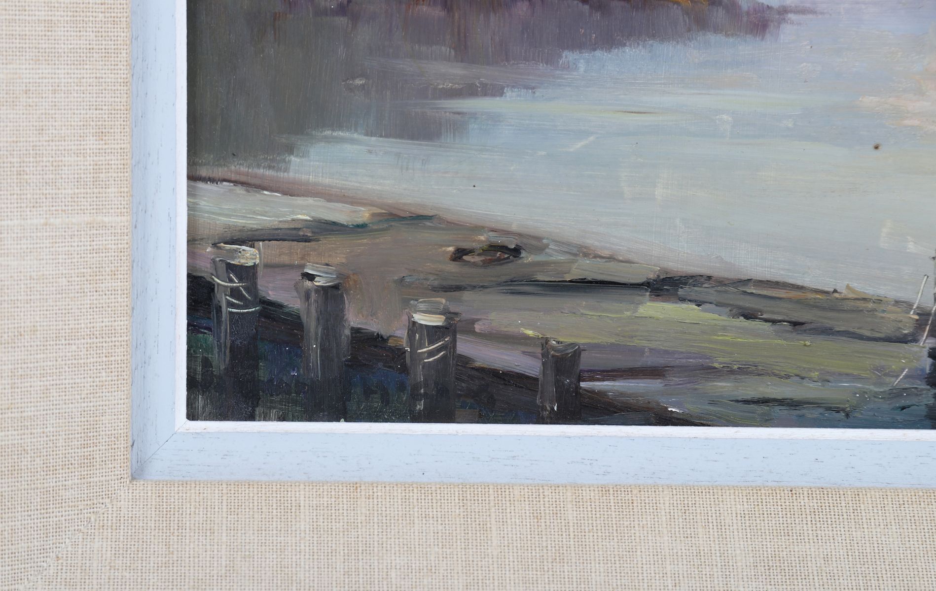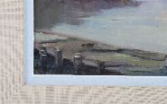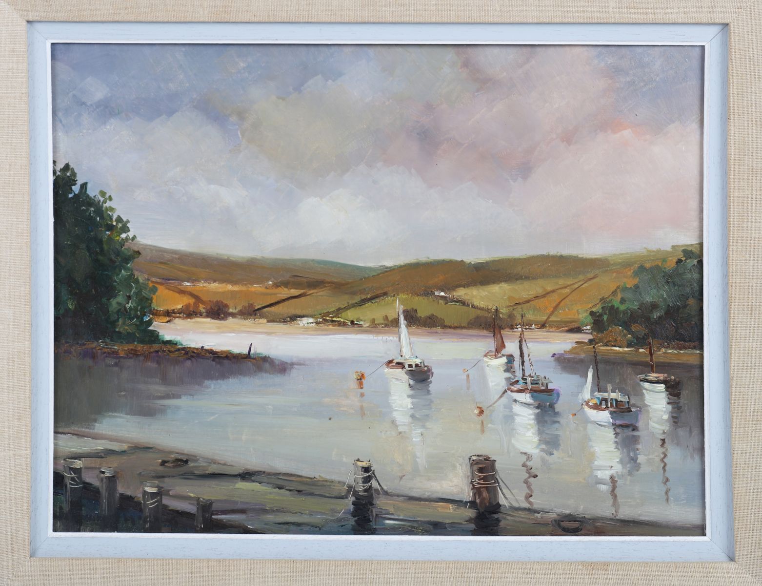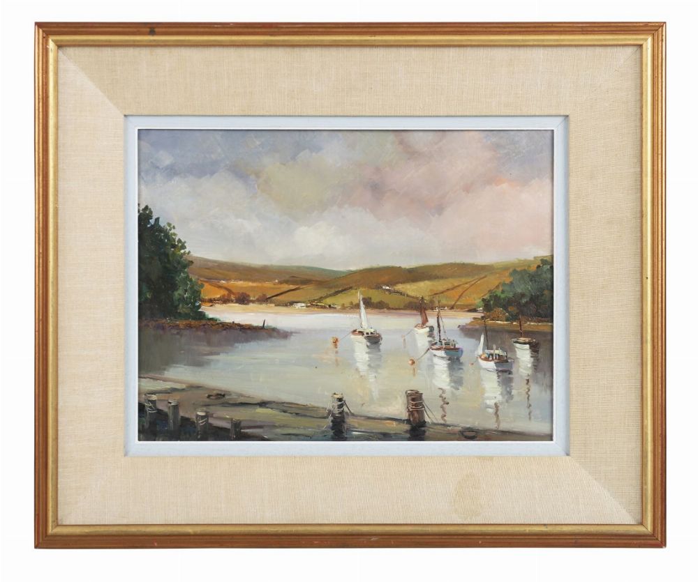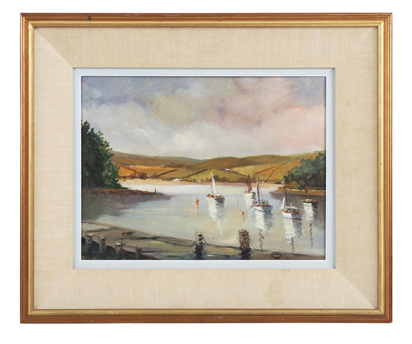 An atmospheric oil on board portraying a peaceful harbour with moored fishing vessels. The work displays McCaig’s characteristic loose brushwork and muted palette, blending soft grey skies with reflective water and distant hills. Signed lower right and framed with a linen slip and gilt outer frame.