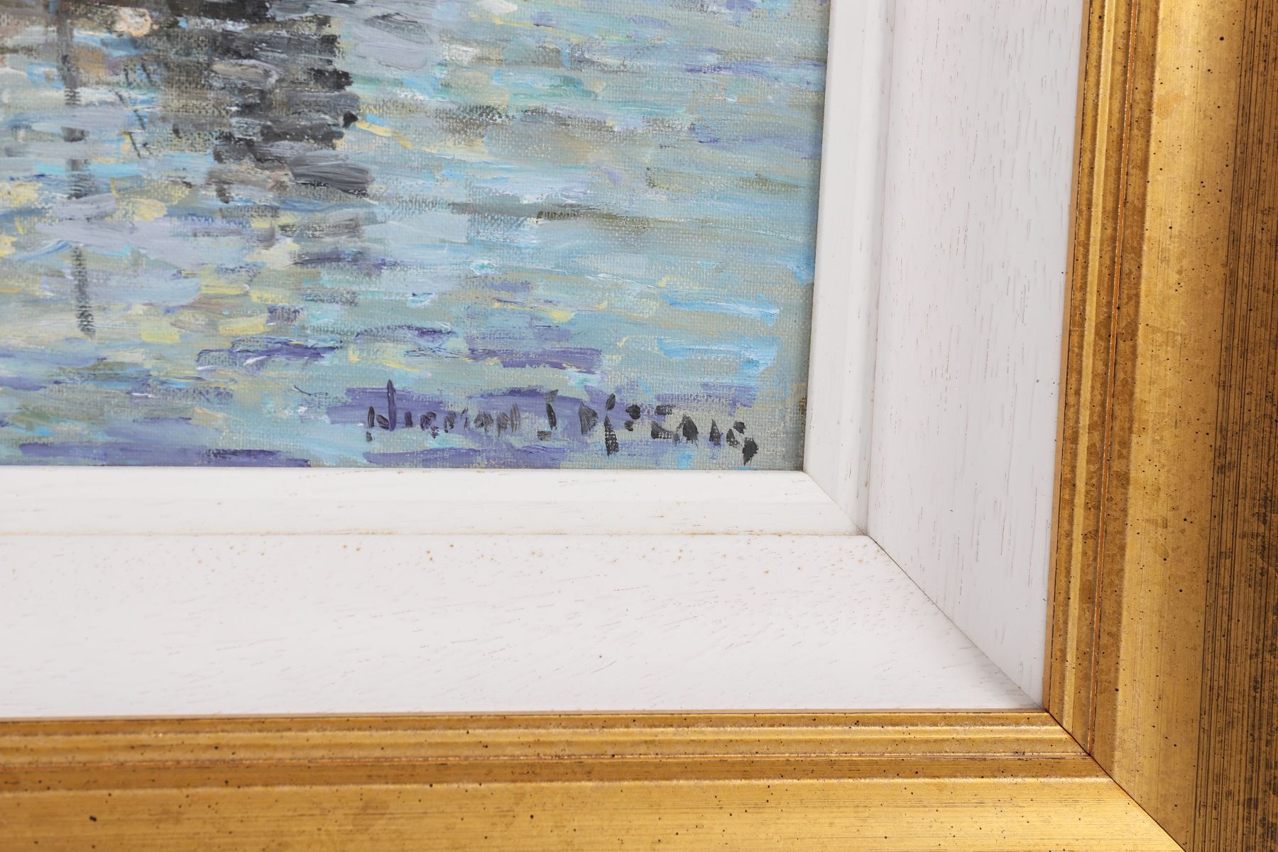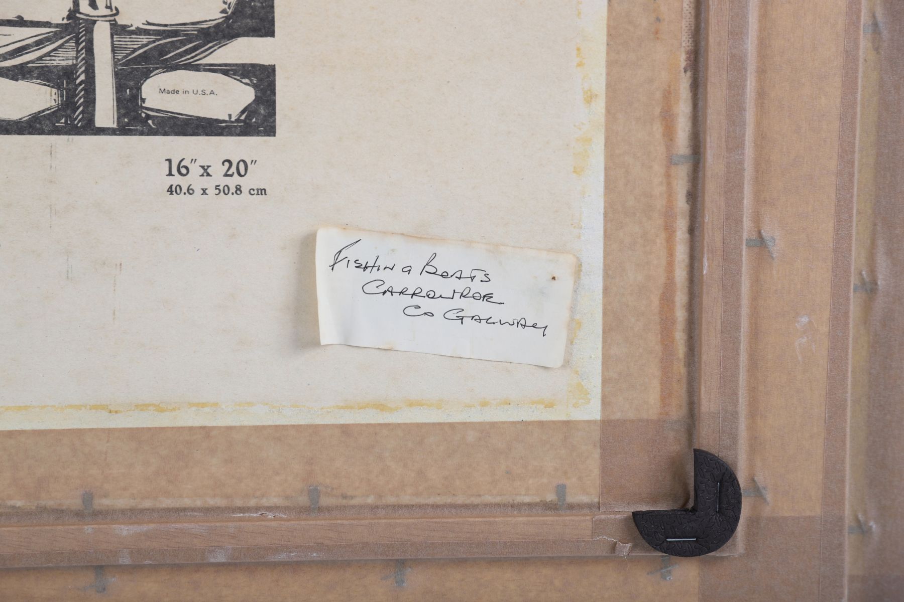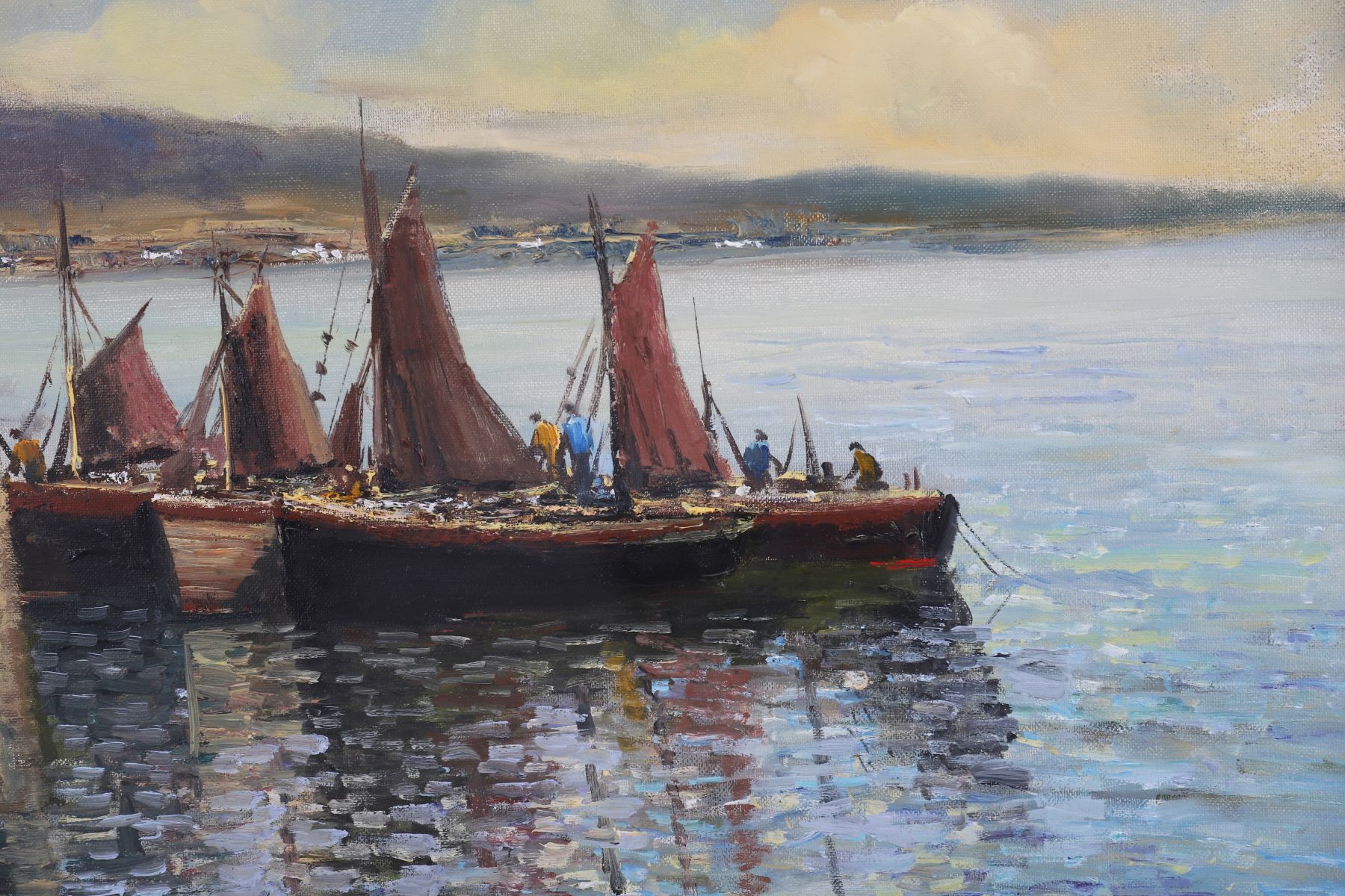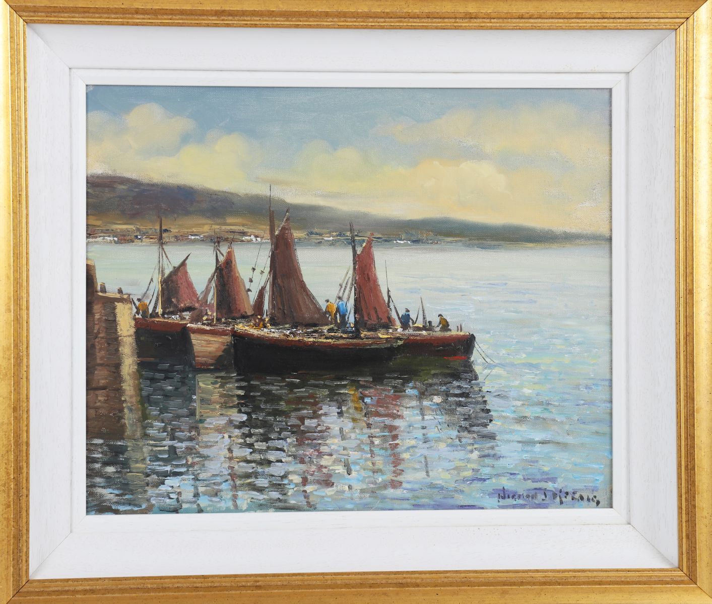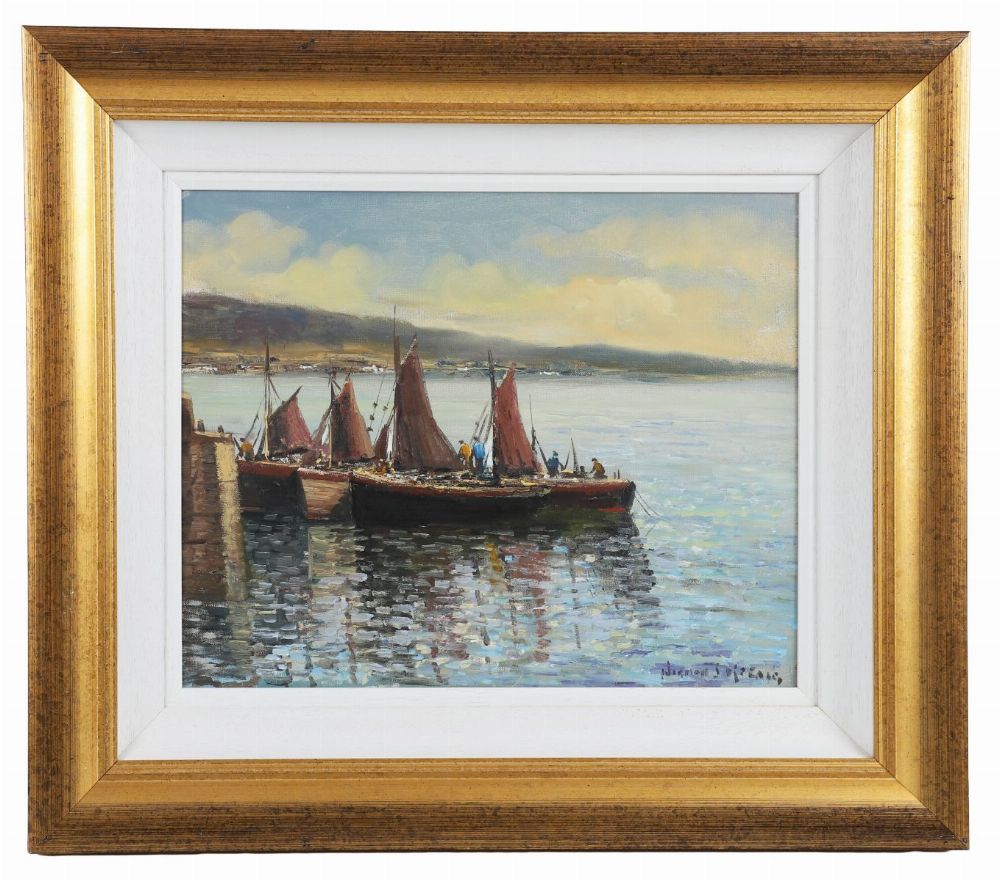 A bright coastal scene showing traditional boats moored along a pier, with distant mountains and gently clouded sky. The reflective water and lively palette showcase McCaig’s talent for capturing light on the Irish coast. Signed lower right and framed in gilt with white inner frame.