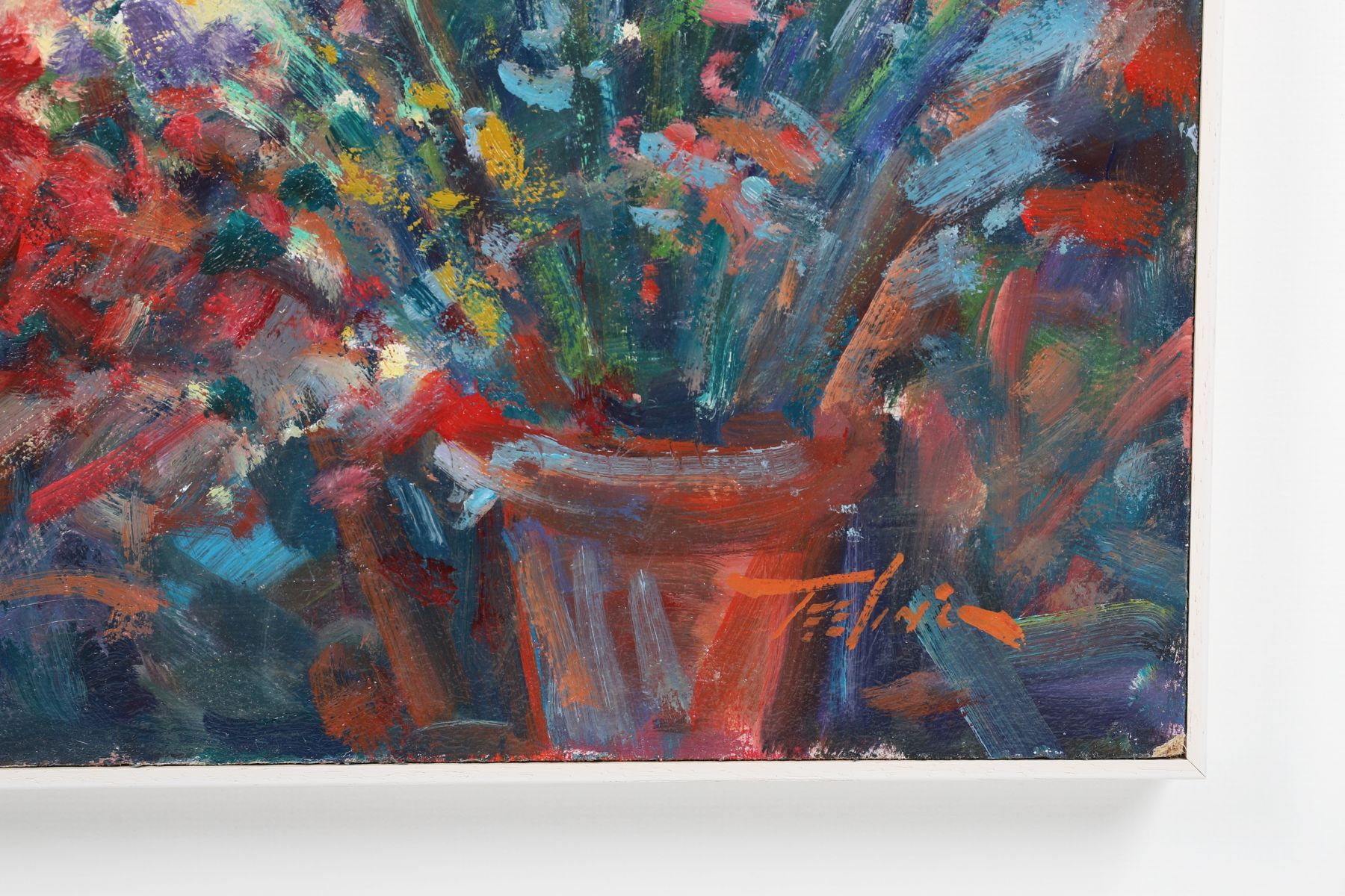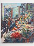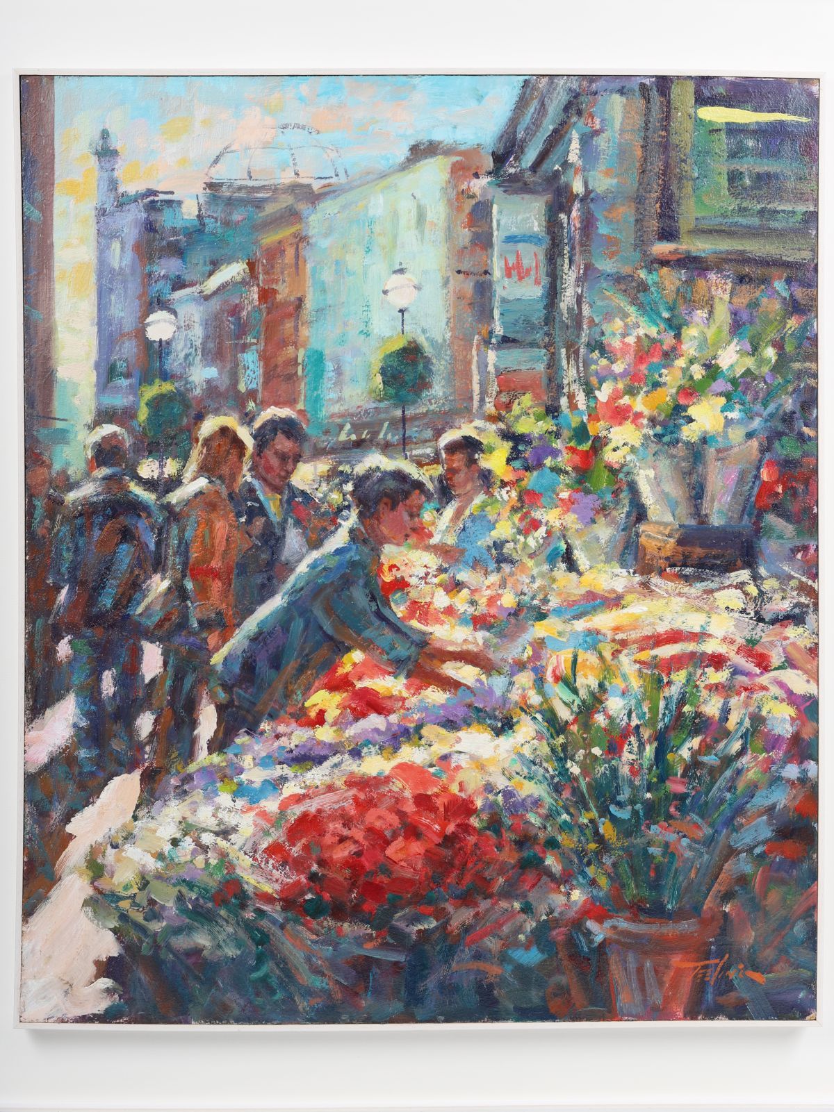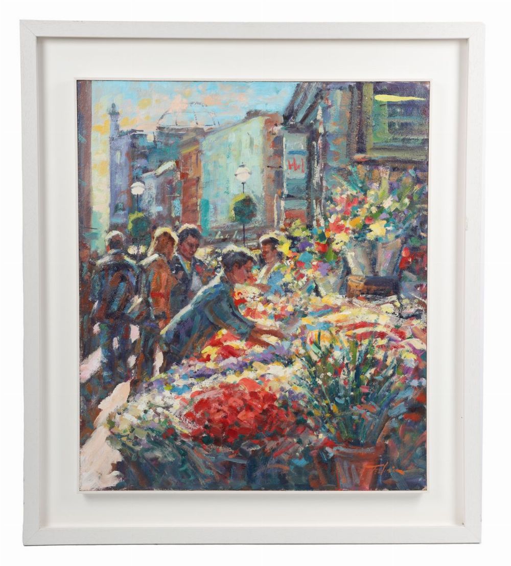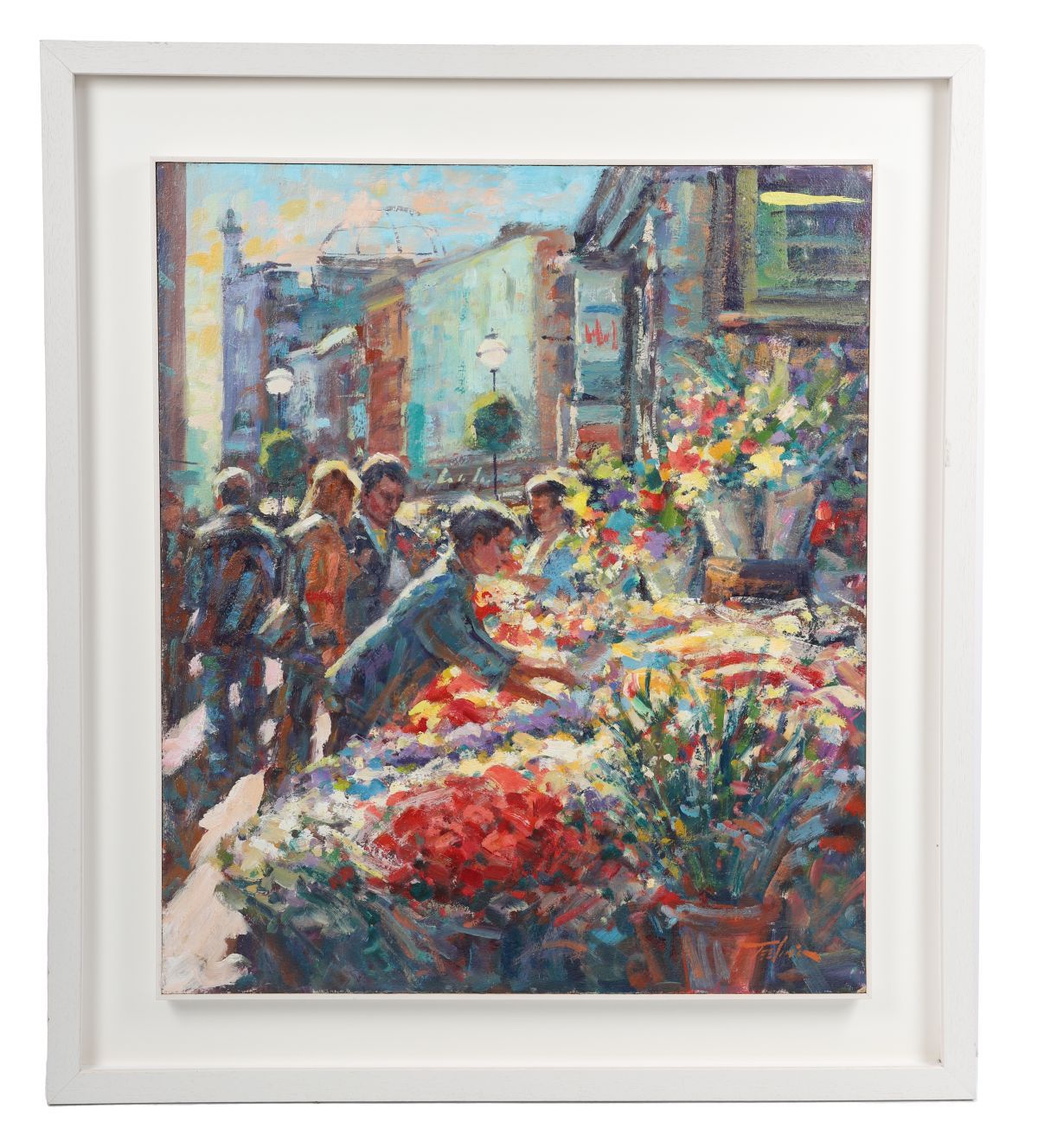 A vibrant Dublin street scene depicting flower sellers on Grafton Street, animated with rich colour and loose, confident brushwork. The bustling composition and interplay of sunlight across the figures showcase Teeling’s masterful impressionistic technique.
