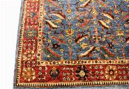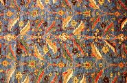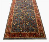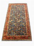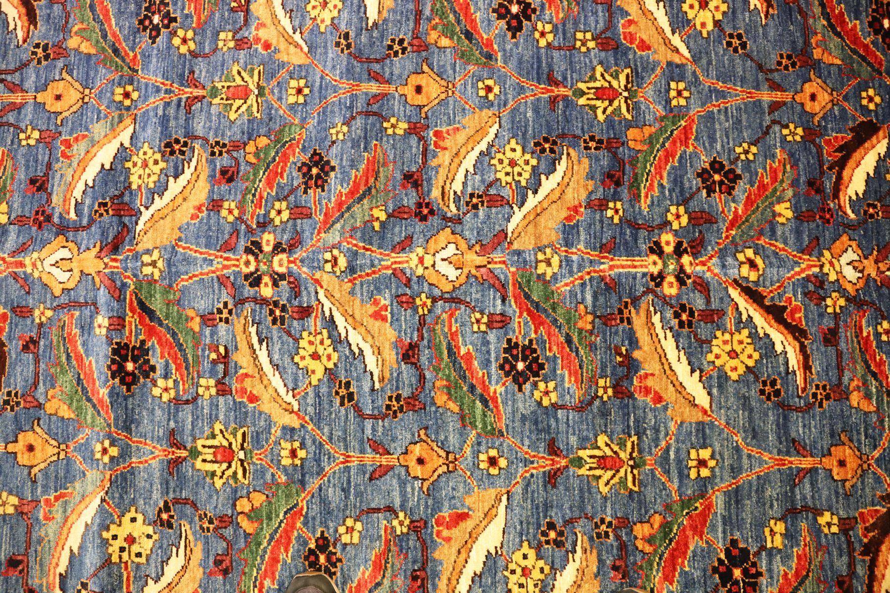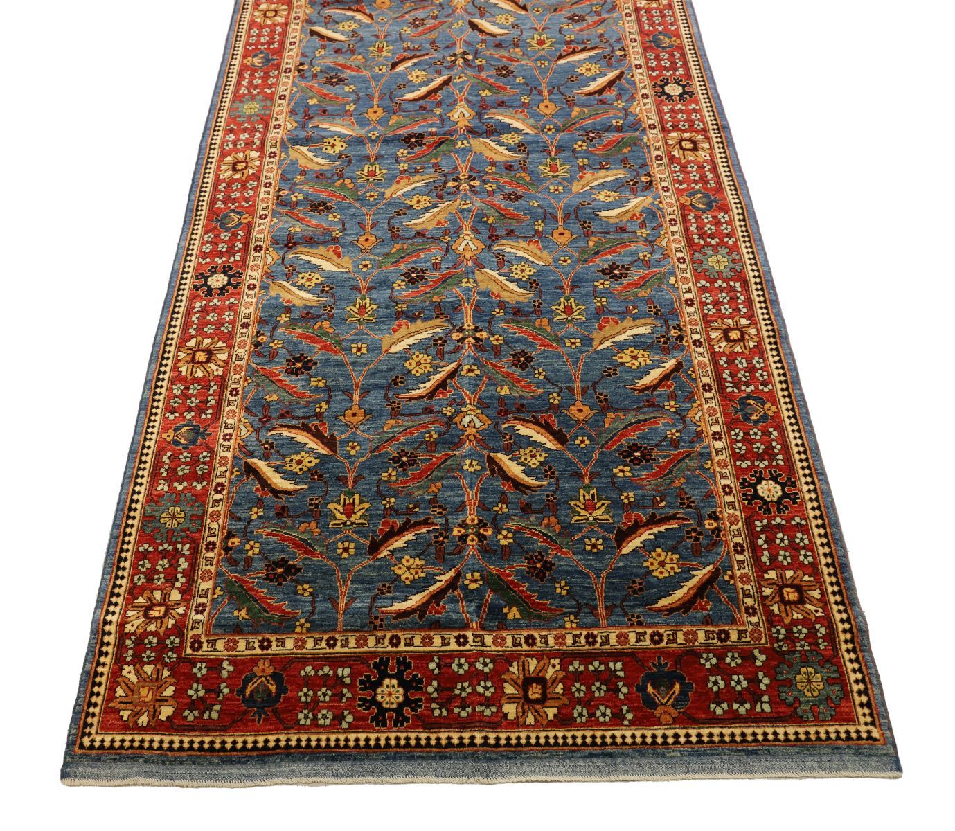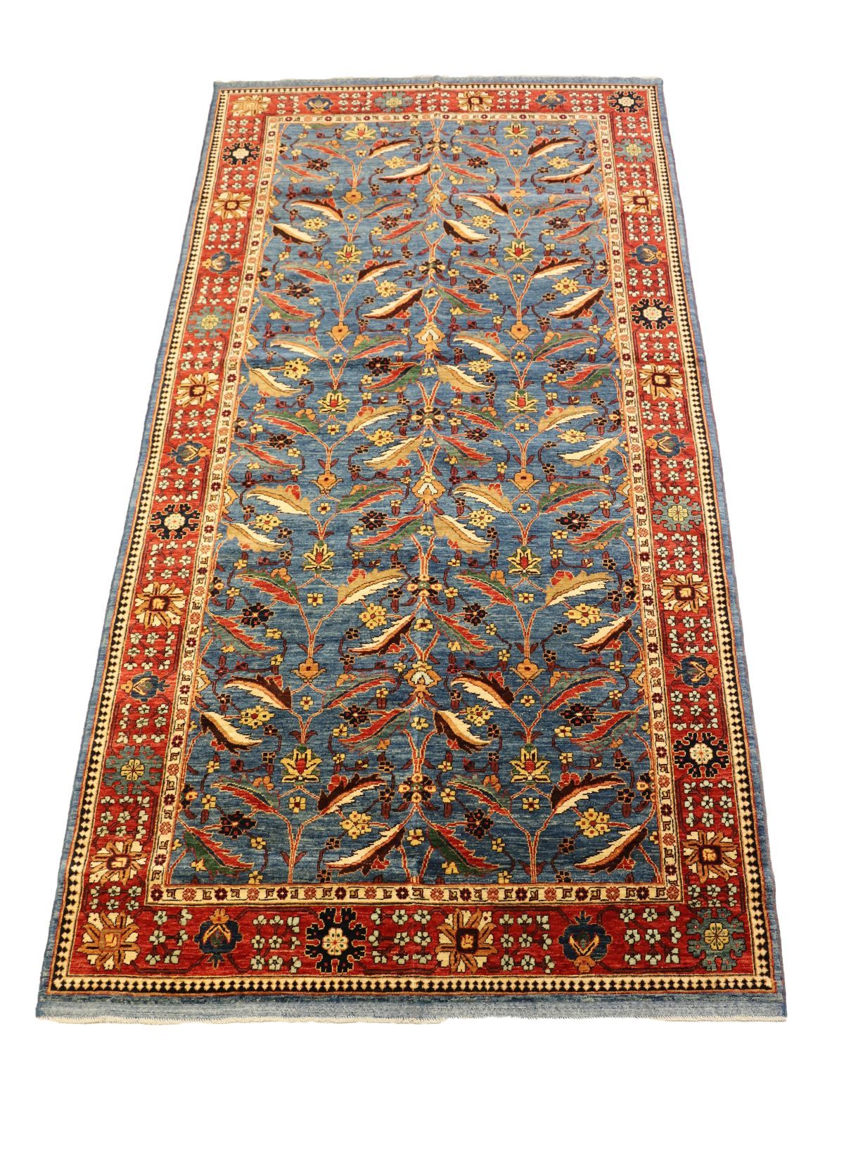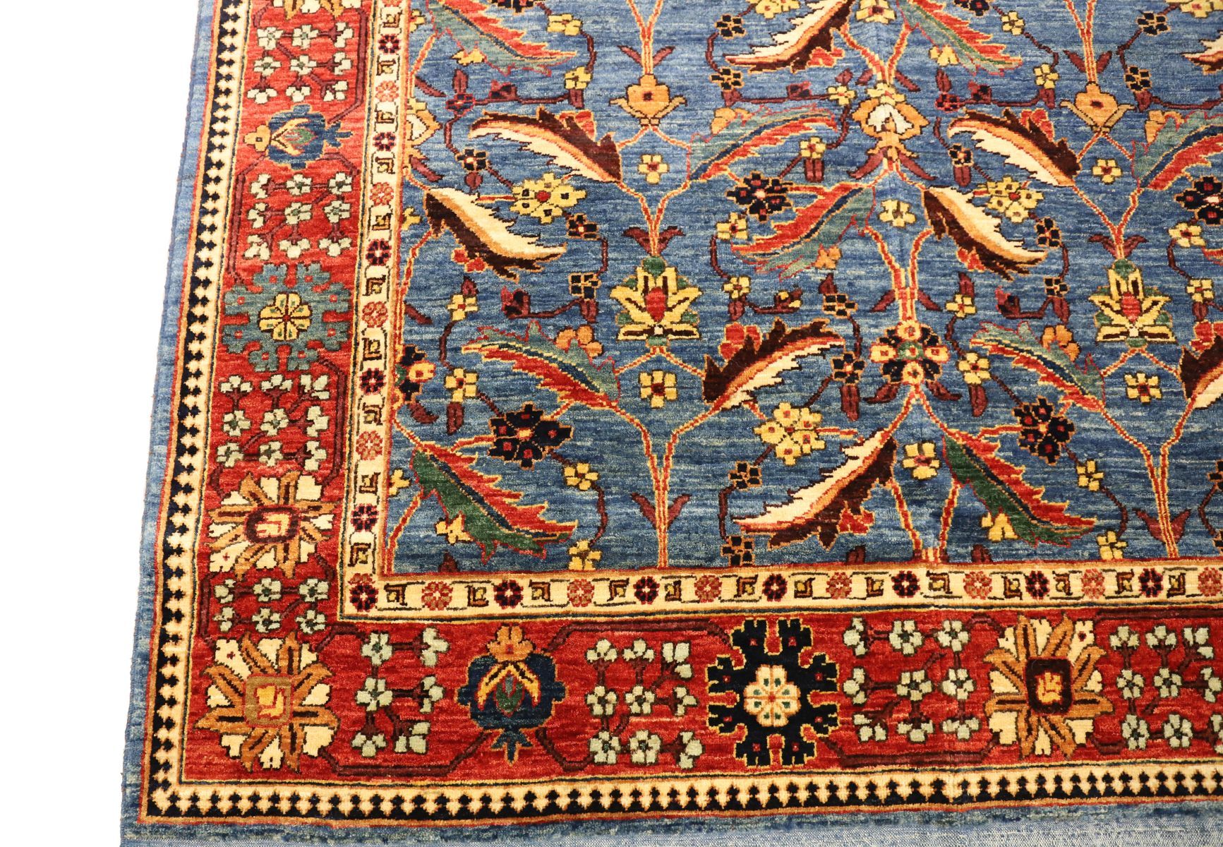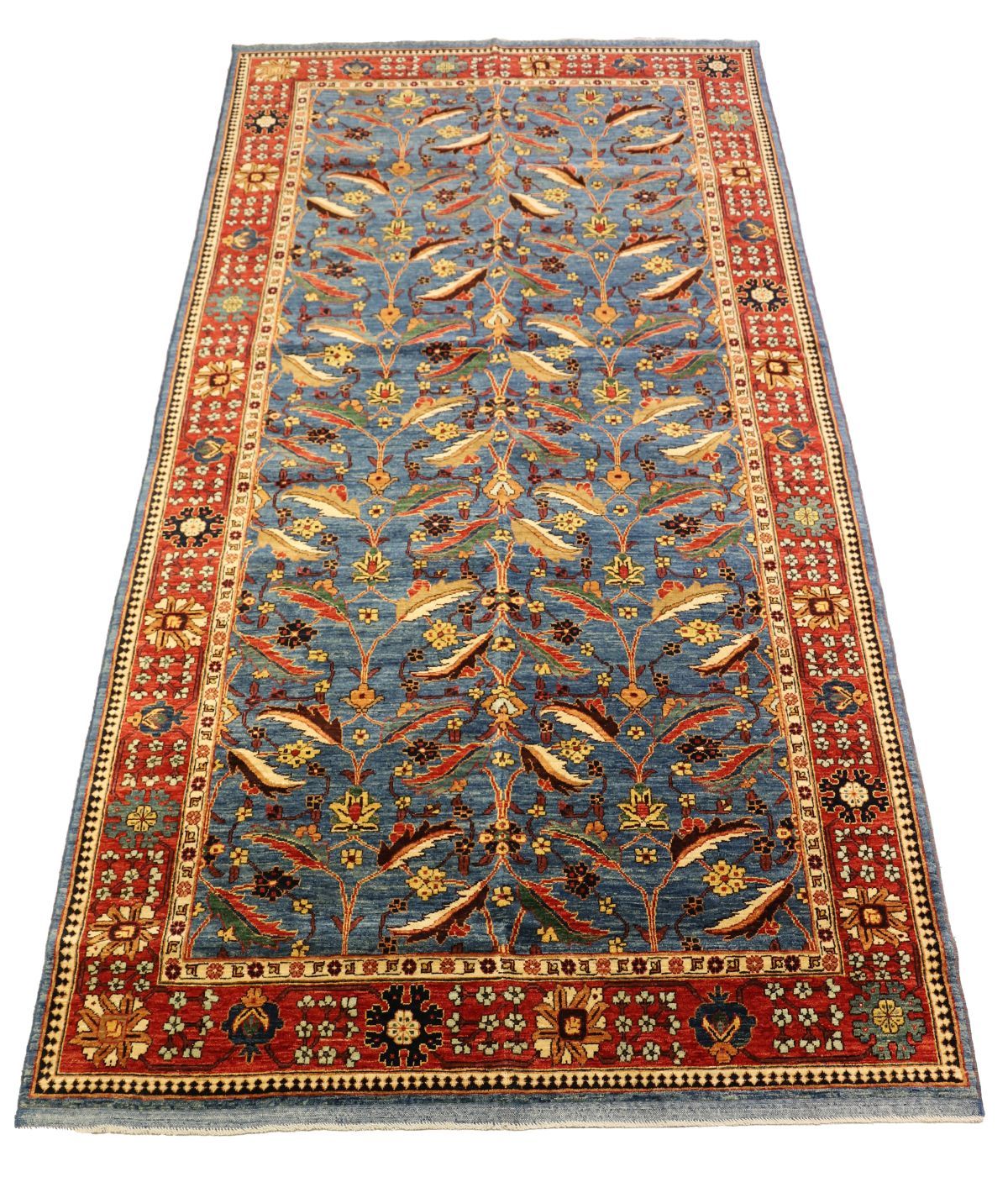the steel-blue field with all-over scrolling floral and foliate design of palmettes, stylised leaves and delicate vine work enclosed within a broad brick-red main border decorated with floral motifs and rosettes, flanked by multiple guard borders.
