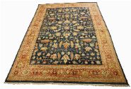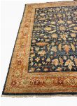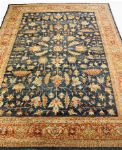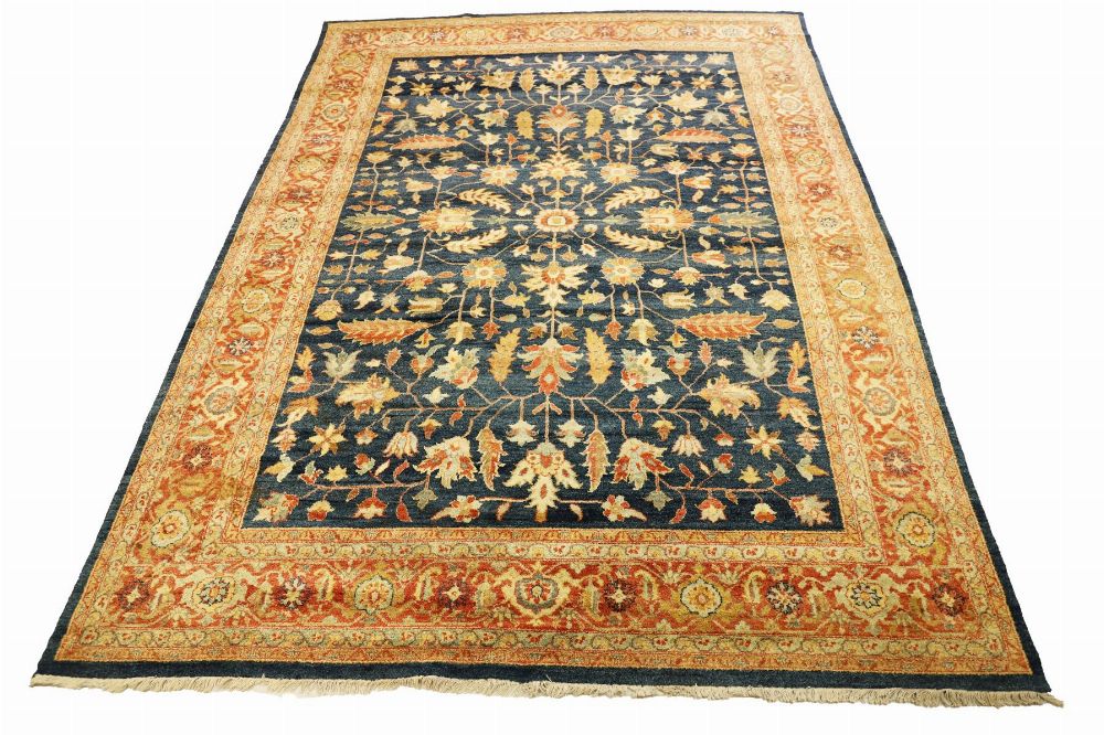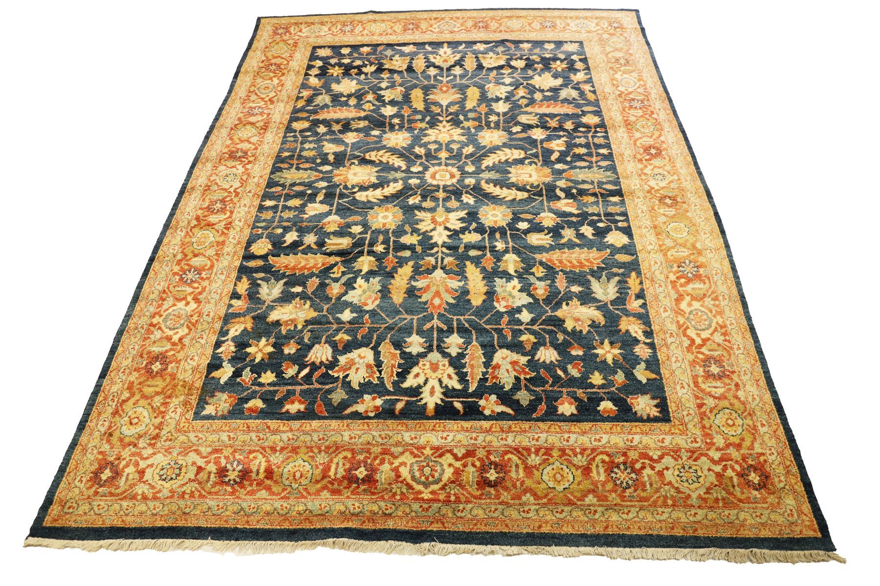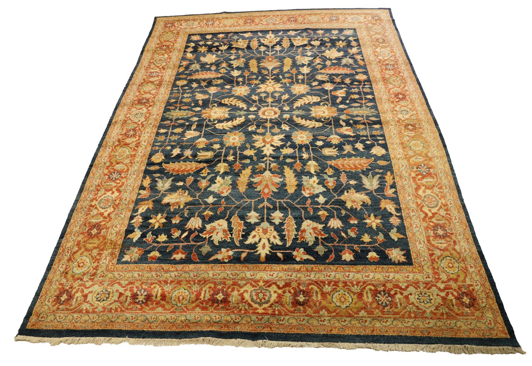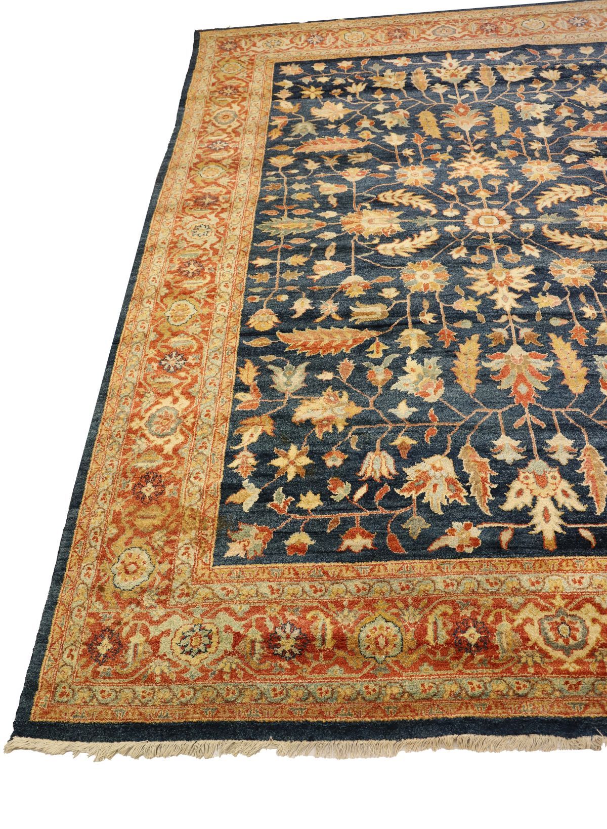 the deep navy ground decorated with a geometrically arranged all-over scrolling floral design of stylised palmettes, rosettes and leafy vine work, enclosed by a main red border decorated with continuous floral motifs and flanked by narrow navy guard borders.