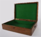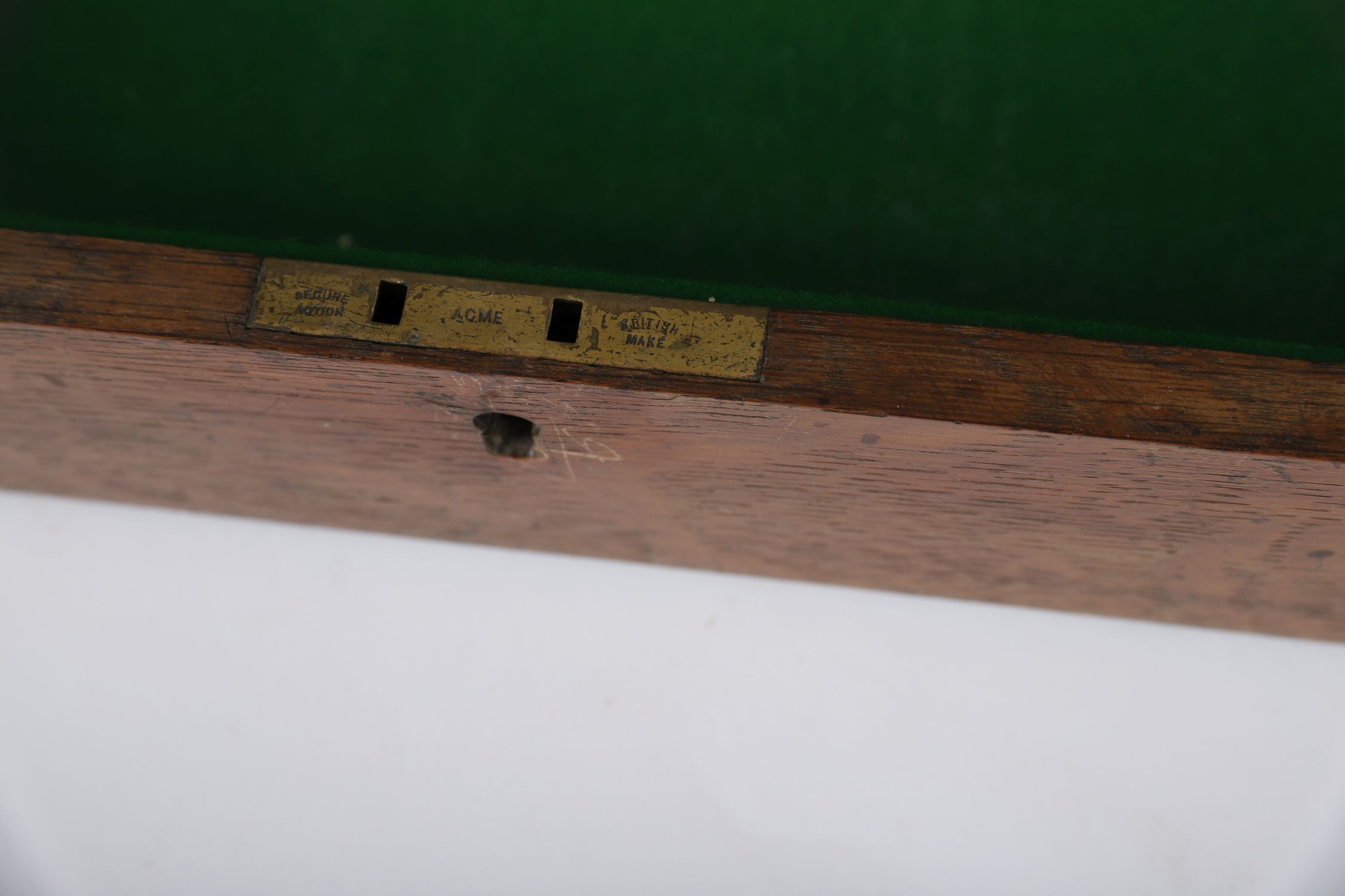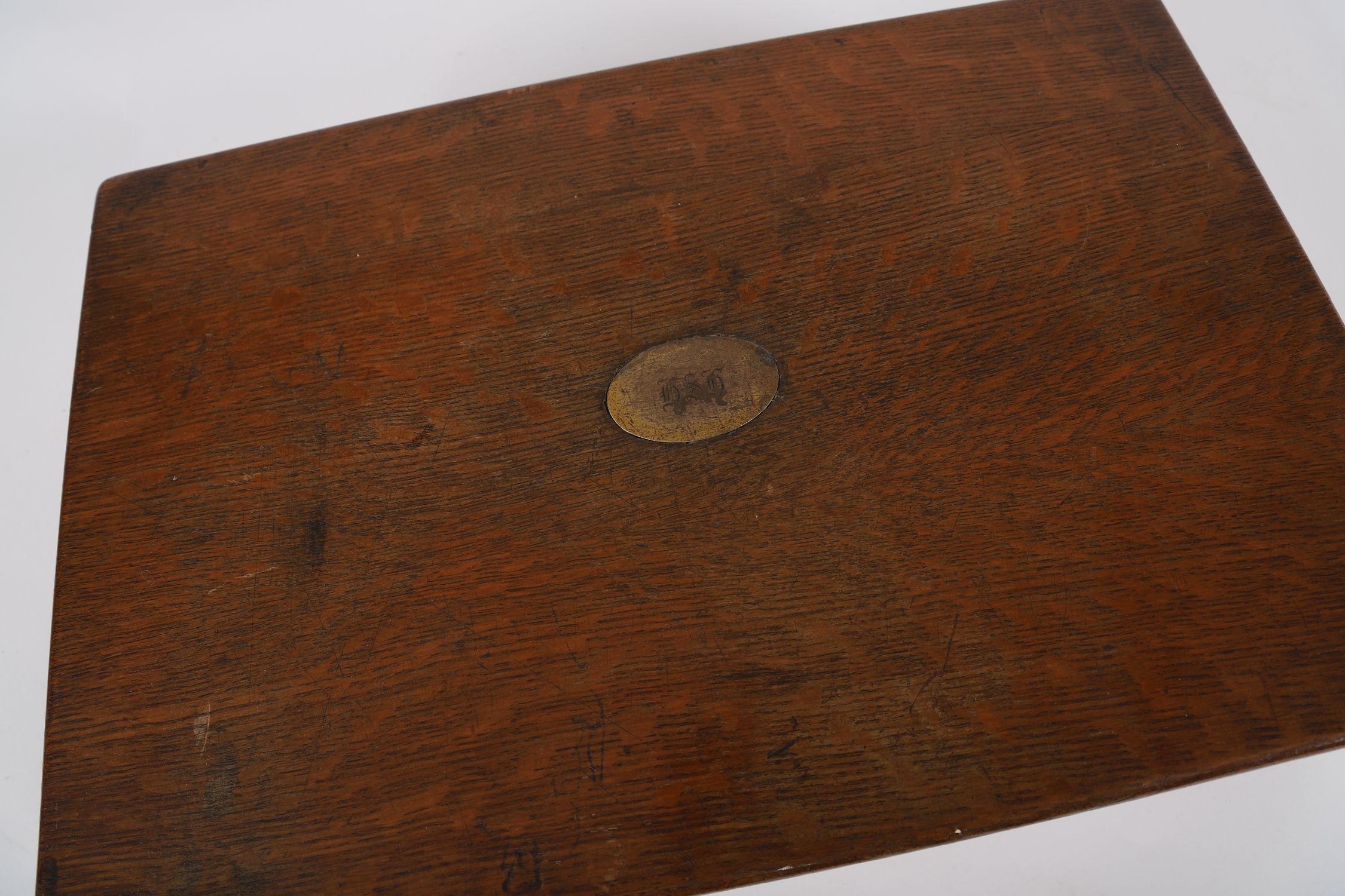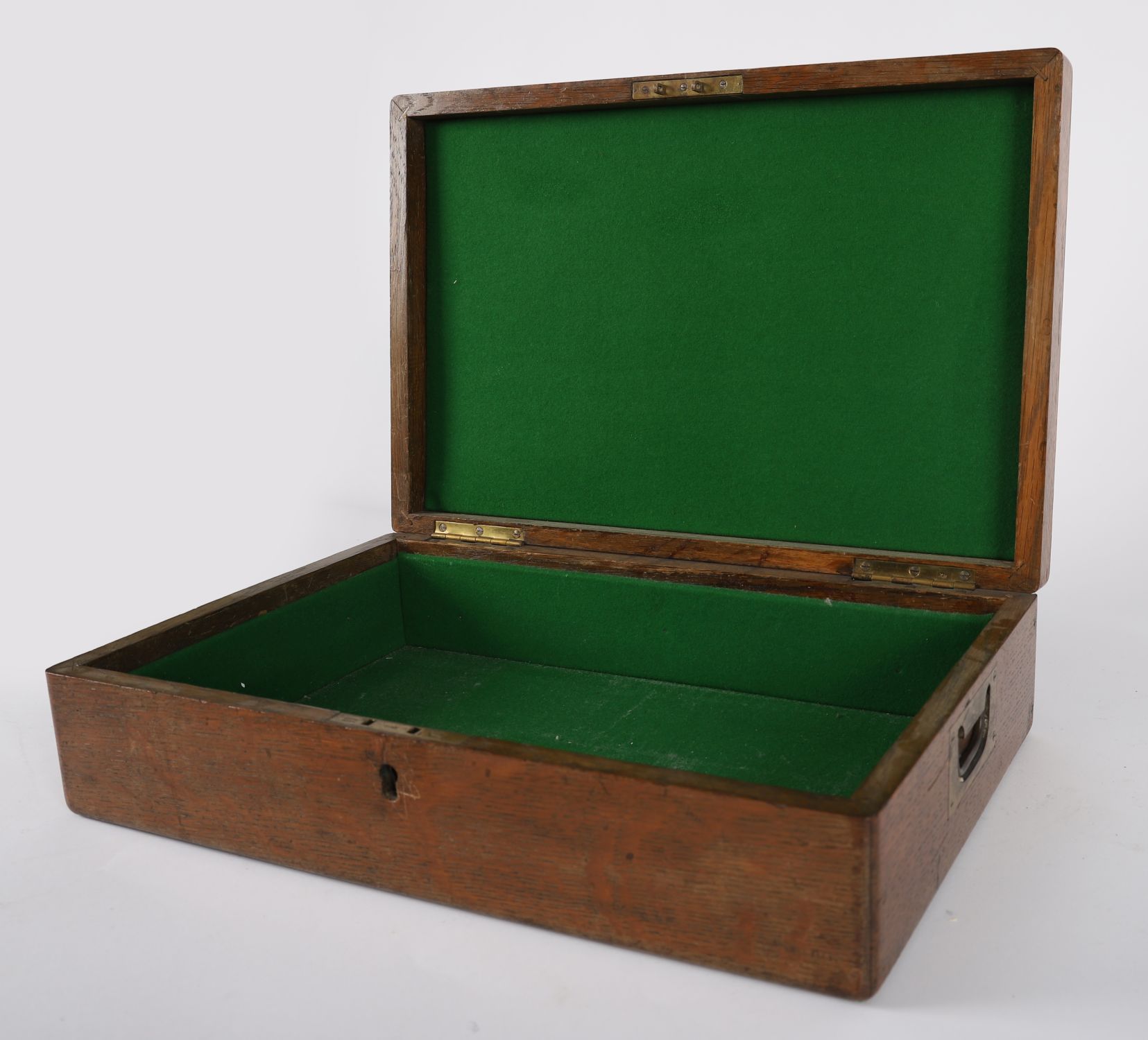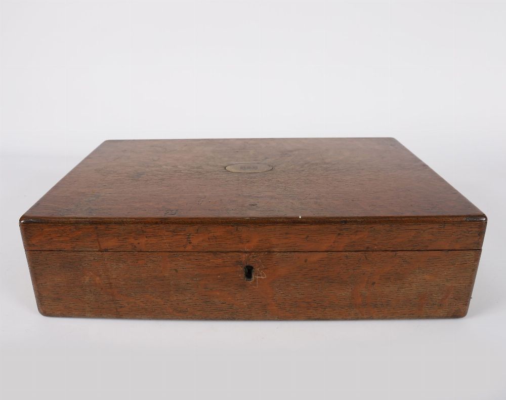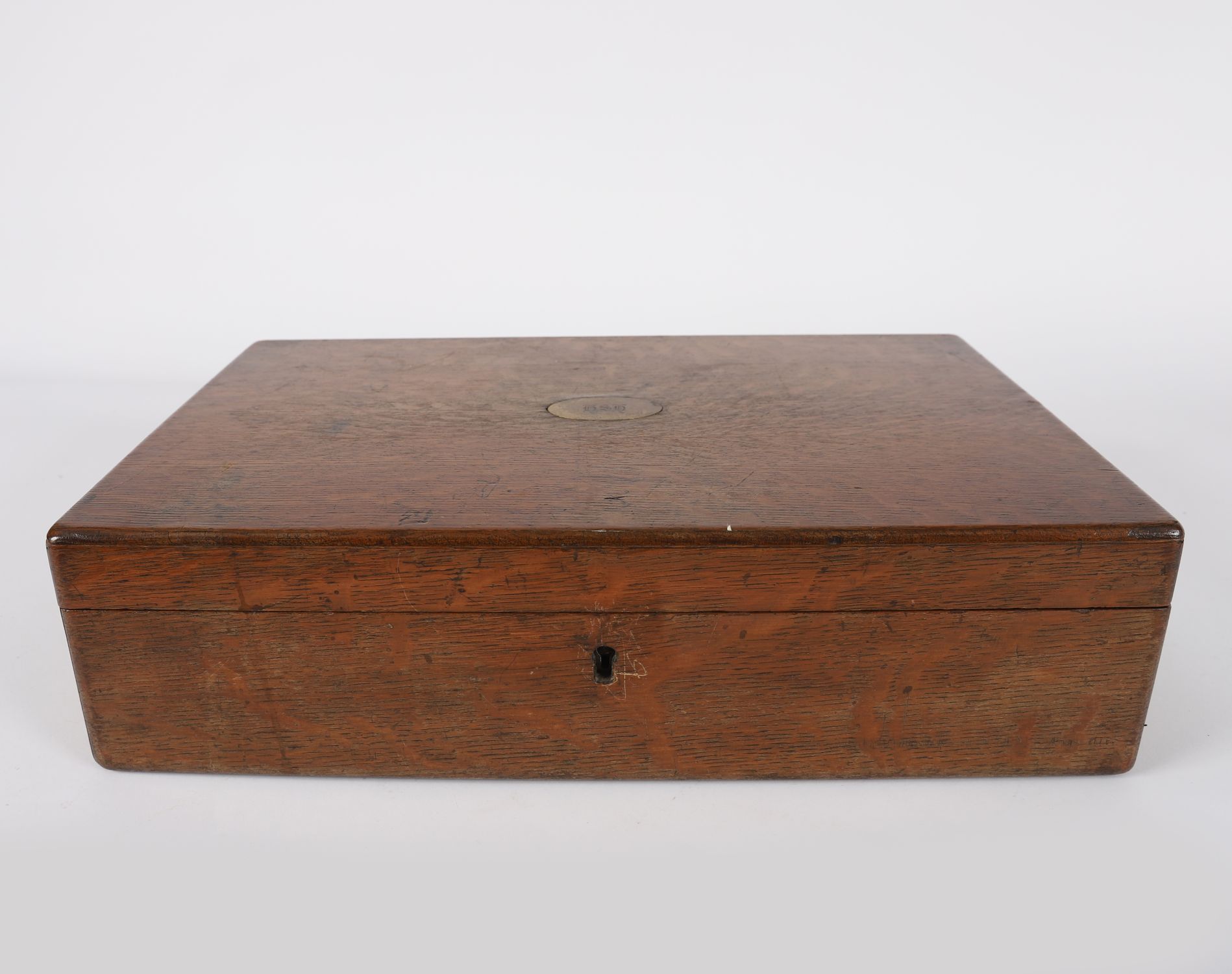 An Edwardian oak cutlery or flatware box with hinged lid and baize-lined fitted interior. The box is plain and functional, with an oval cartouche to the lid and brass escutcheon.