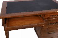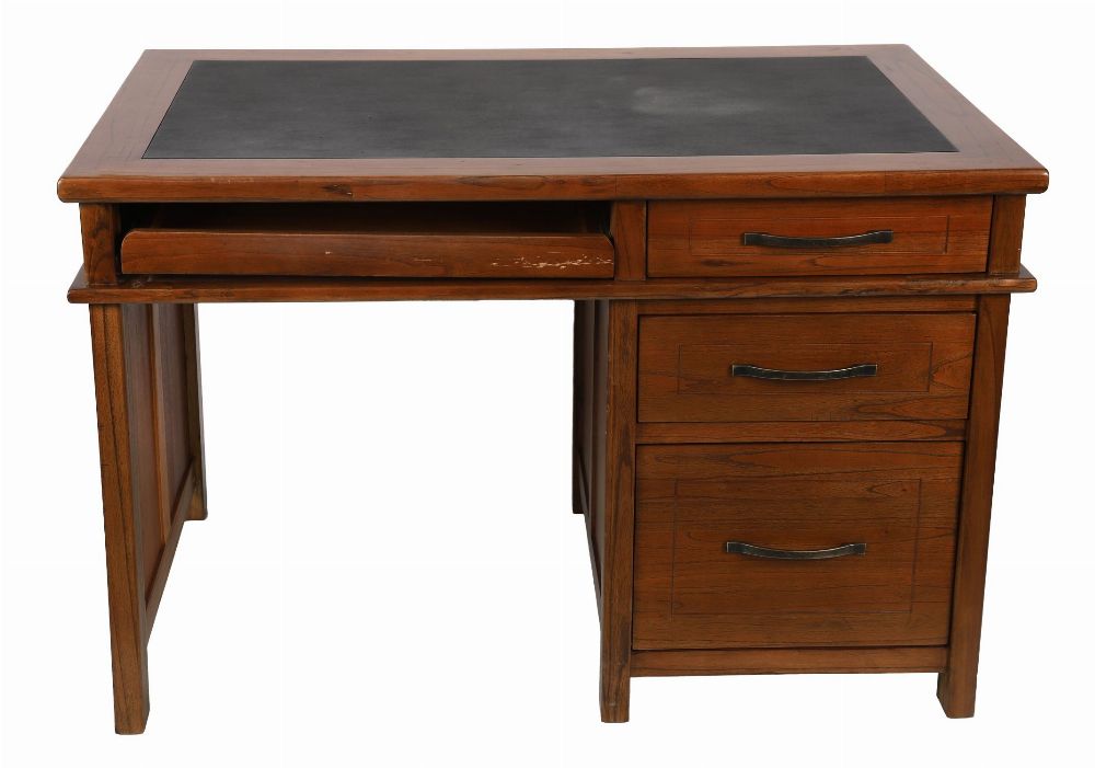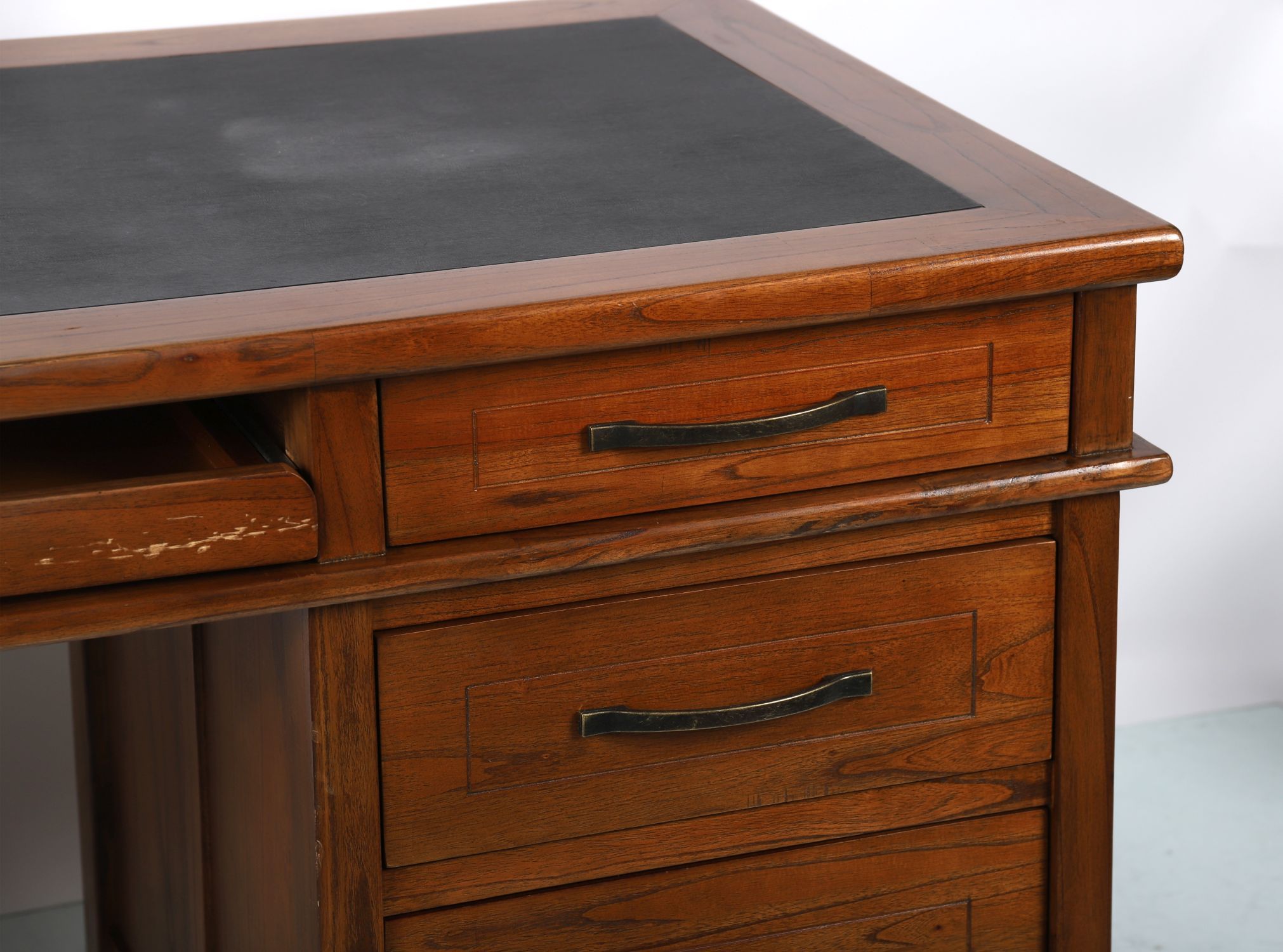 A substantial oak office desk with black leather inset top, fitted with drawers and filing compartments. Solid construction with a classic, practical layout for home or study use.