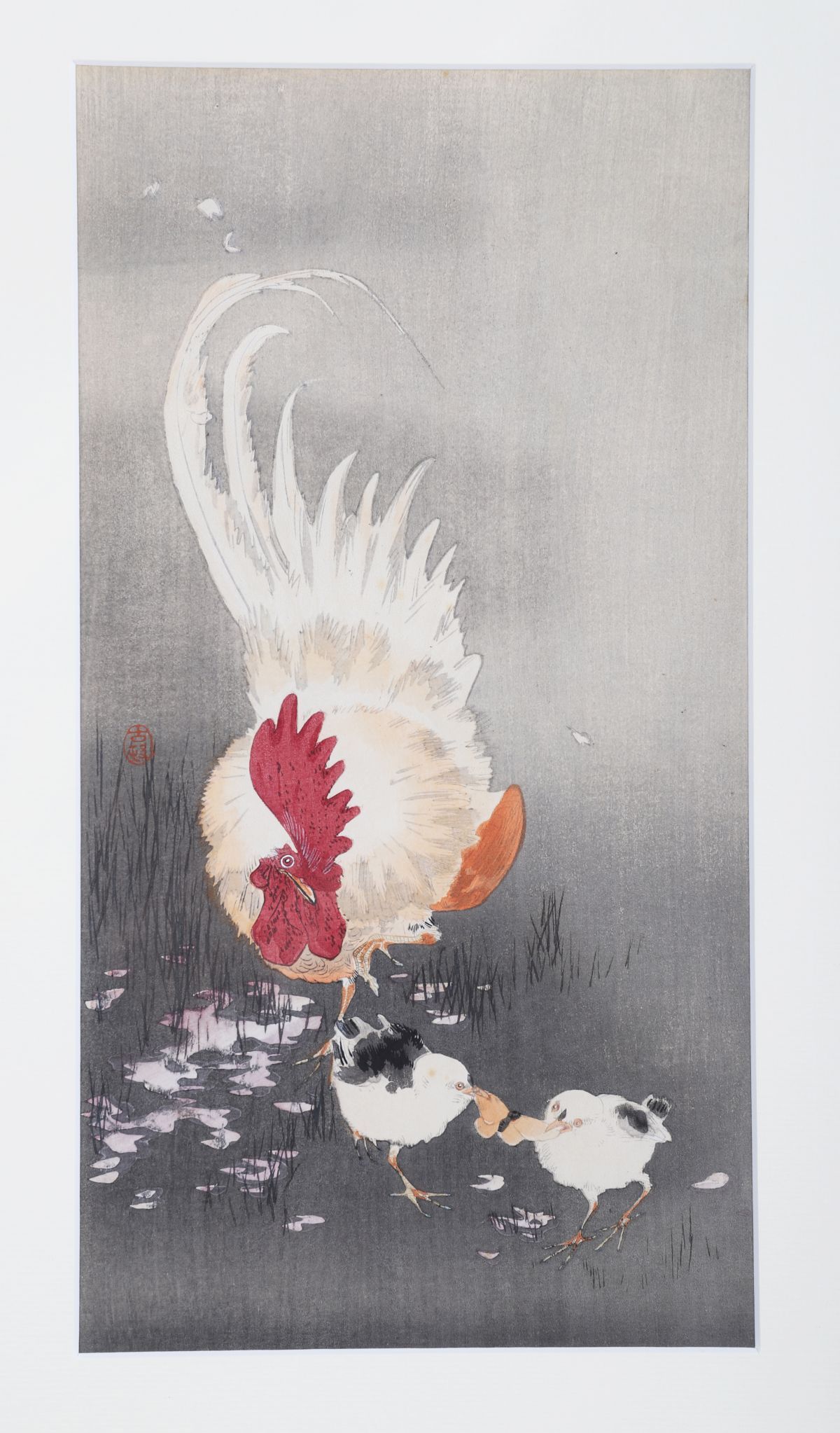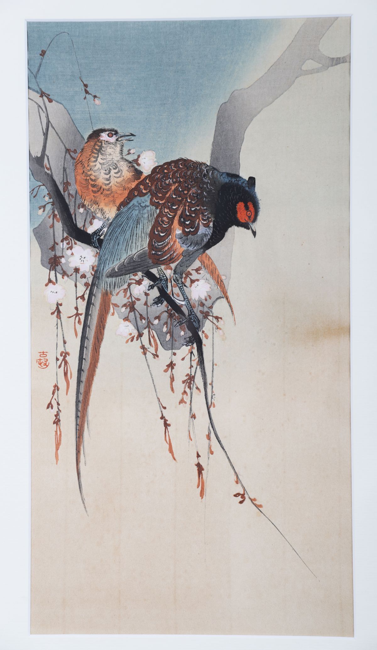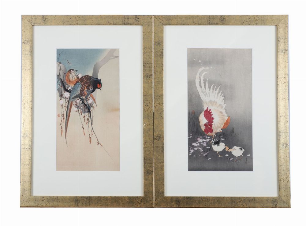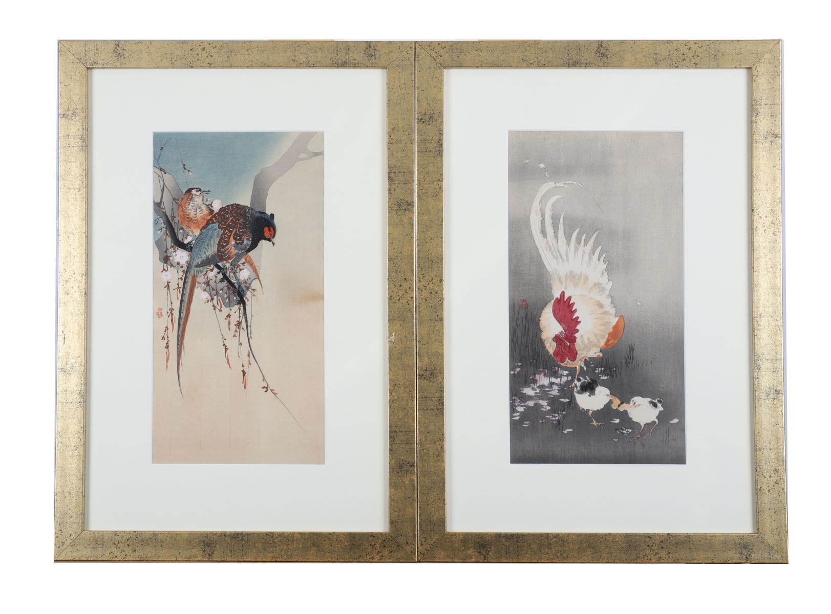 A pair of early 20th-century Japanese woodblock prints by Ohara Koson (Shoson), one depicting a rooster with chicks beneath a flowering branch, the other showing a pair of pheasants perched among plum blossoms. Well-presented within matching cream mounts and gilt frames.