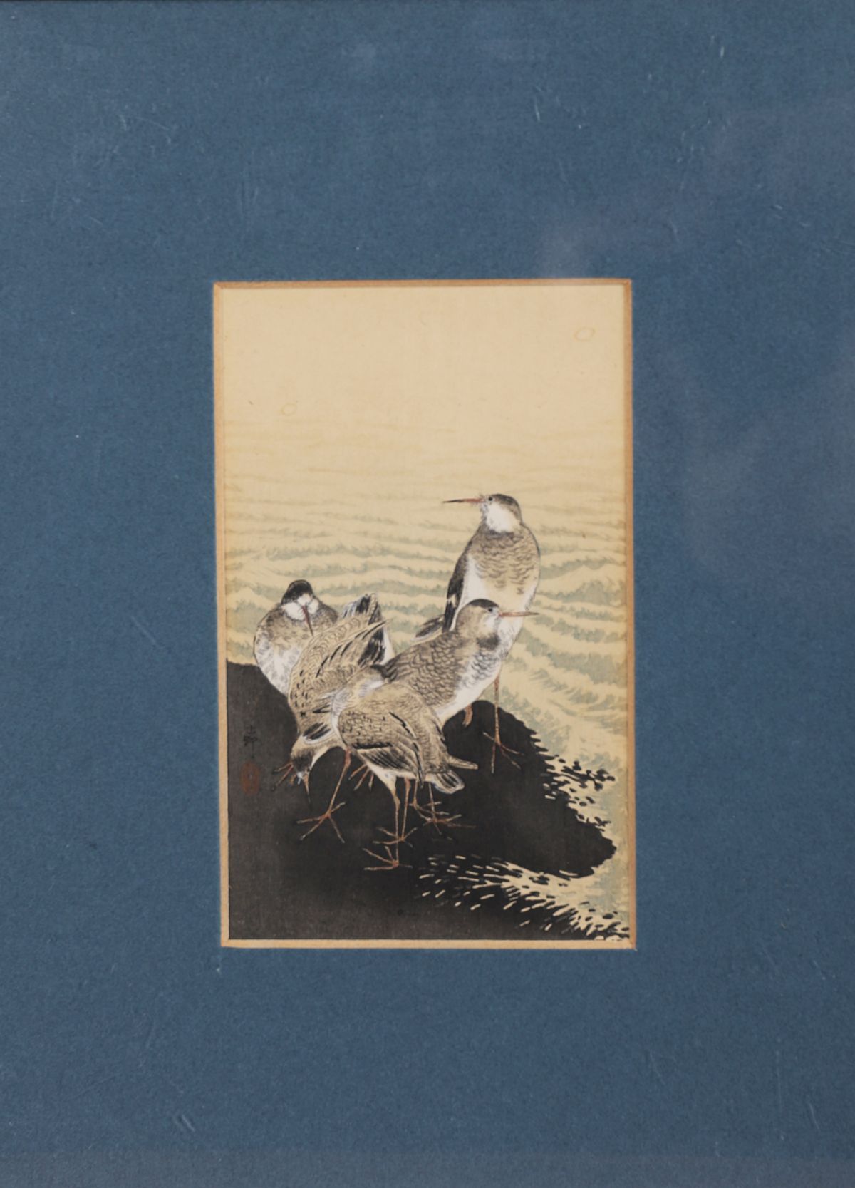 A set of three Japanese woodblock prints by Ohara Koson (Shōson), each depicting birds in natural settings: sandpipers beside rippling water, a lone wader among reeds, and a pair of quail beneath autumn grasses and a full moon. Each print bears the artist’s signature “Koson” (古邨) and red oval seal. Presented in gilt frames with complementary mounts.