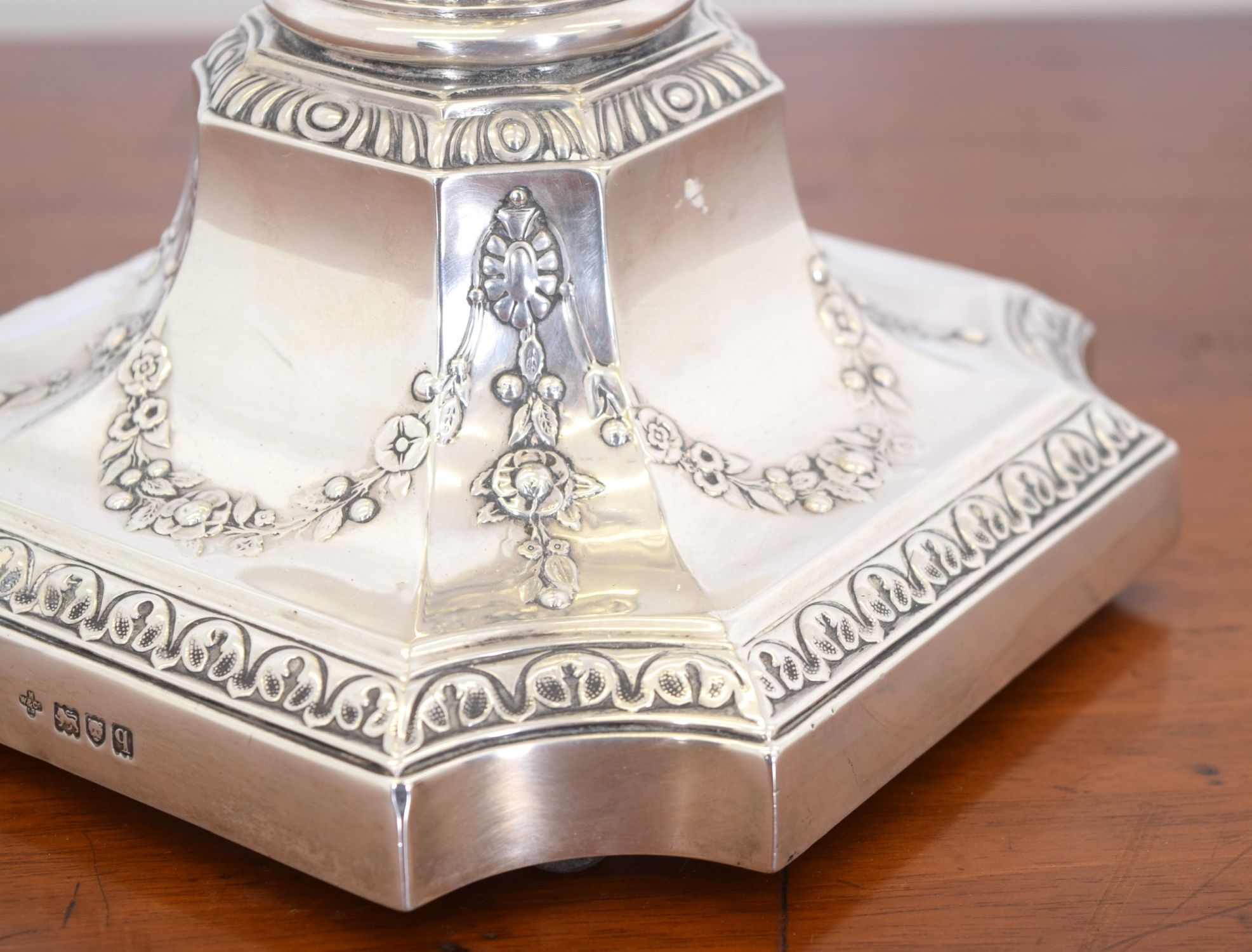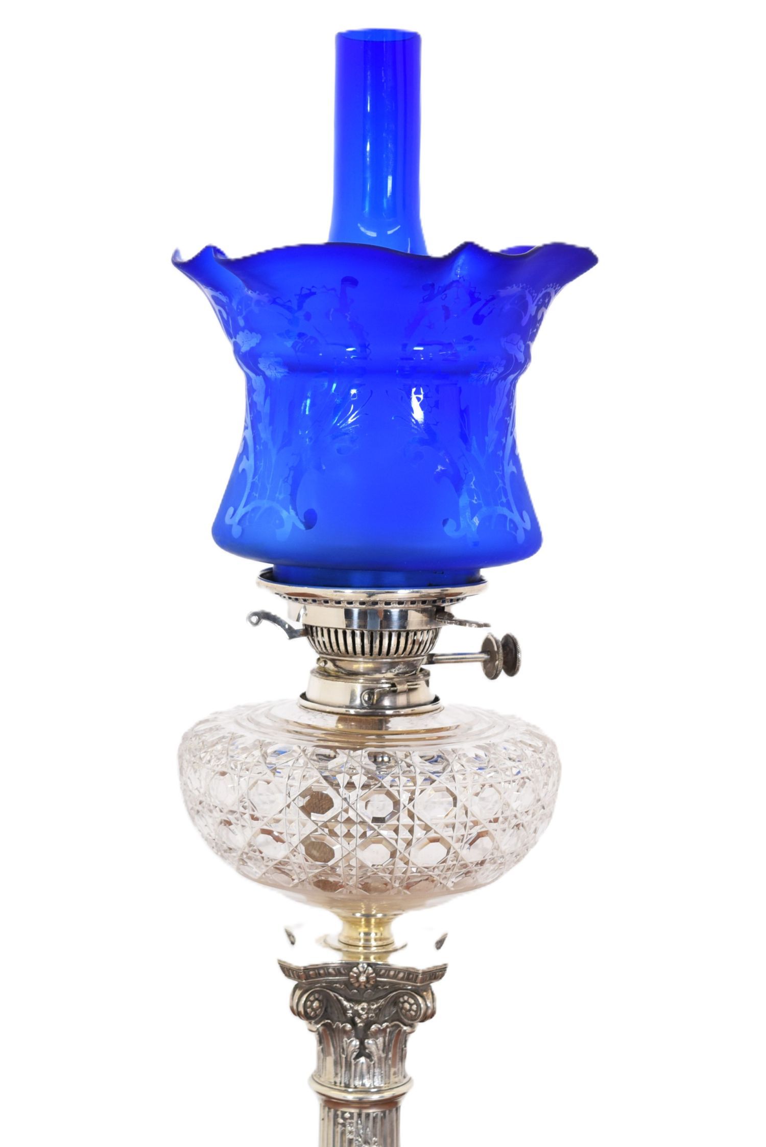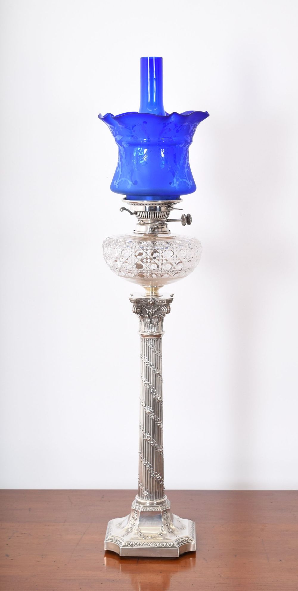 Oil lamp with Corinthian column base in solid silver, octagonal plinth with cast scroll and bead decoration, supporting a cut glass font with diamond pattern, brass burner, and ruffled Bristol blue glass shade.