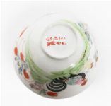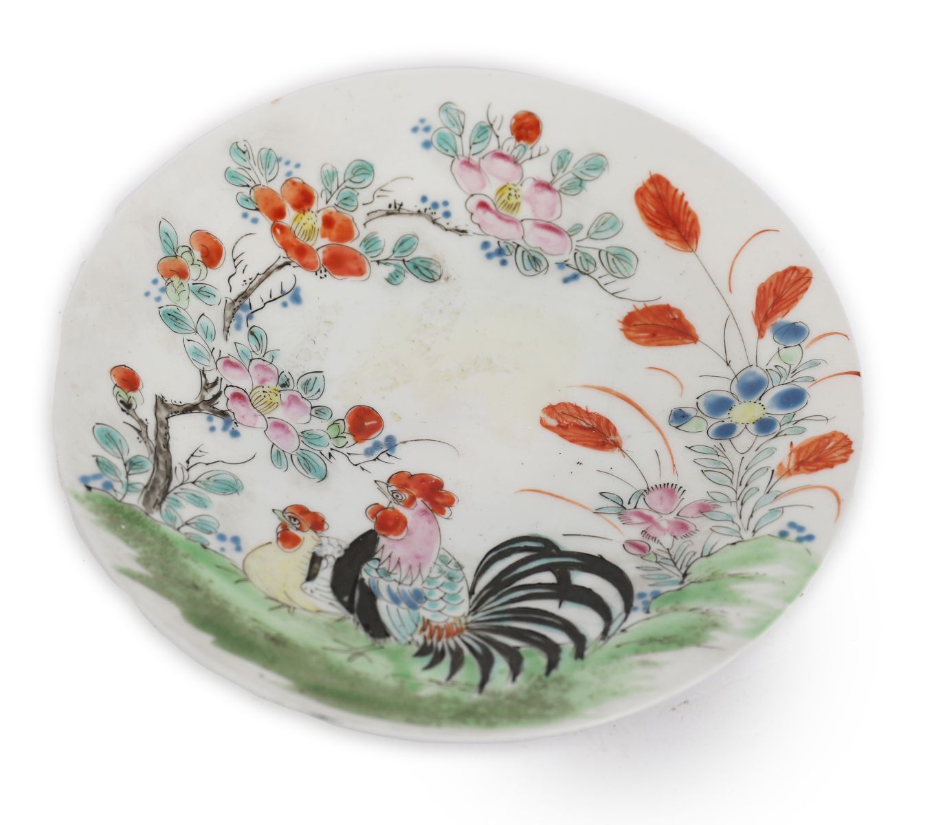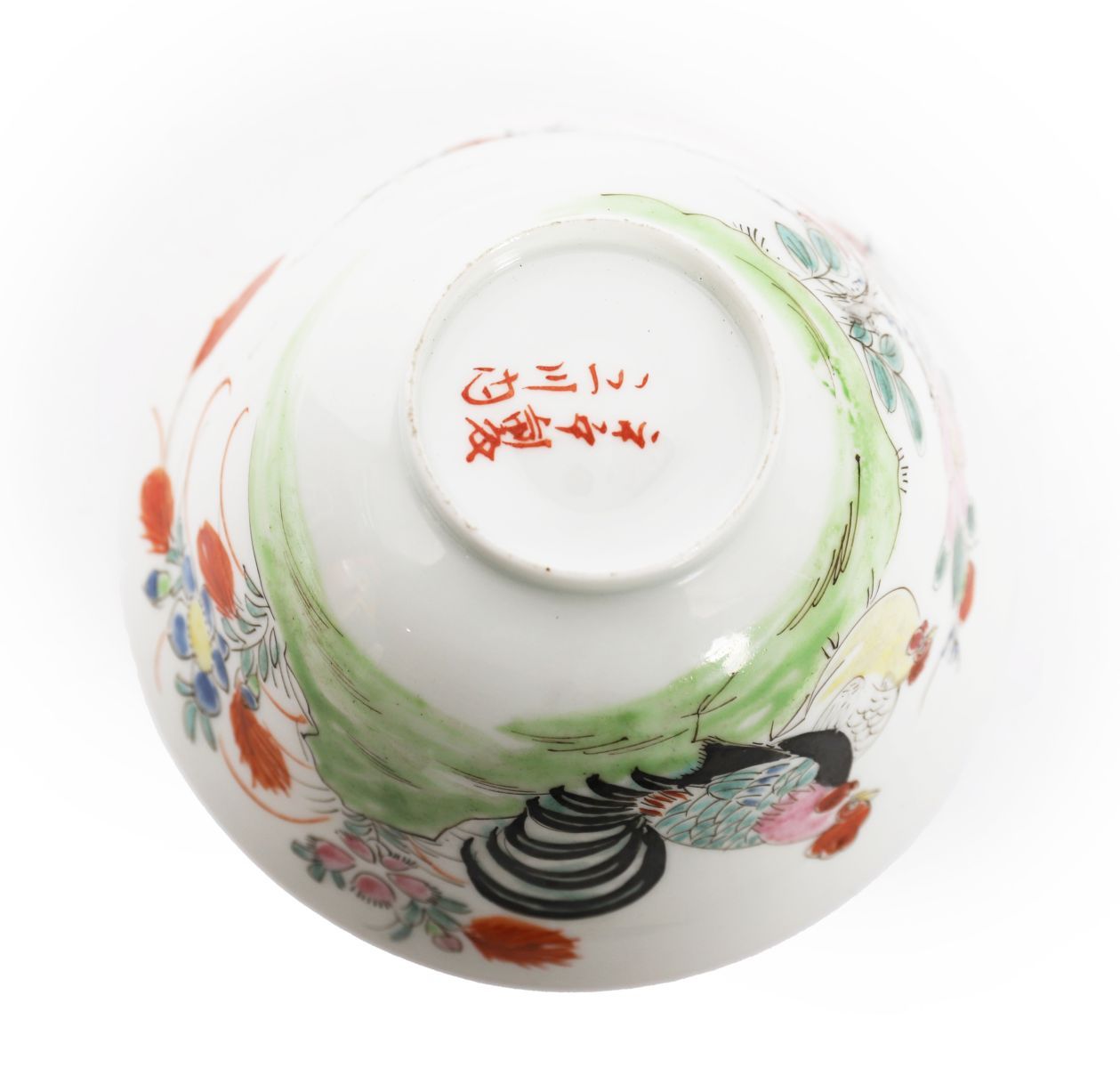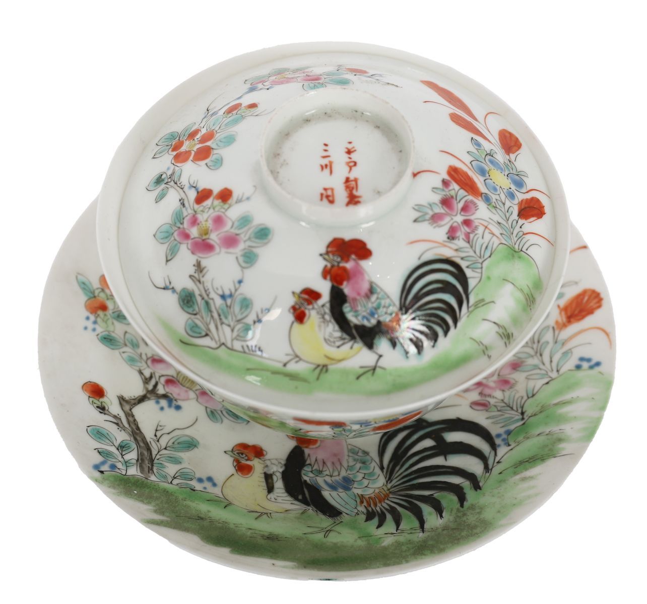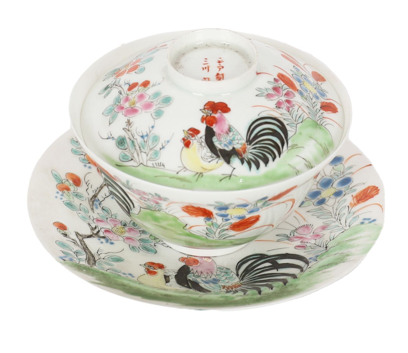 An Oriental porcelain teacup and saucer with cover, decorated with traditional motifs in polychrome enamels.