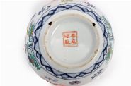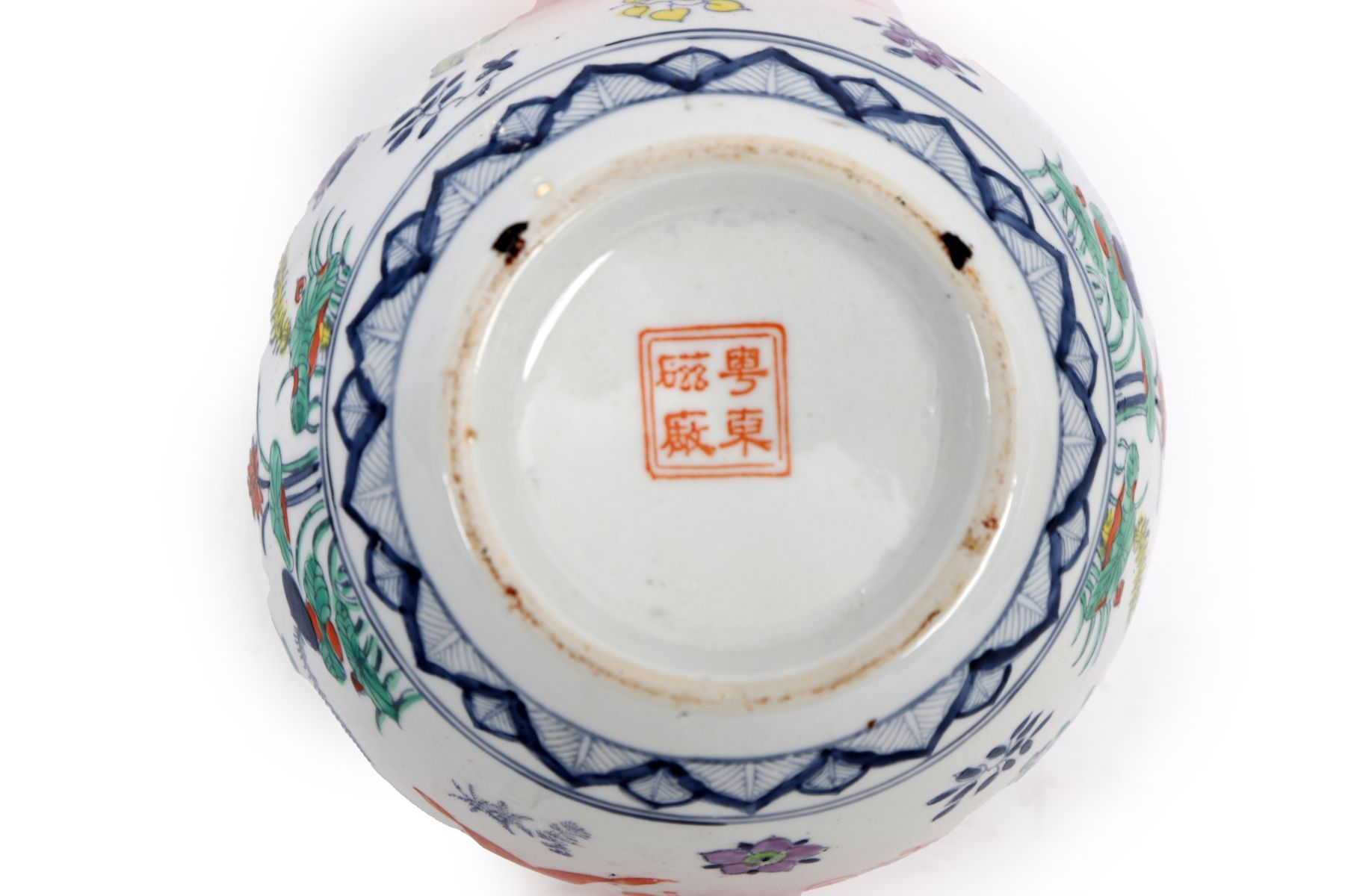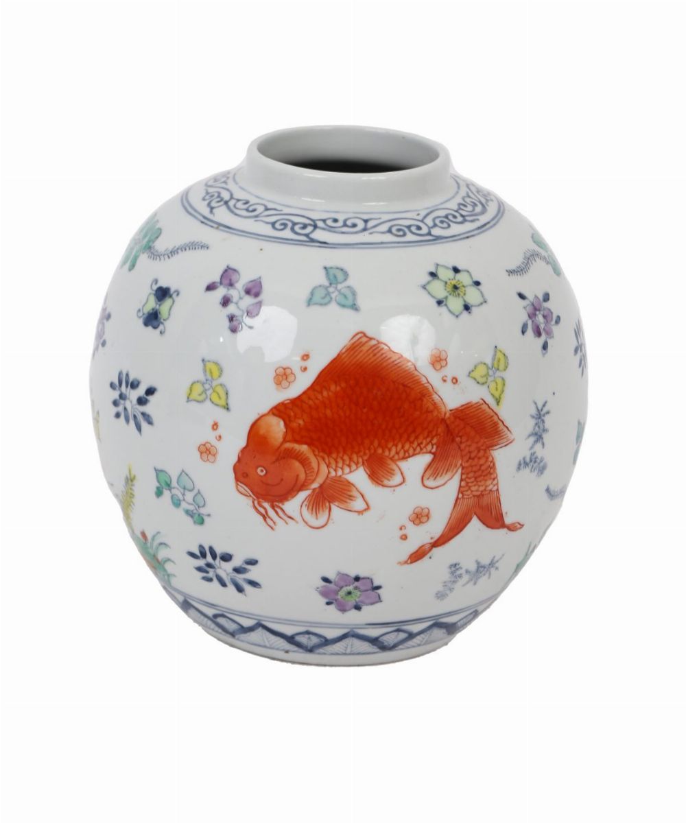 An Oriental porcelain vase of globular form with a short neck, decorated in polychrome enamels with stylised floral motifs, reserved on a white ground.
