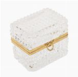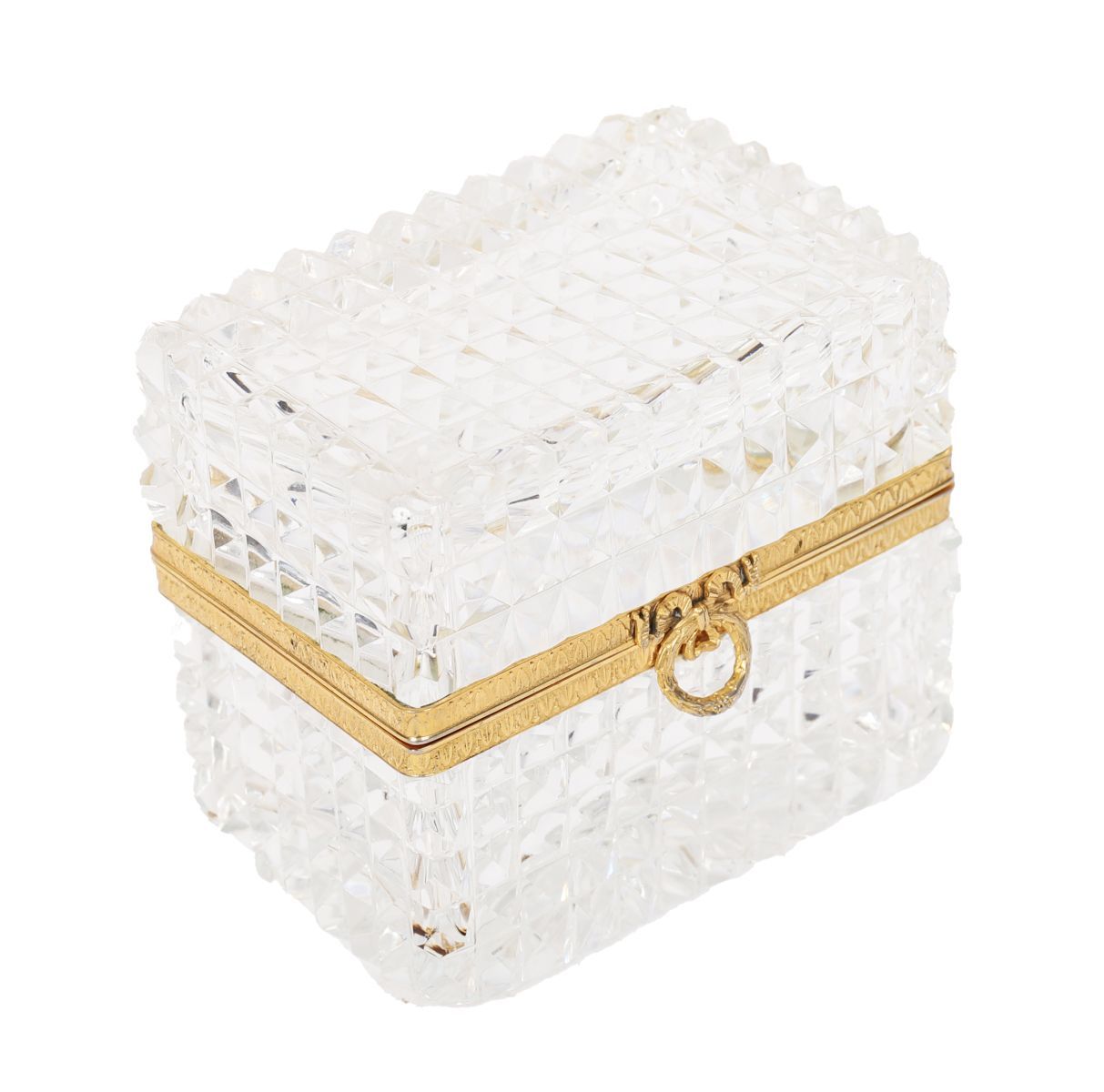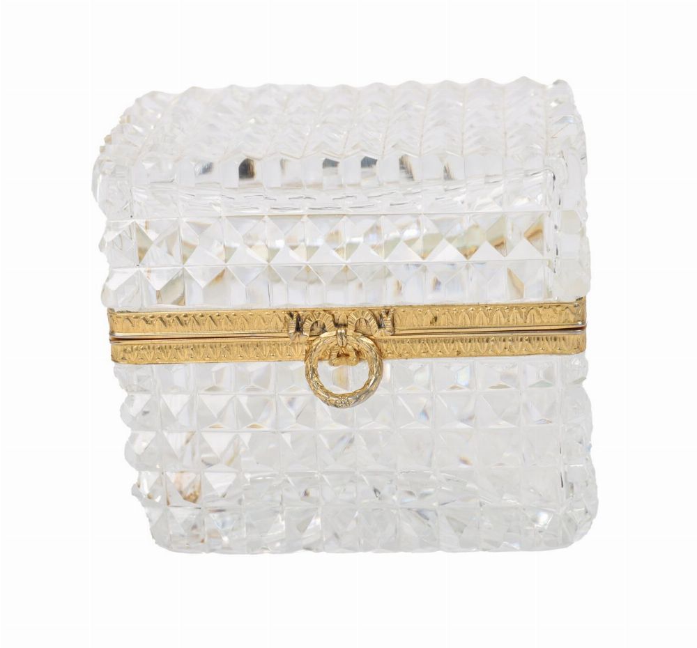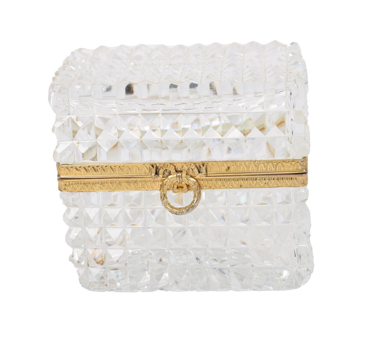 A fine ormolu-mounted cut crystal jewellery box, the rectangular body with diamond-cut panels and hinged lid, mounted with a decorative gilt bronze clasp and frieze band. Of excellent clarity and craftsmanship.