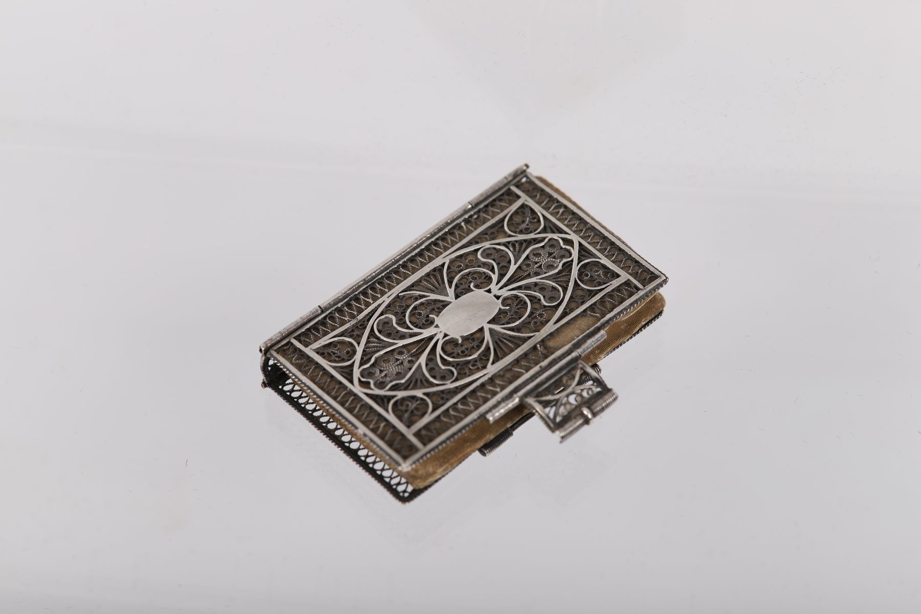 A late Victorian or Edwardian silver visiting card case of rectangular form, decorated with openwork scroll and lattice design, fitted with hinged lid.