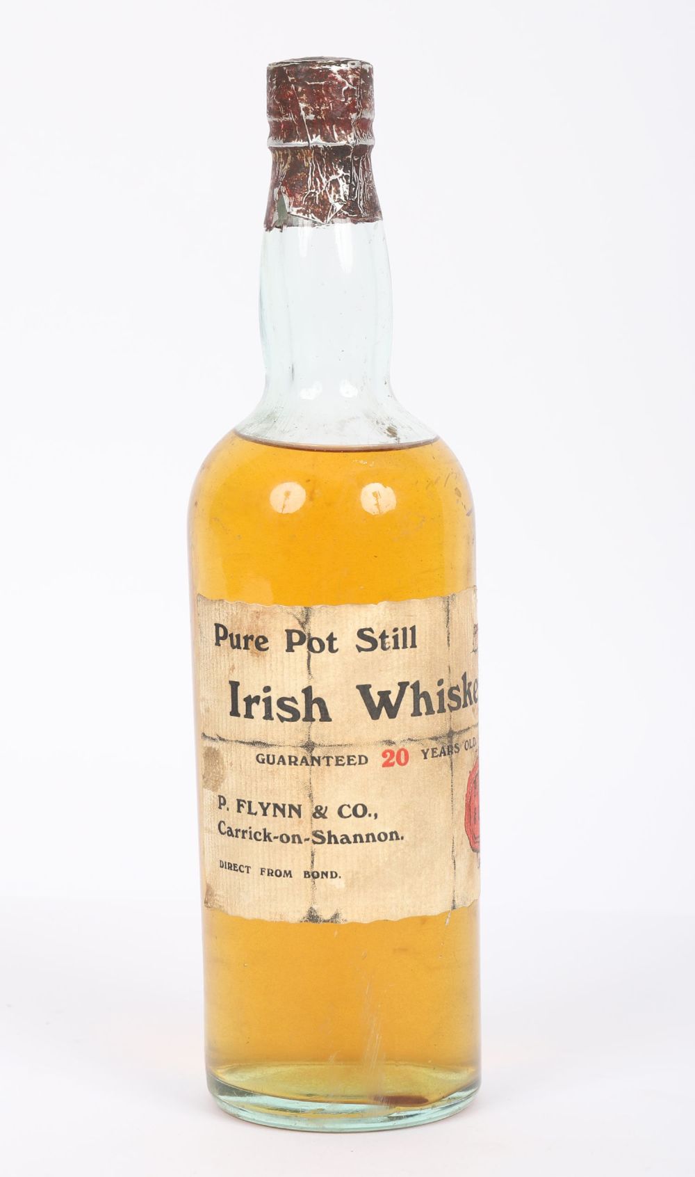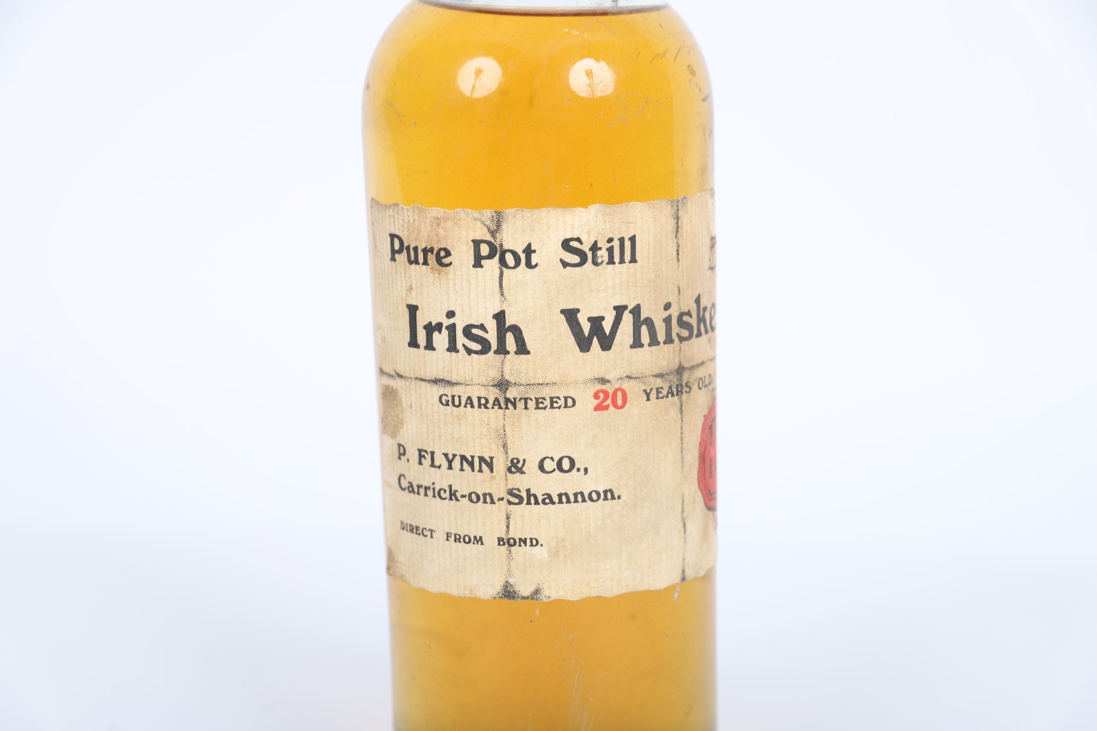 An exceptionally rare early 20th century bottle of pure pot still Irish whiskey, guaranteed 20 years old, bottled by P. Flynn & Co., Carrick-on-Shannon.