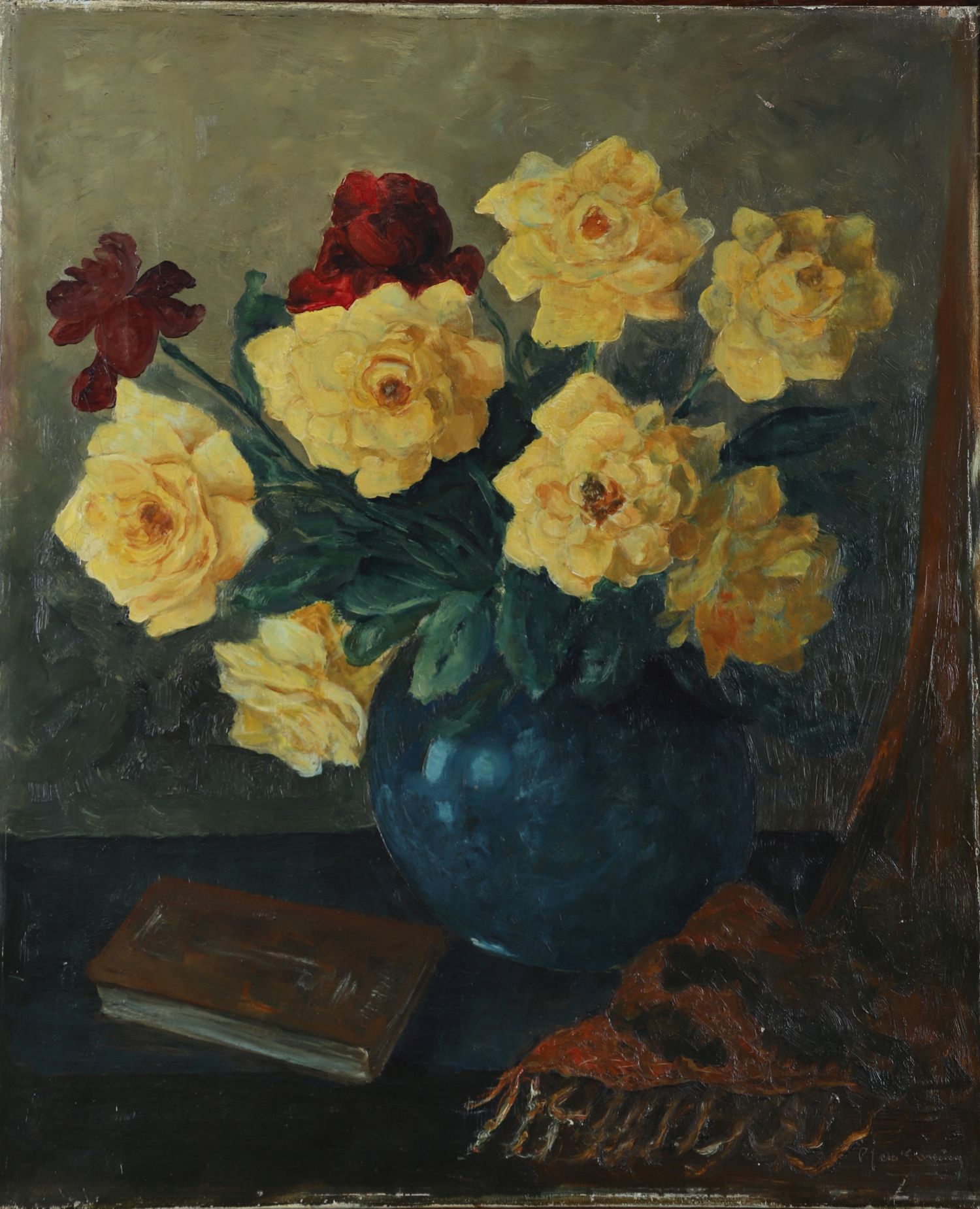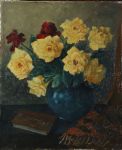 Oil on canvas, depicting a bouquet of yellow roses with red accents in a vase, set against a dark ground with a drape and book. Signed oil on canvas. Enclosed in a rosewood frame.