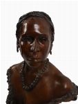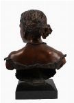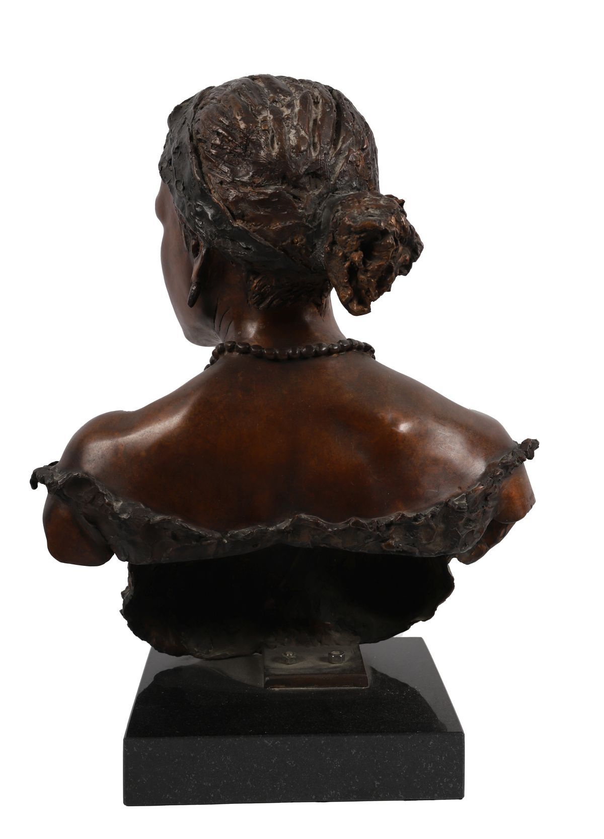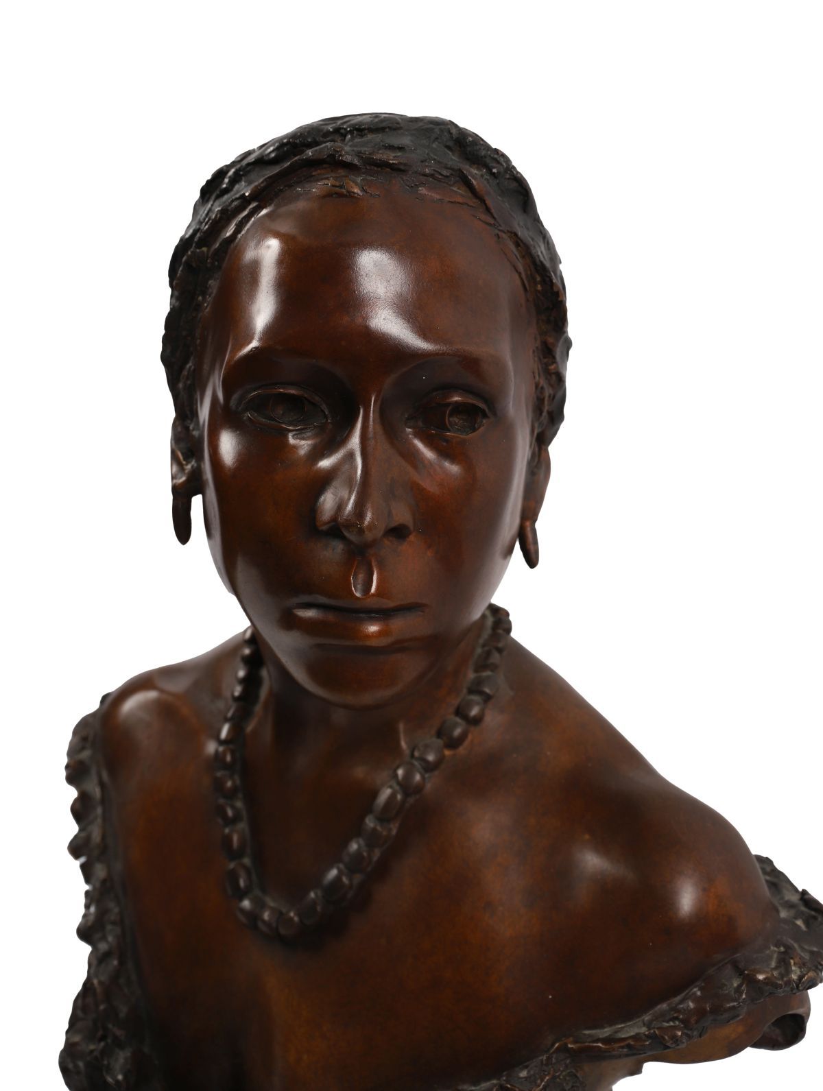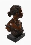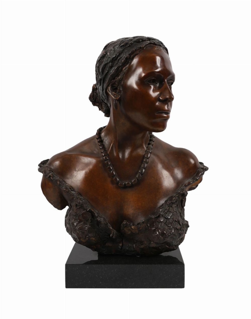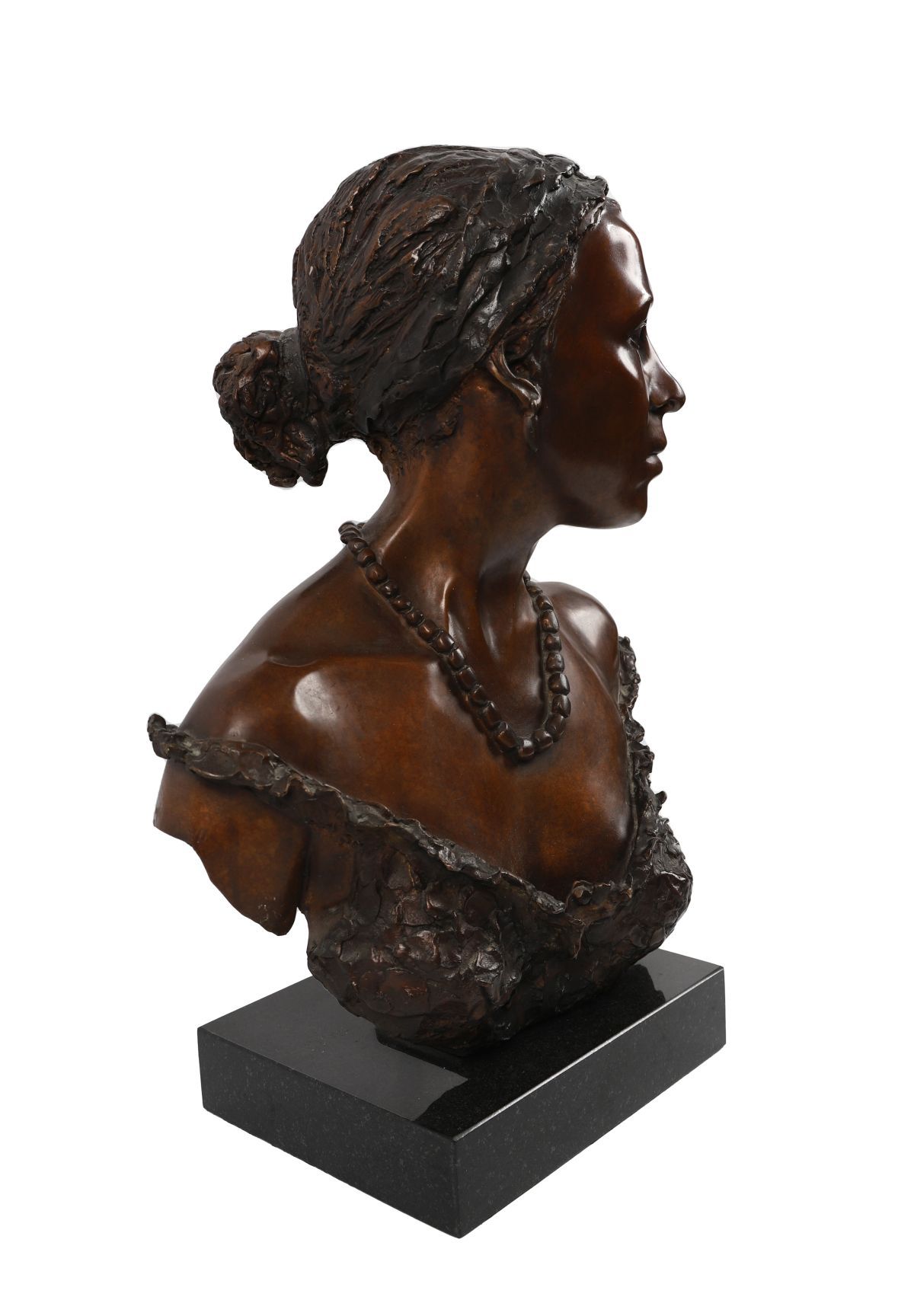 A finely modelled bronze bust by Irish sculptor Paddy Campbell, depicting a young woman wearing a pearl necklace and a delicately textured floral-trimmed bodice. The artist’s characteristic attention to anatomical realism and expression is evident in the soft modelling of the features and lifelike patina. Raised on a black marble plinth, the work demonstrates Campbell’s mastery of bronze casting and his ability to capture poise and quiet dignity.