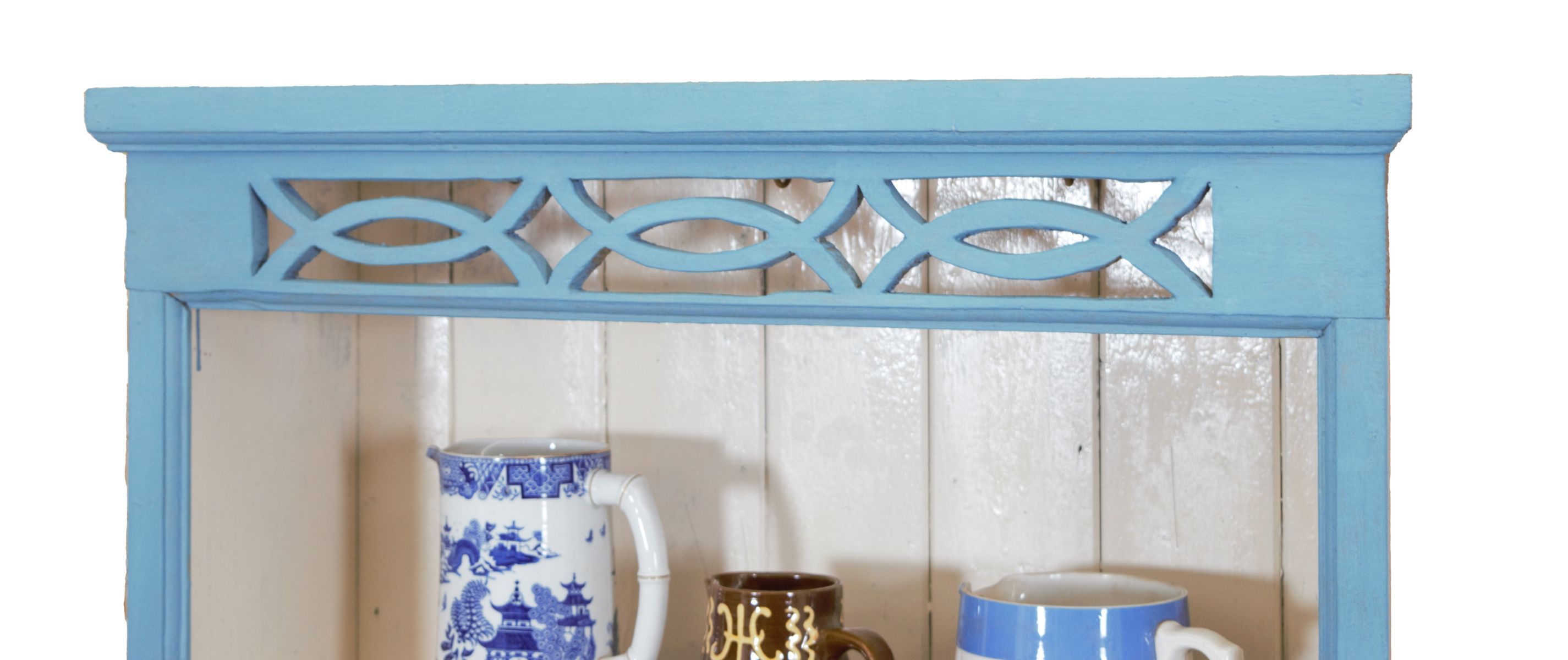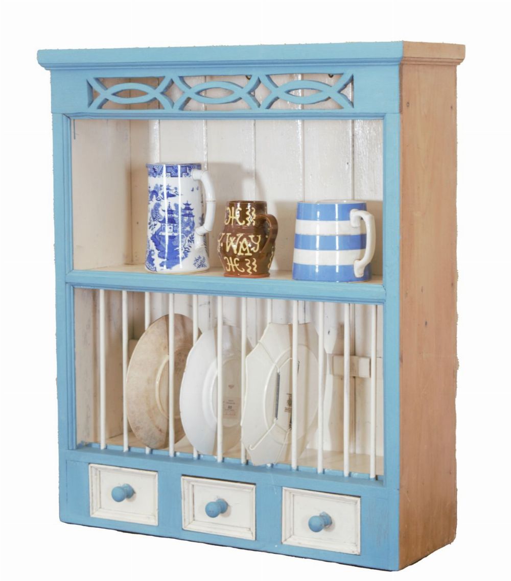 fitted with three drawers and open shelving above, designed for hanging cups and storing crockery.