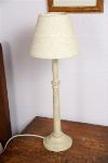 Painted turned stem table lamp with circular base, fitted with a tapered fabric shade. Electrified.