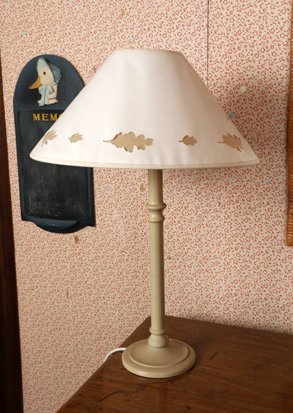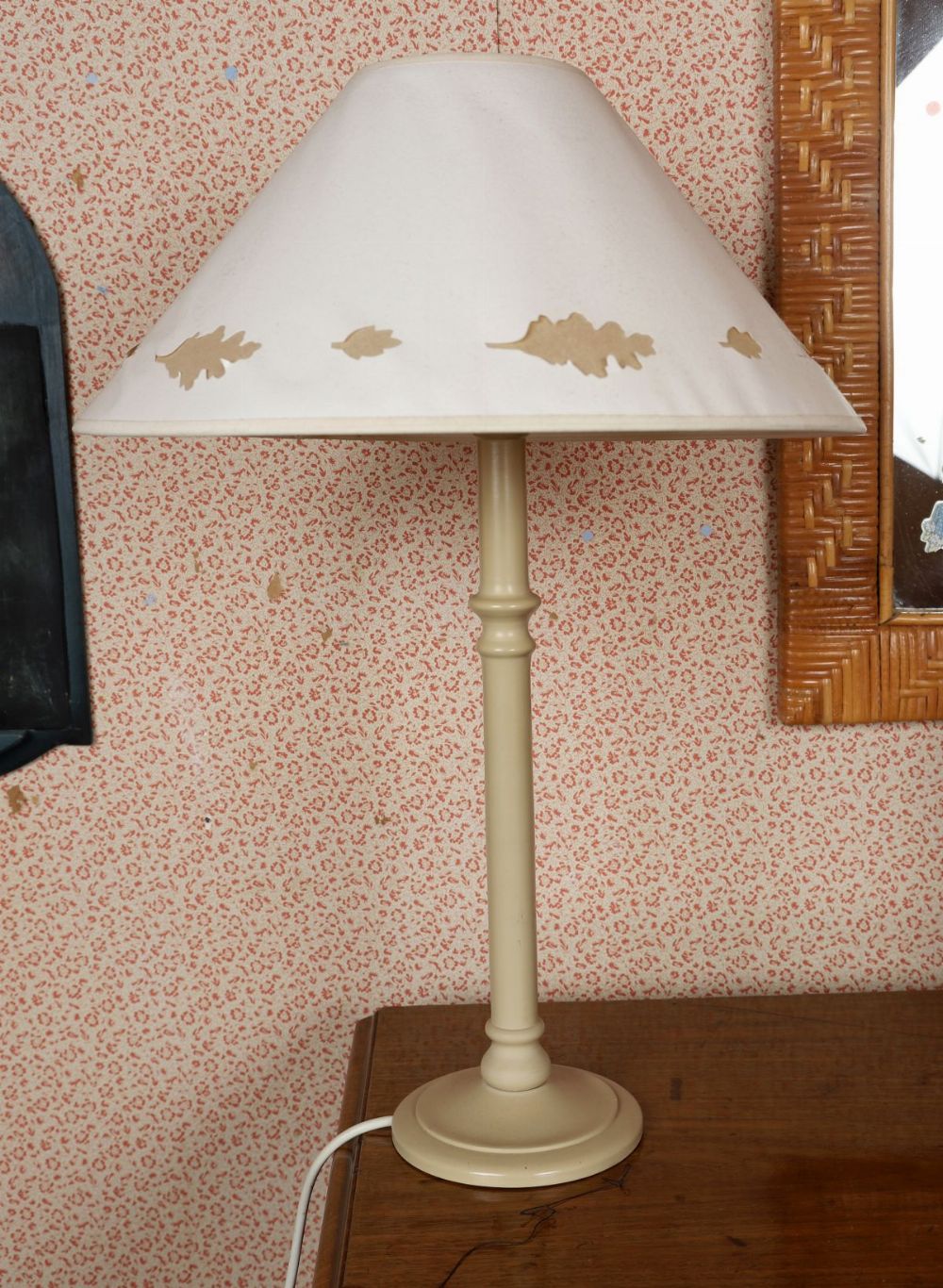 A painted turned-wood table lamp with circular base and tapering stem, finished in a pale neutral tone. Fitted with a fabric shade. Converted for electricity. Wear and surface marks consistent with use.