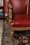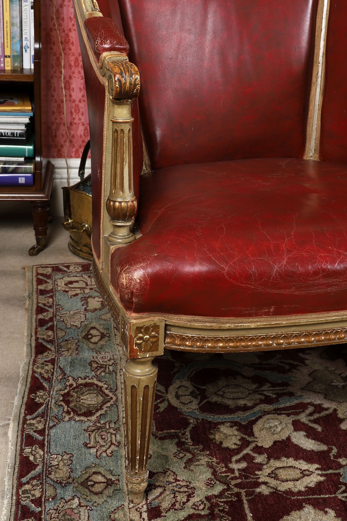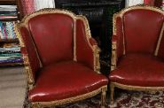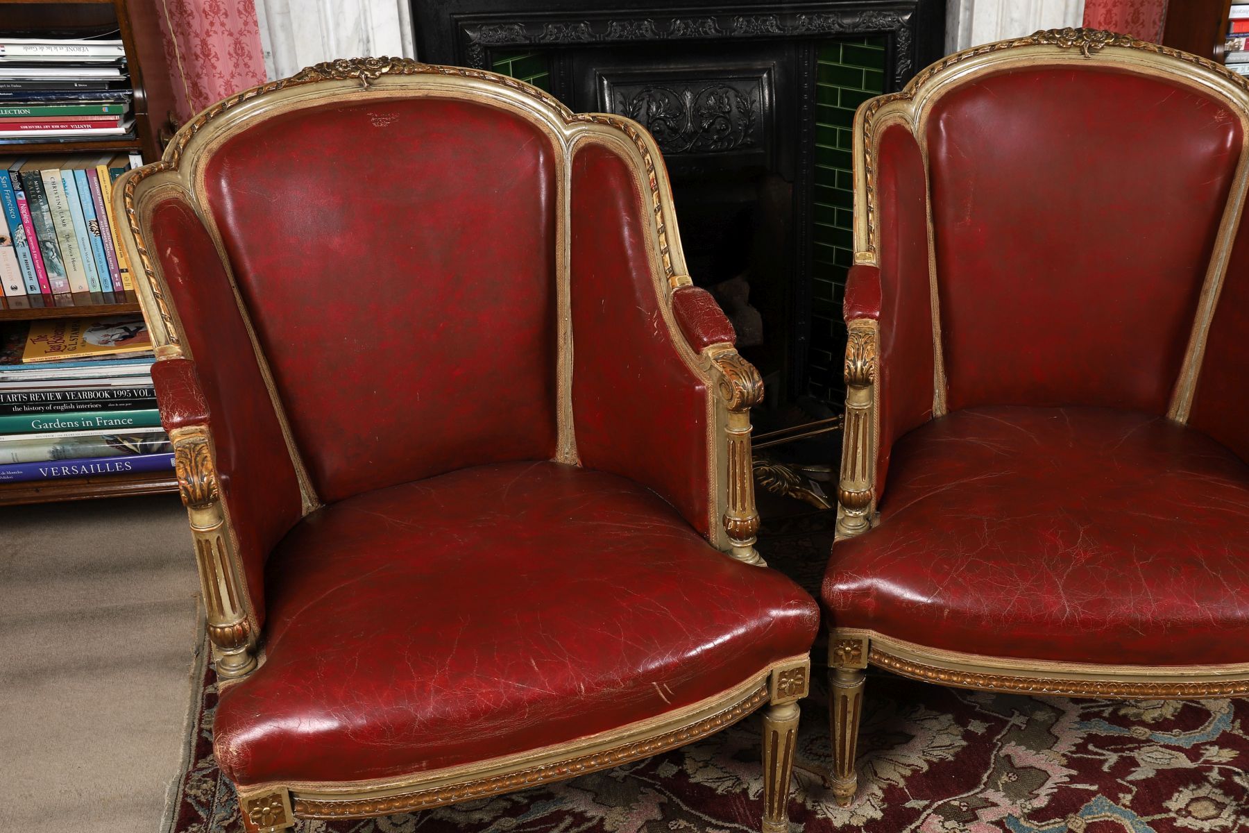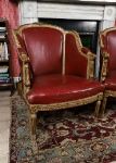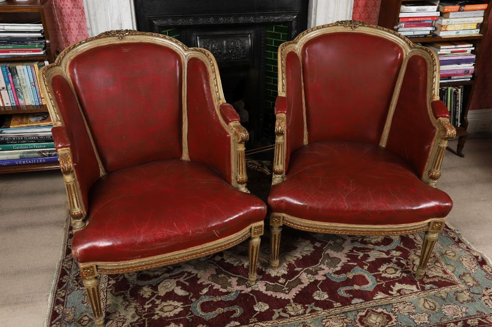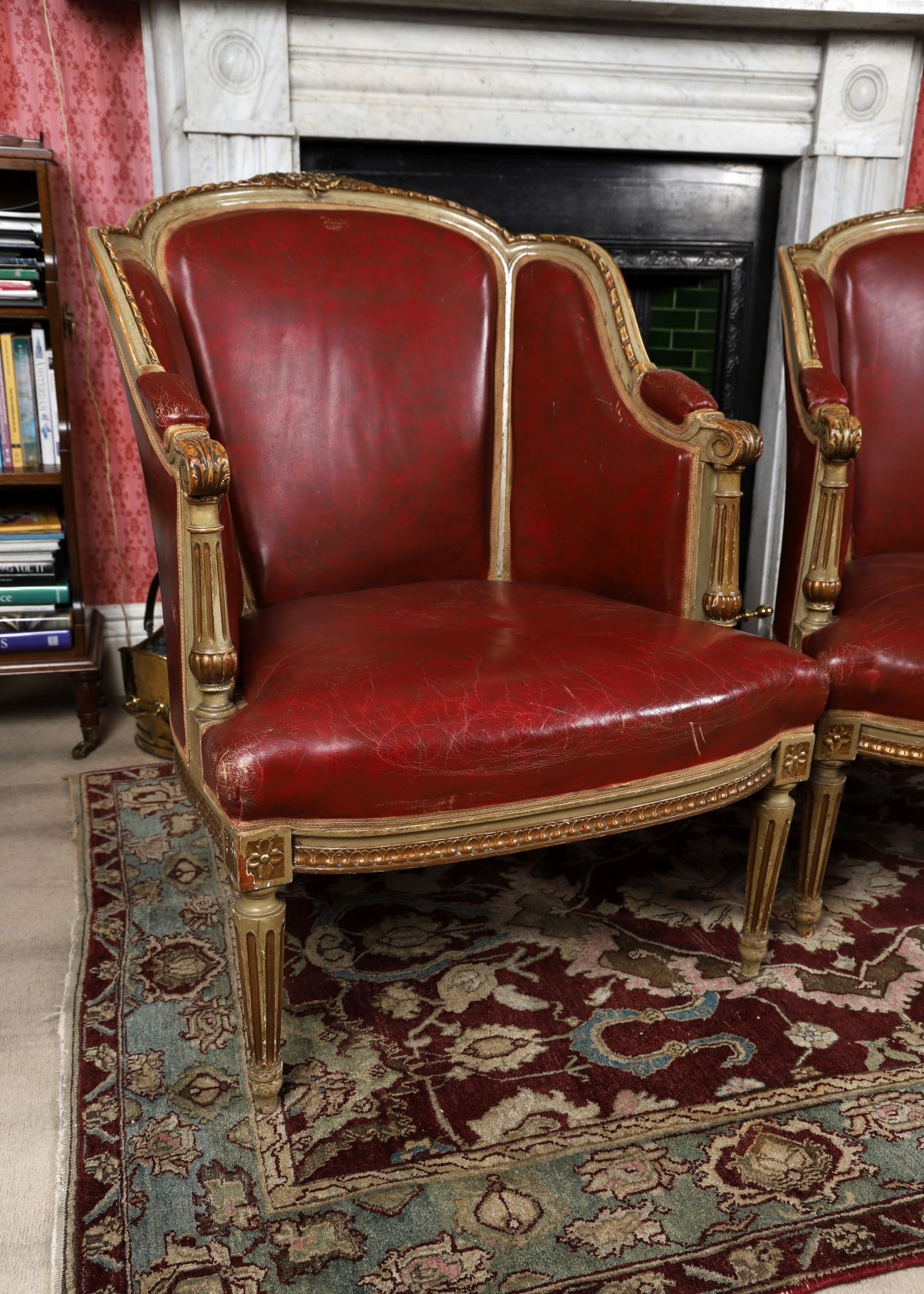 each with a parcel-gilt show frame, raised on turned and fluted legs to the fore.