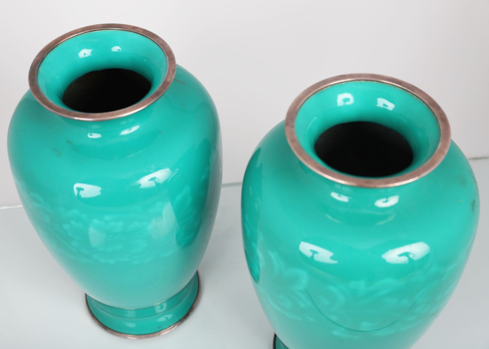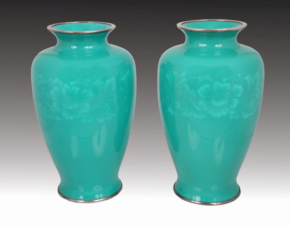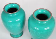 Lot 72 PAIR JAPANESE SILVER & GREEN ENAMELLED VASES