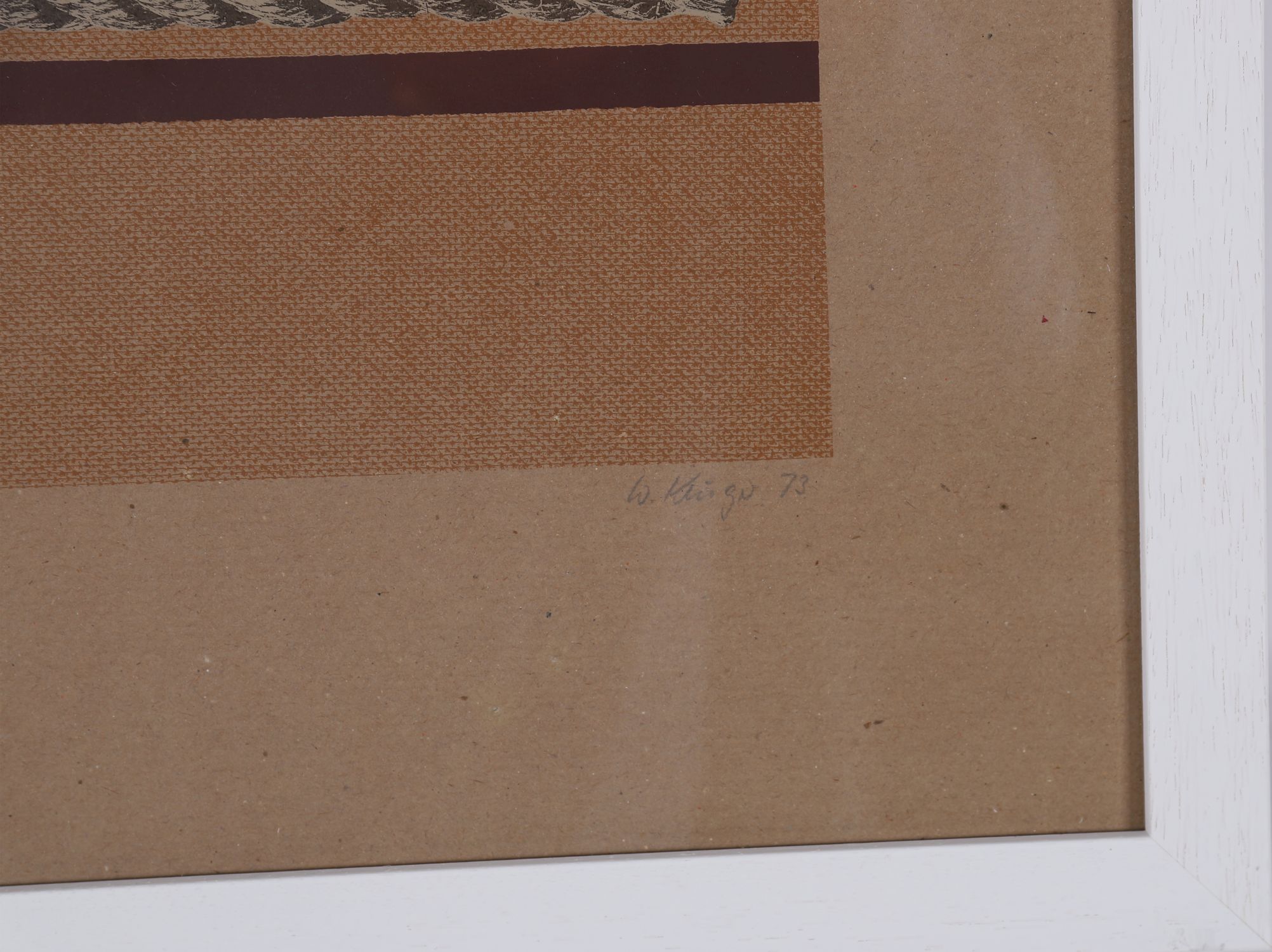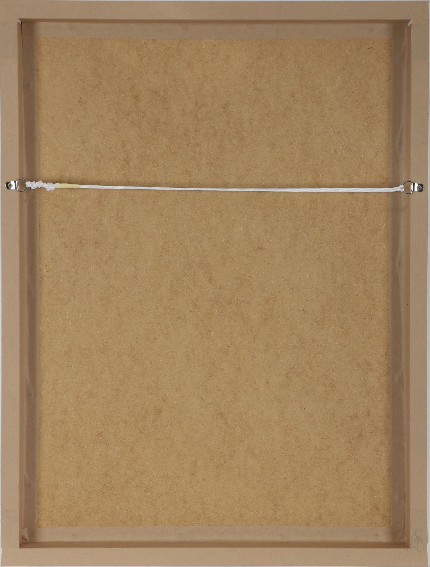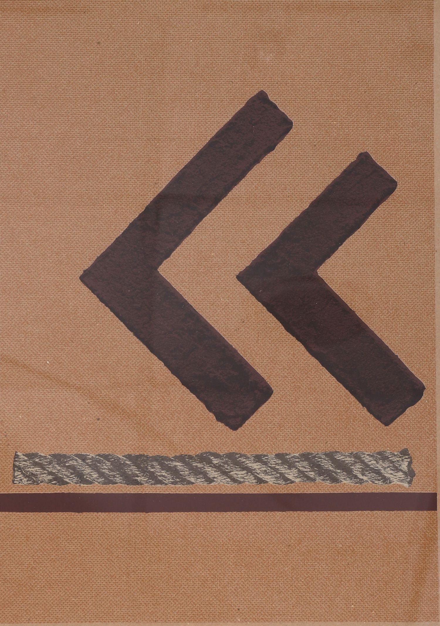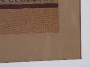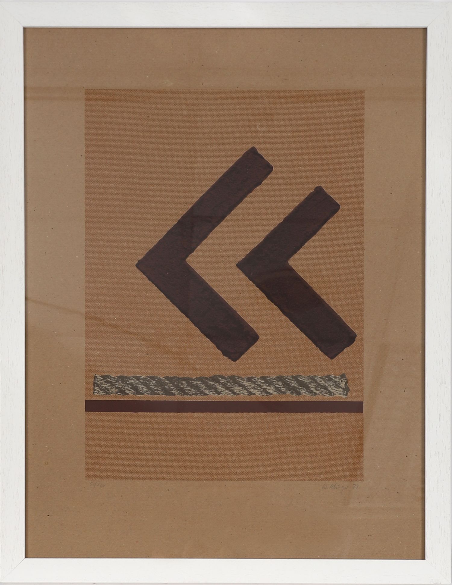 Description: Two abstract mixed-media prints in earthy tones, featuring geometric symbols, rope-like patterns, and textured surfaces. Both signed and numbered.