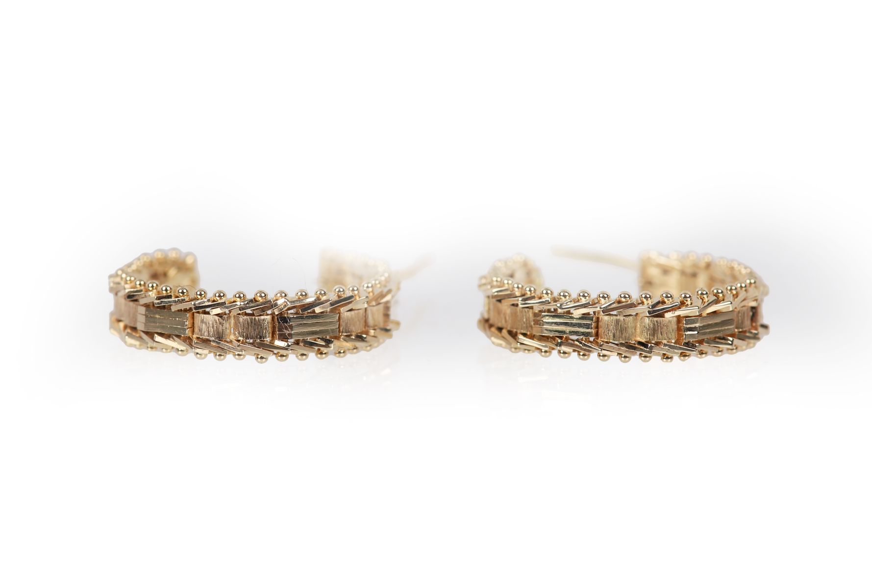 A pair of 14 ct. yellow gold textured hoop earrings, each with a beaded edge and secure hinged fittings.