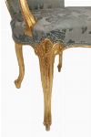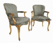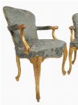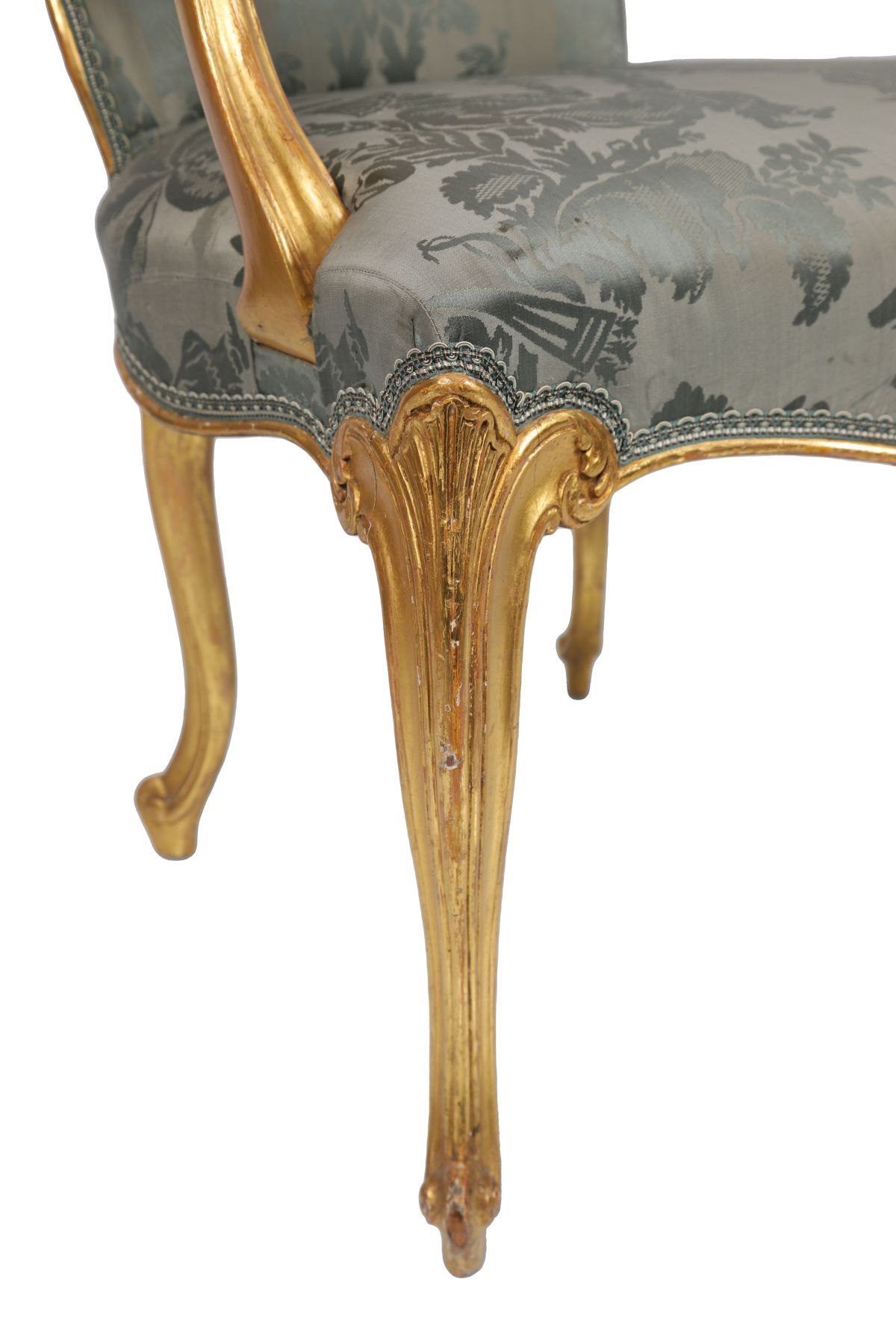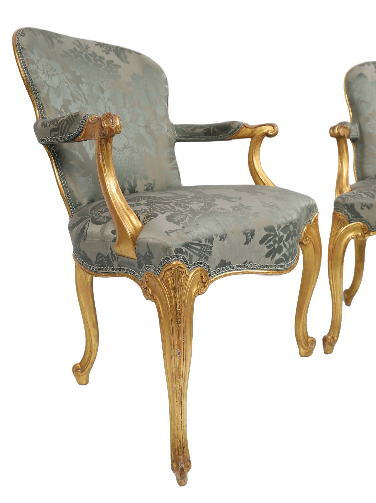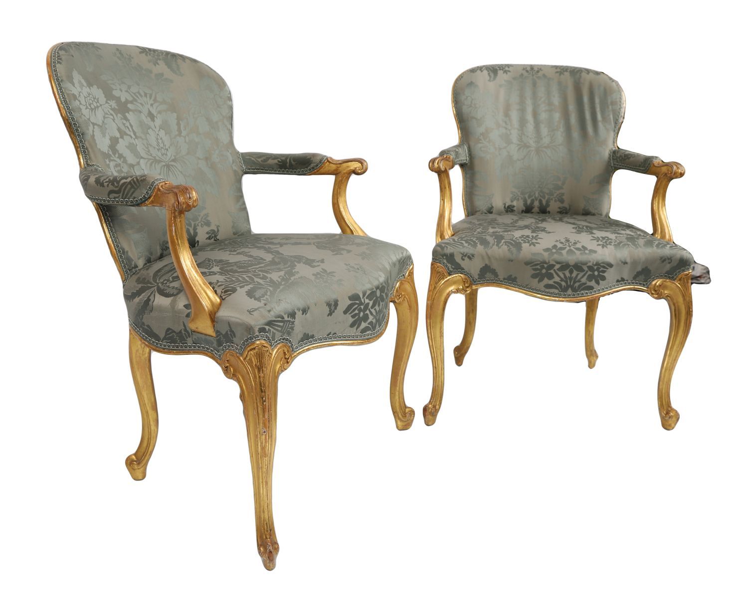 Pair of 18th-century carved giltwood elbow chairs, each with upholstered back and seat covered in patterned damask, raised on cabriole legs.
