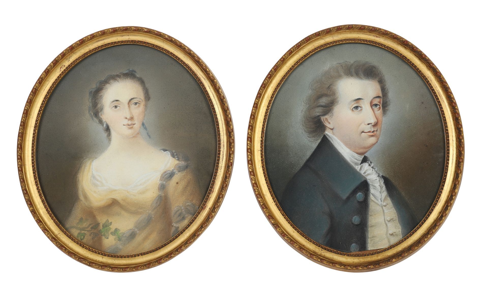 A pair of late 18th-century oval pastel portraits depicting Walter Hussey de Burgh (1743–1783), Prime Serjeant and Chief Baron of the Irish Exchequer, and his wife and cousin Anne, of Donore House, County Kildare.