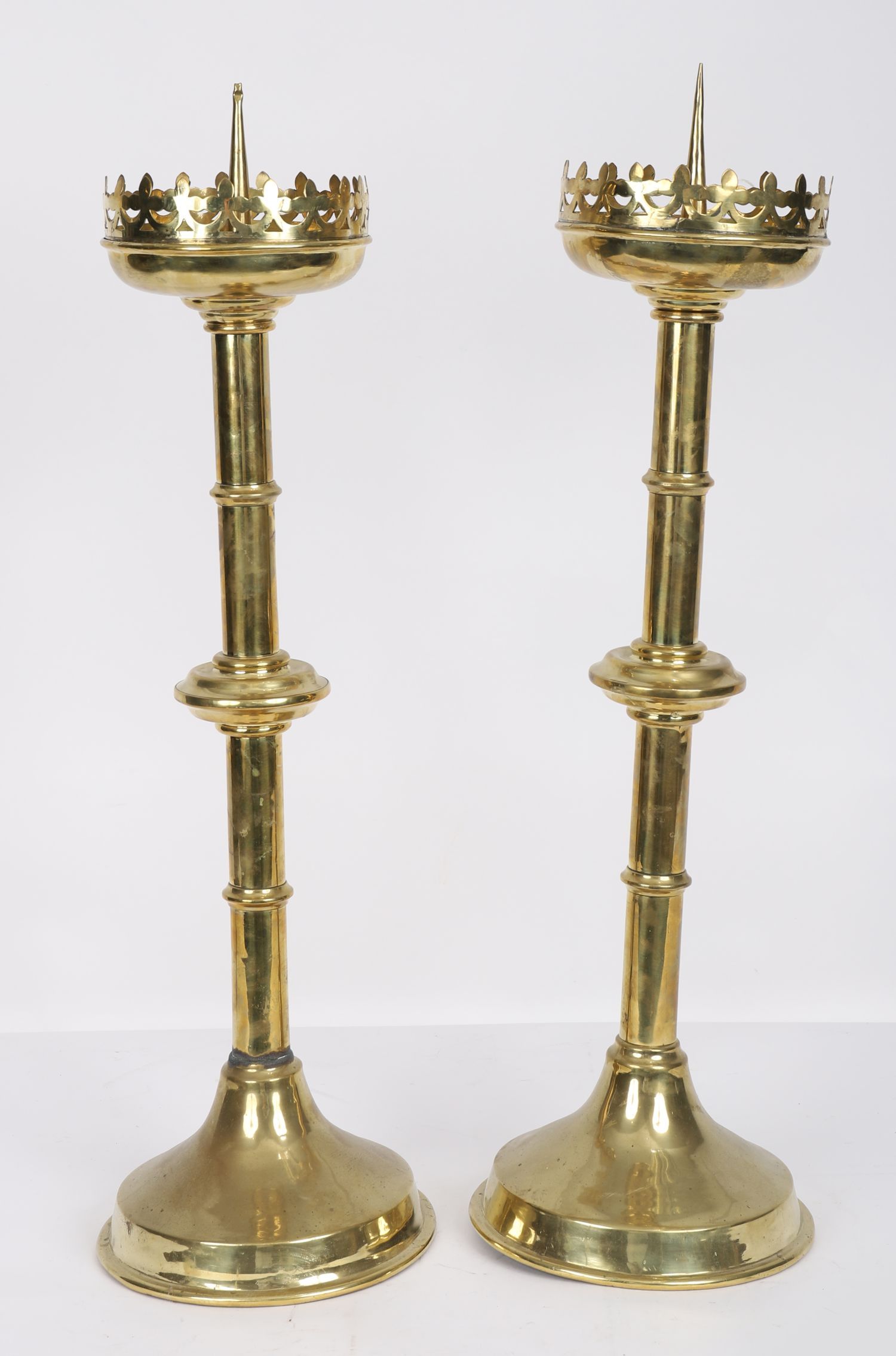 A pair of tall brass candlesticks with wide circular bases and crown-shaped drip pans with central prickets.