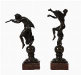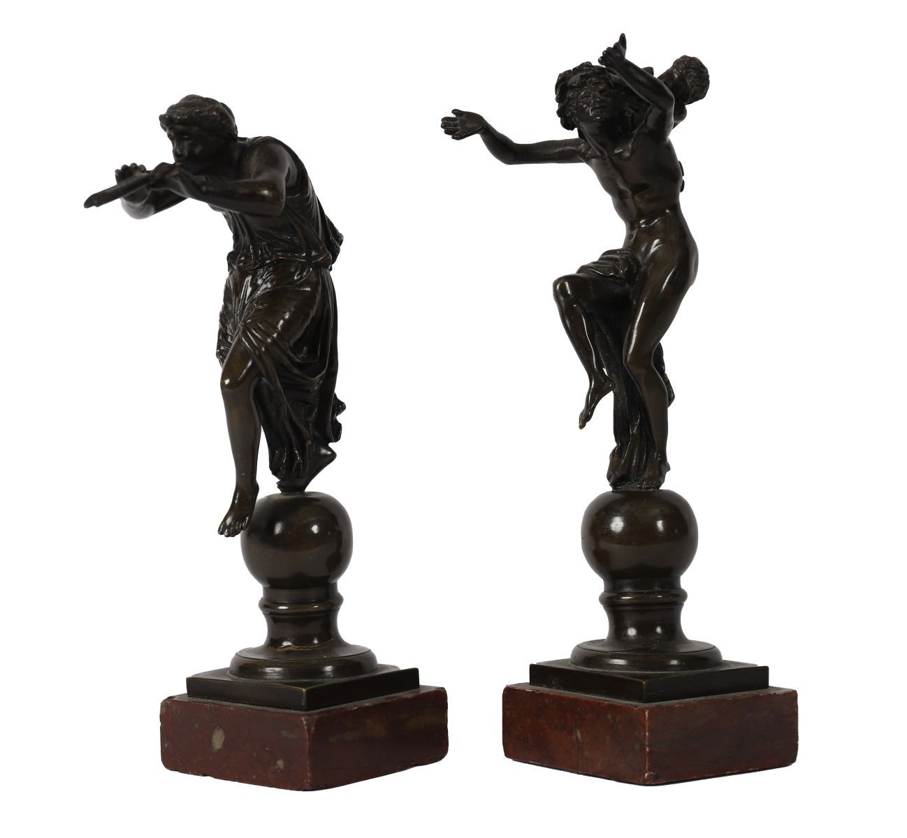 A pair of 19th-century patinated bronze figures of classical dancers, each poised in movement upon a spherical base, raised on square plinths.