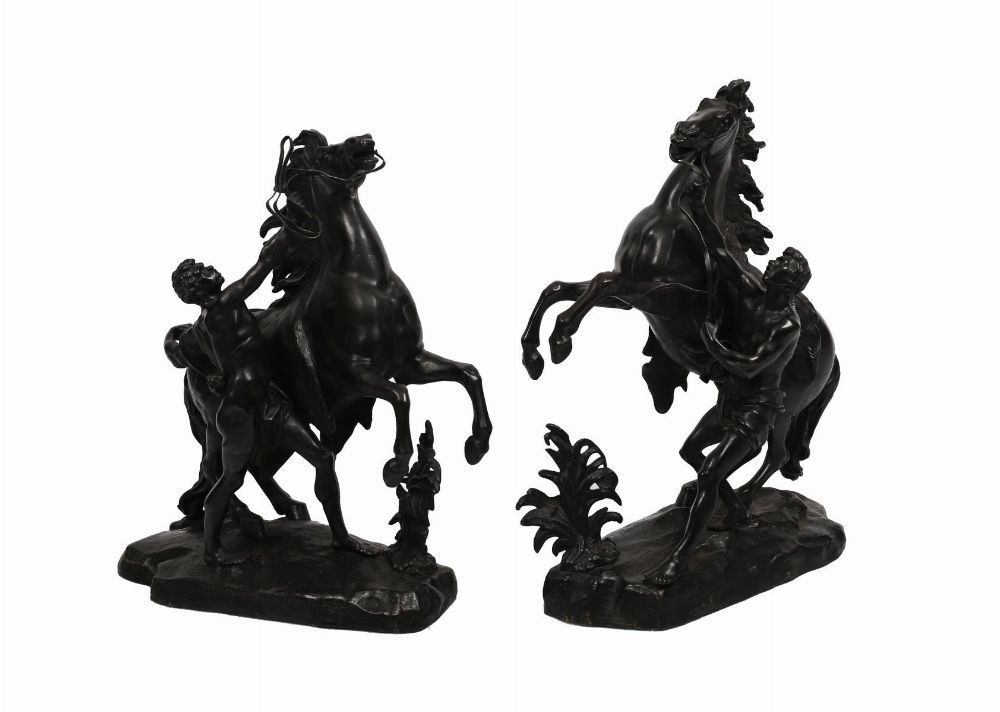 A well-cast pair of 19th-century bronze figures after Guillaume Coustou, depicting rearing horses restrained by nude male figures. Each mounted on an integral naturalistic base. Excellent definition and patination throughout.