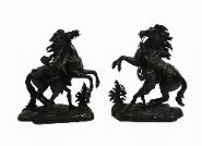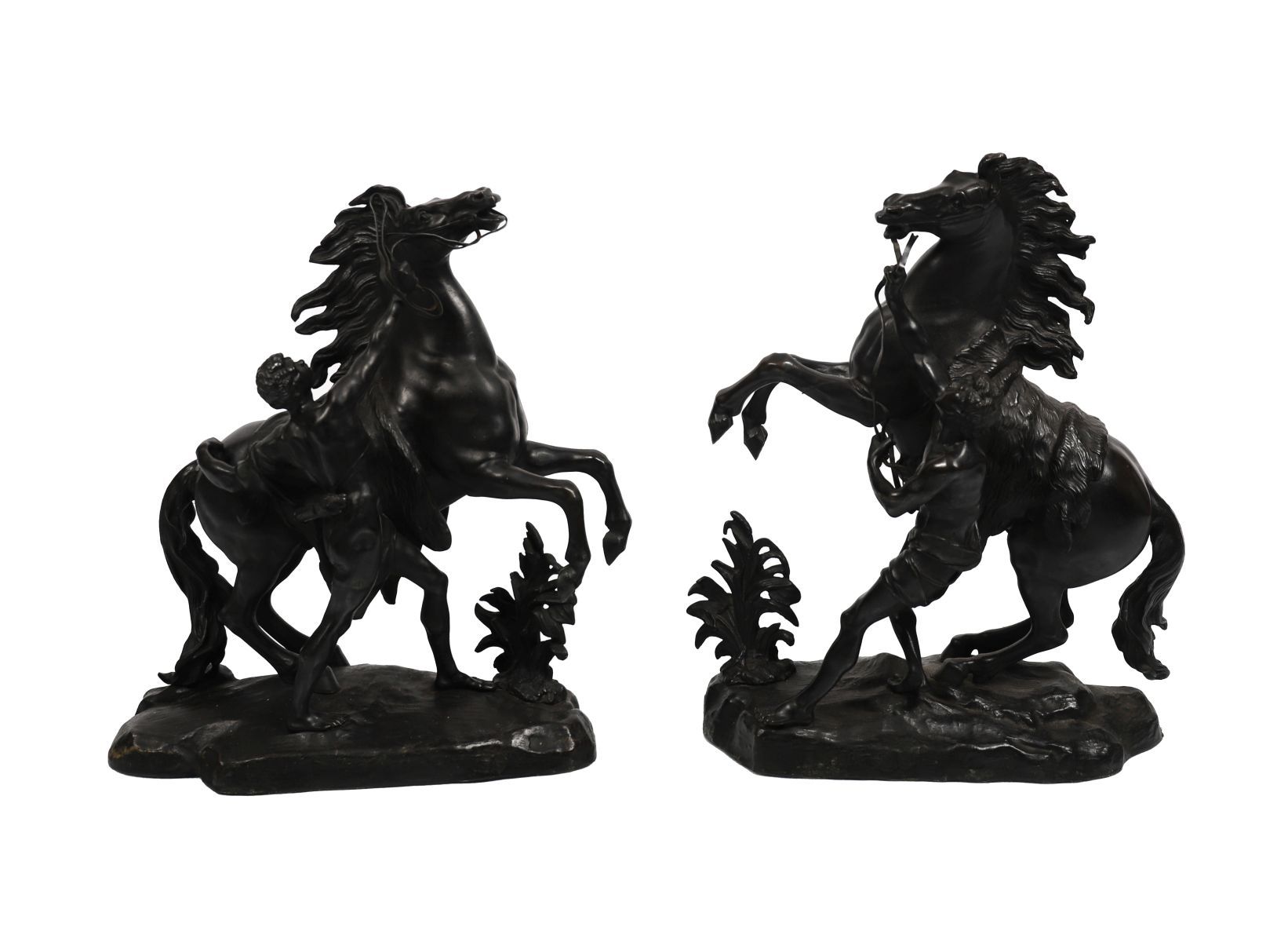 A well-cast pair of 19th-century bronze figures after Guillaume Coustou, depicting rearing horses restrained by nude male figures. Each mounted on an integral naturalistic base. Excellent definition and patination throughout.