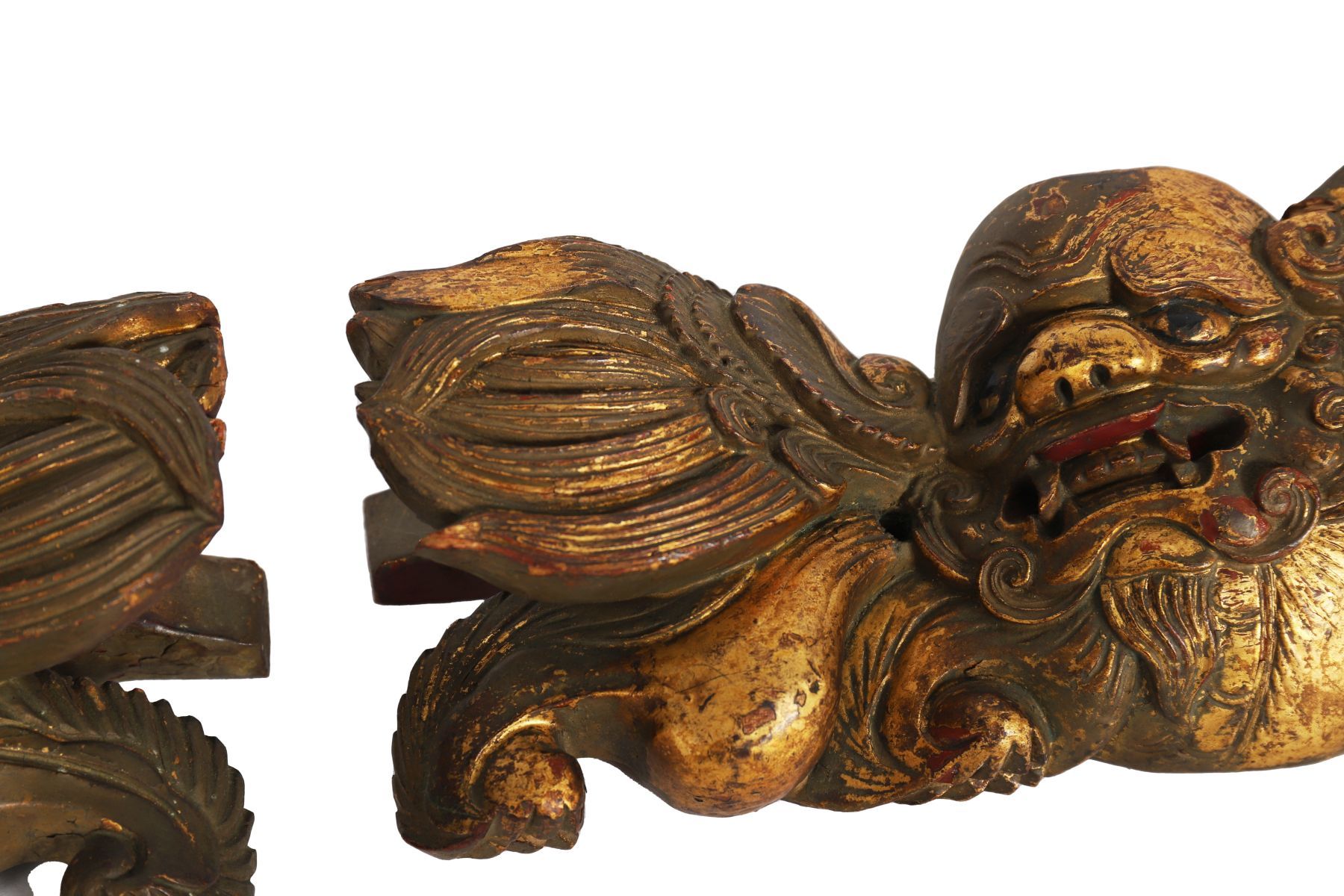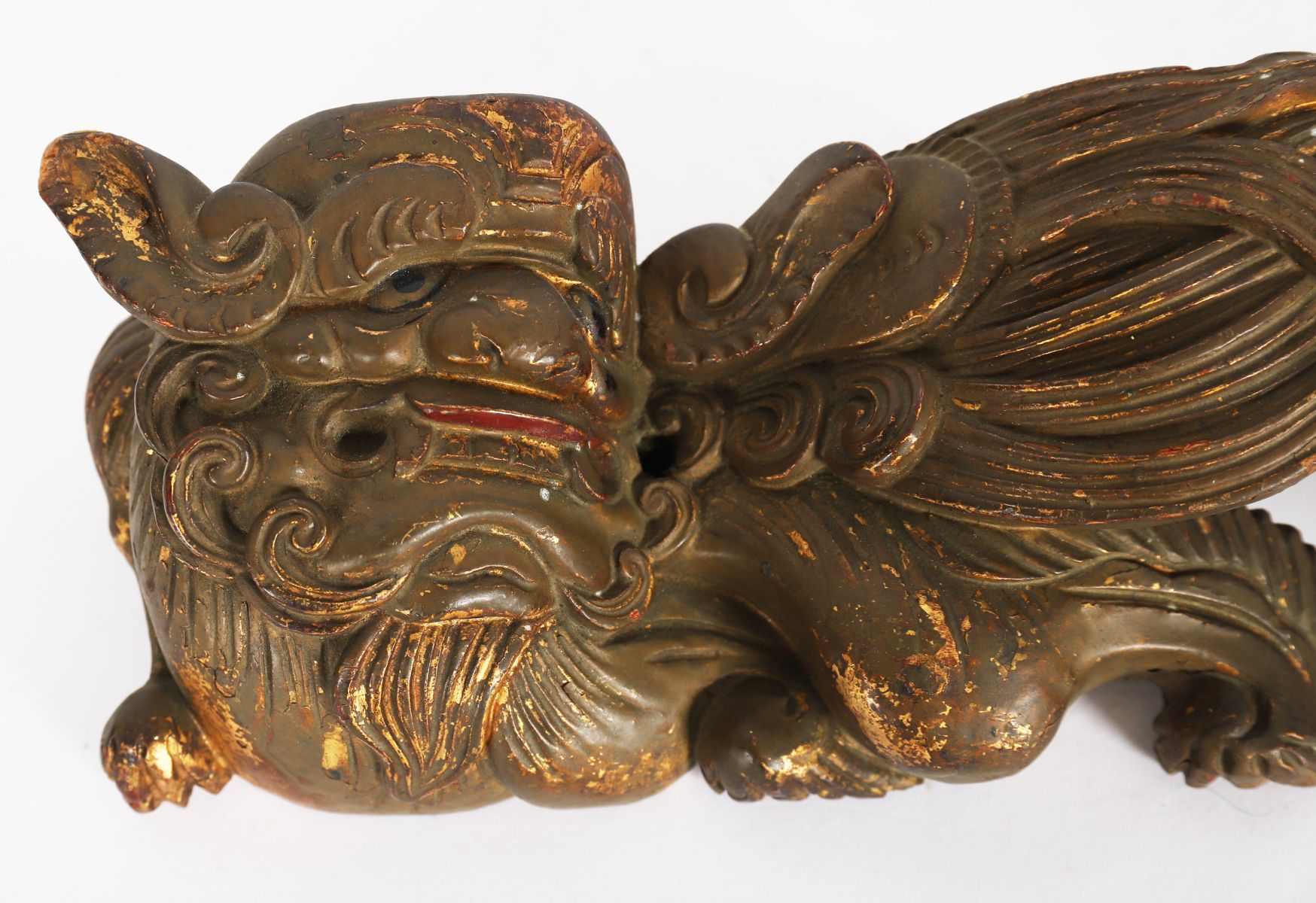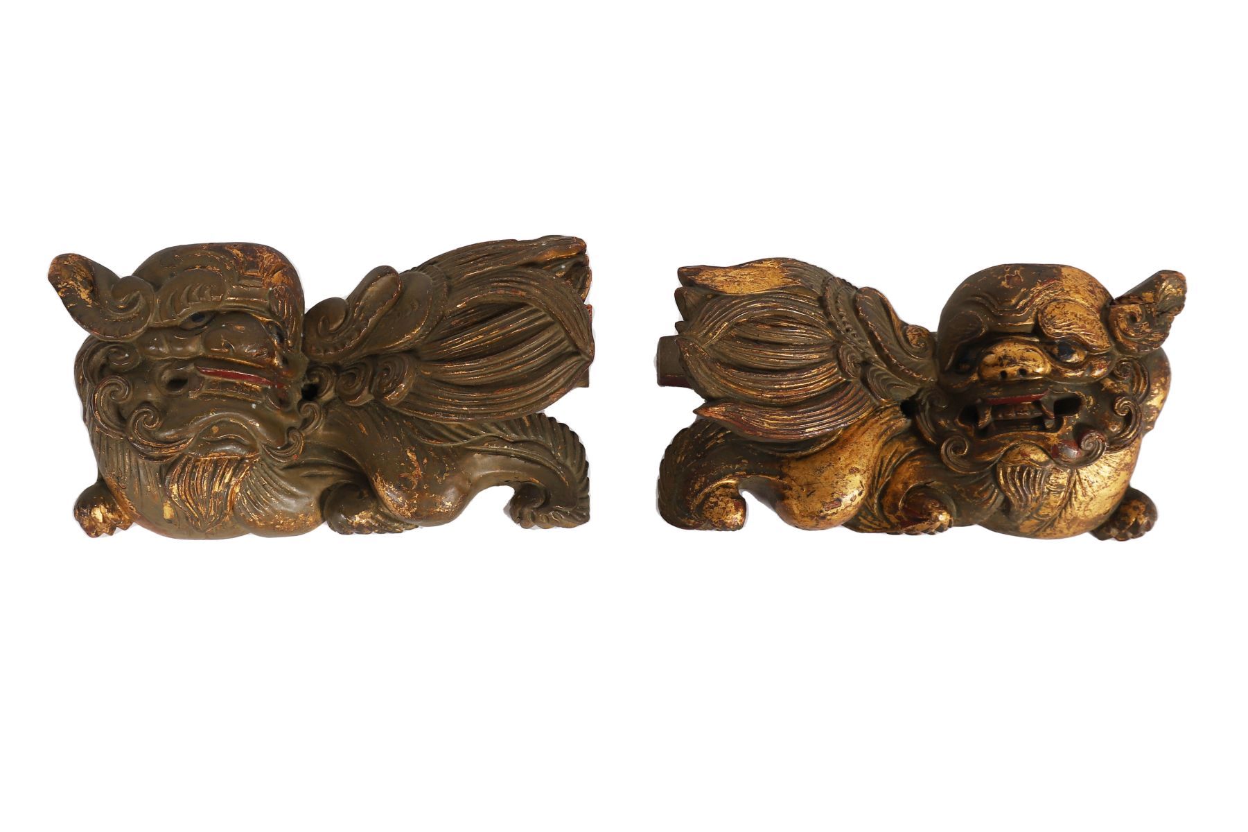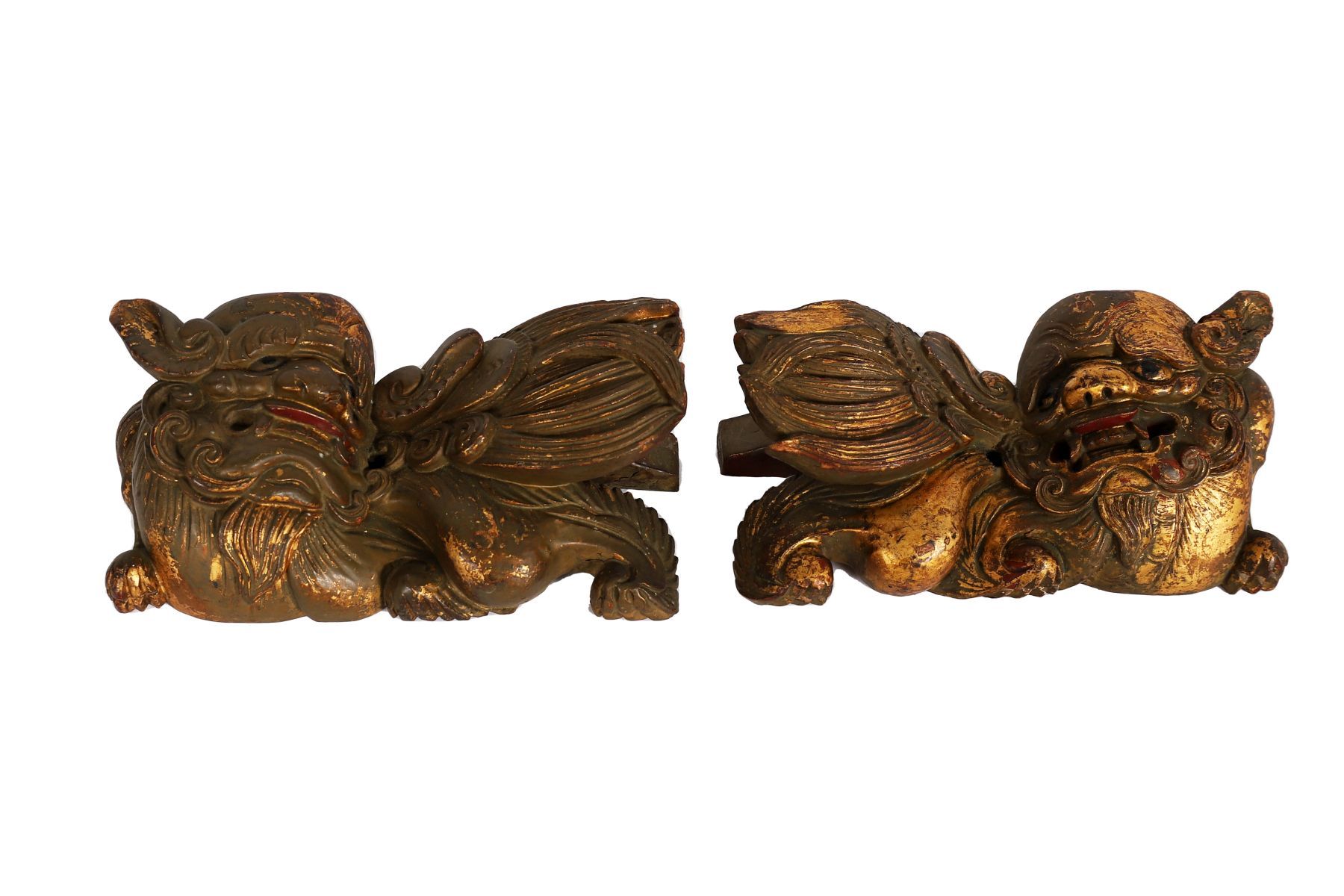 Each modelled recumbent with stylised wings and scrolling manes, retaining traces of gilt decoration.