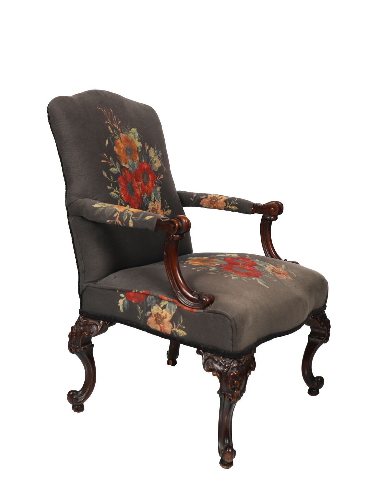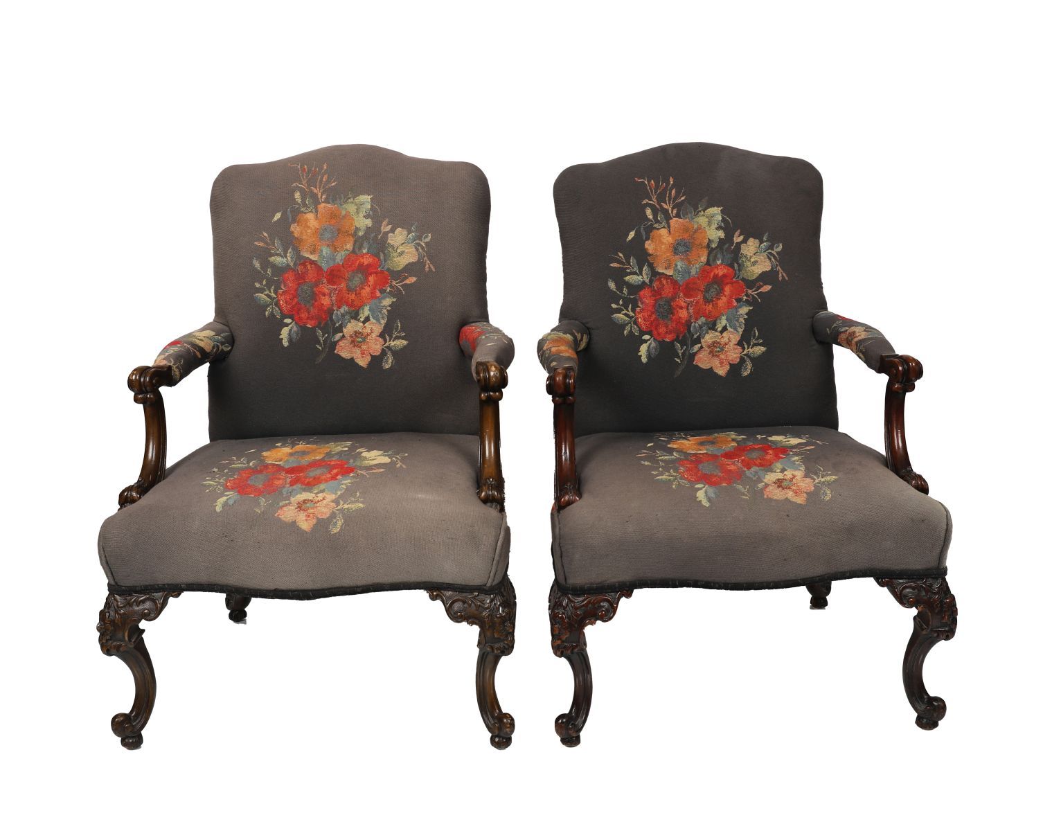 A pair of 19th century carved mahogany Gainsborough armchairs with scroll arms and cabriole legs, upholstered in floral tapestry fabric with bold poppy decoration. Circa 1880.