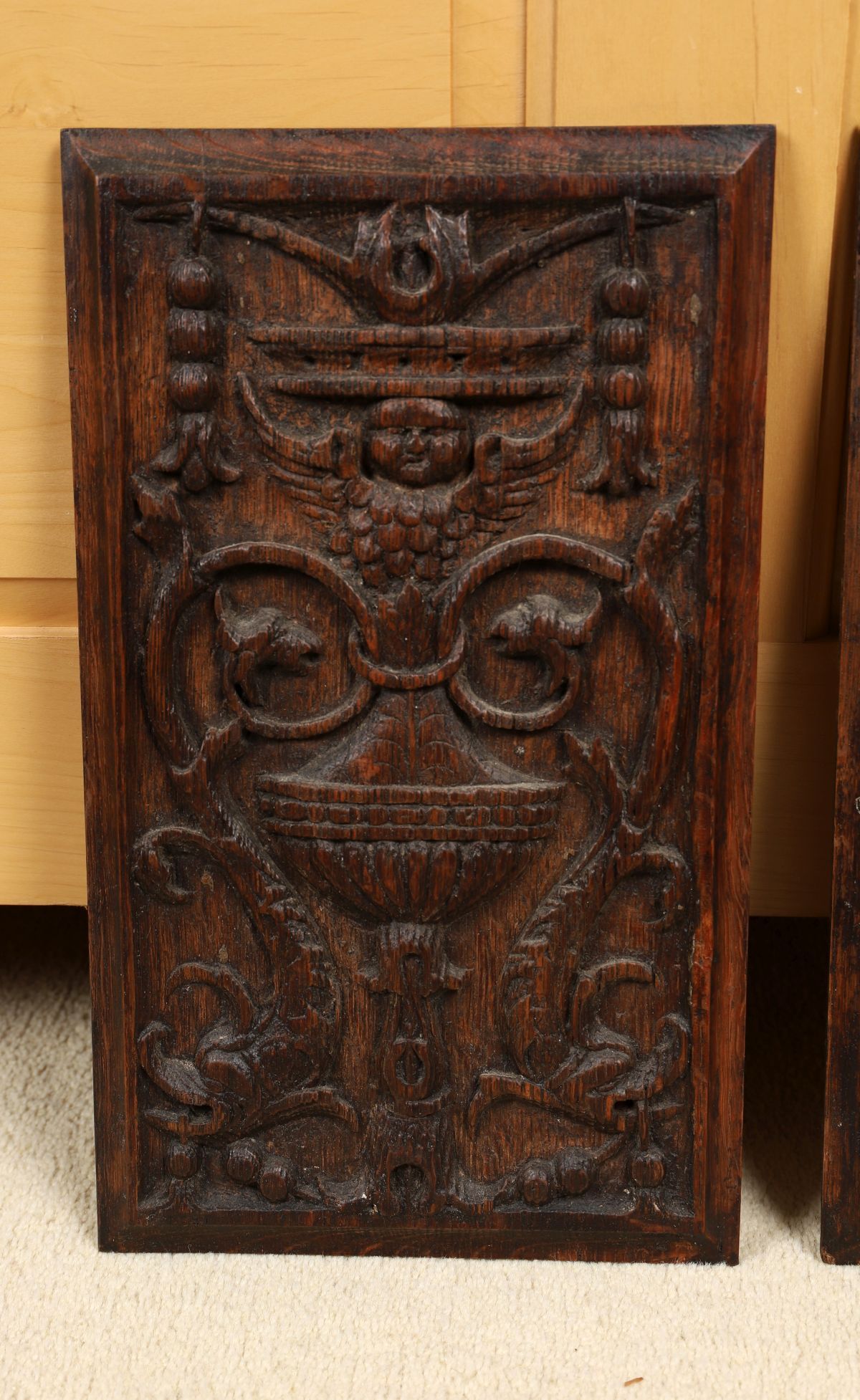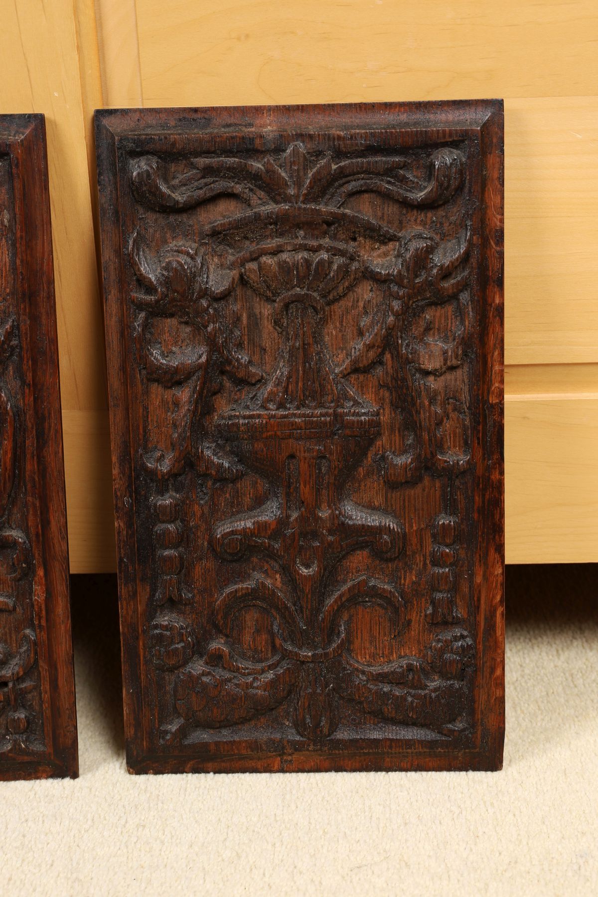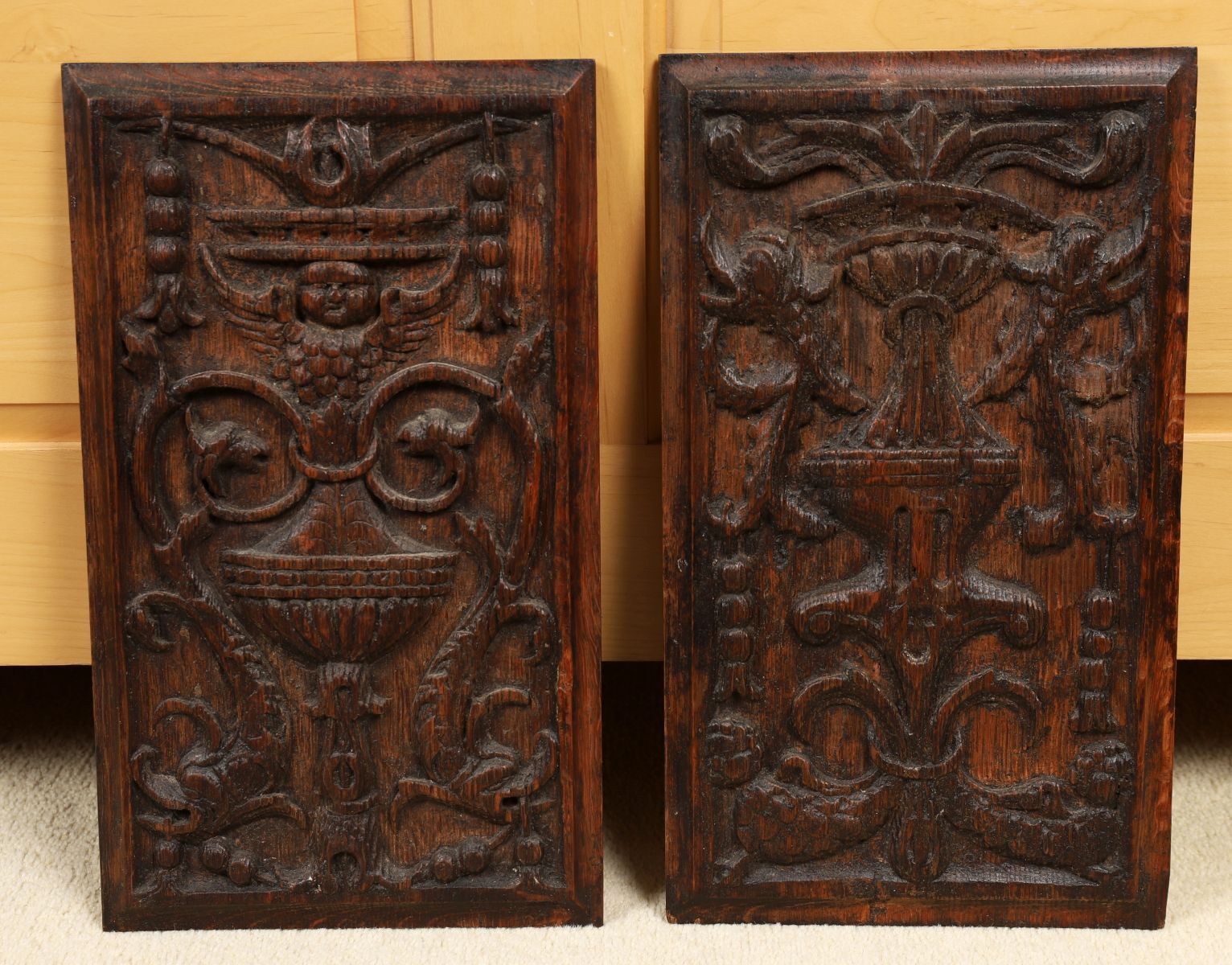 A pair of 19th-century carved oak panels, each decorated in relief with scrolling foliage and classical urn motifs within a rectangular frame.