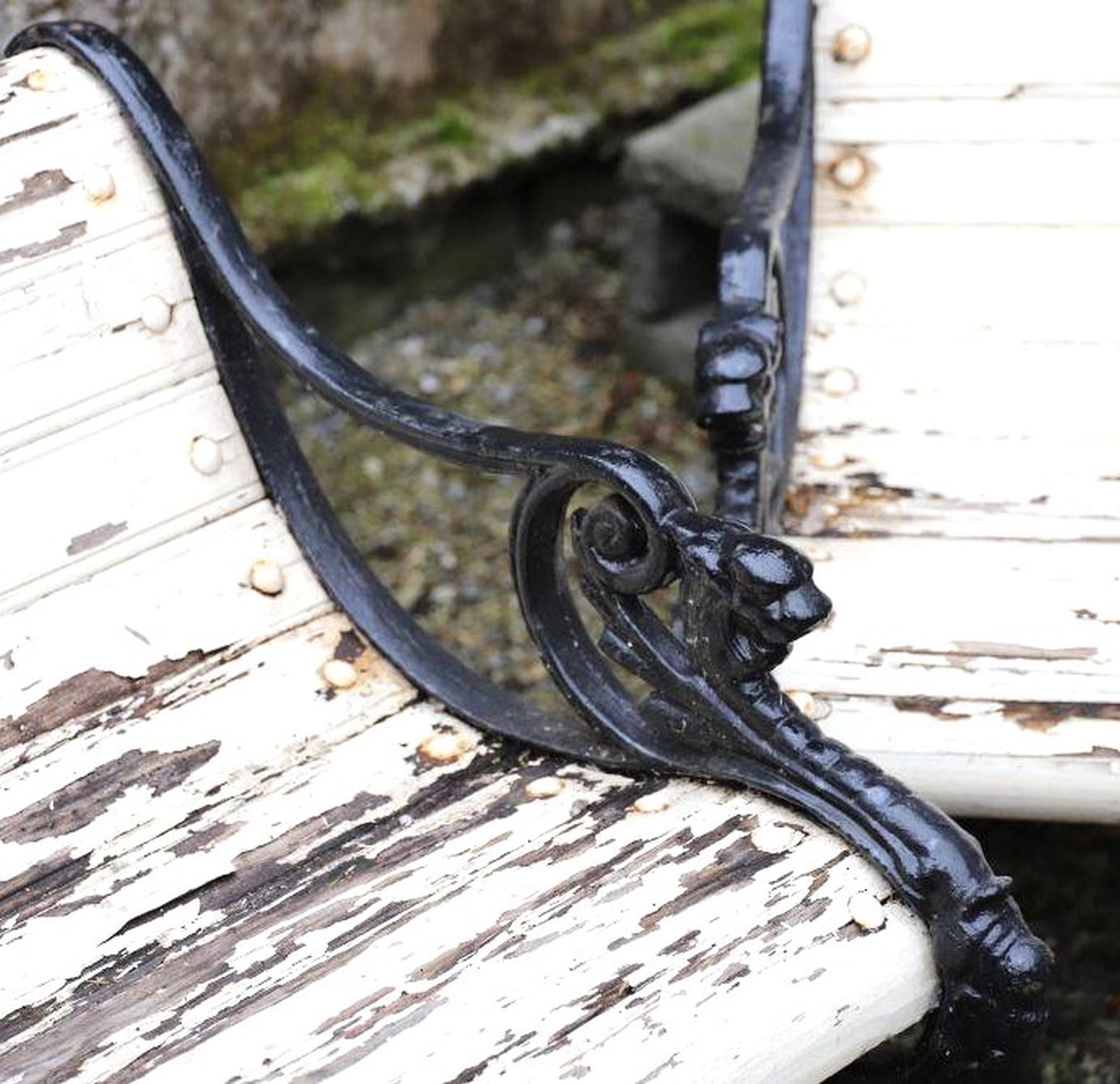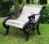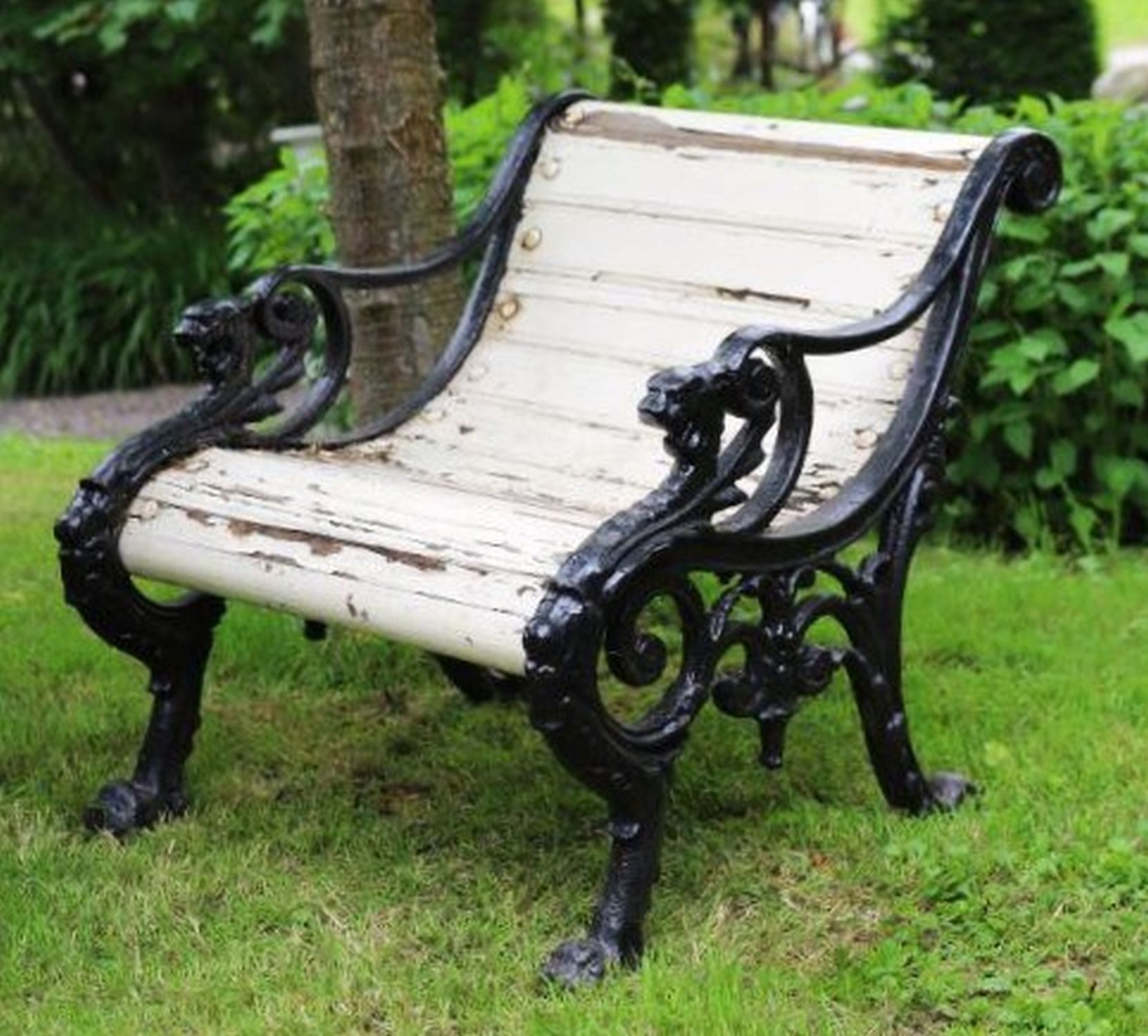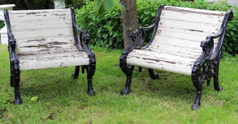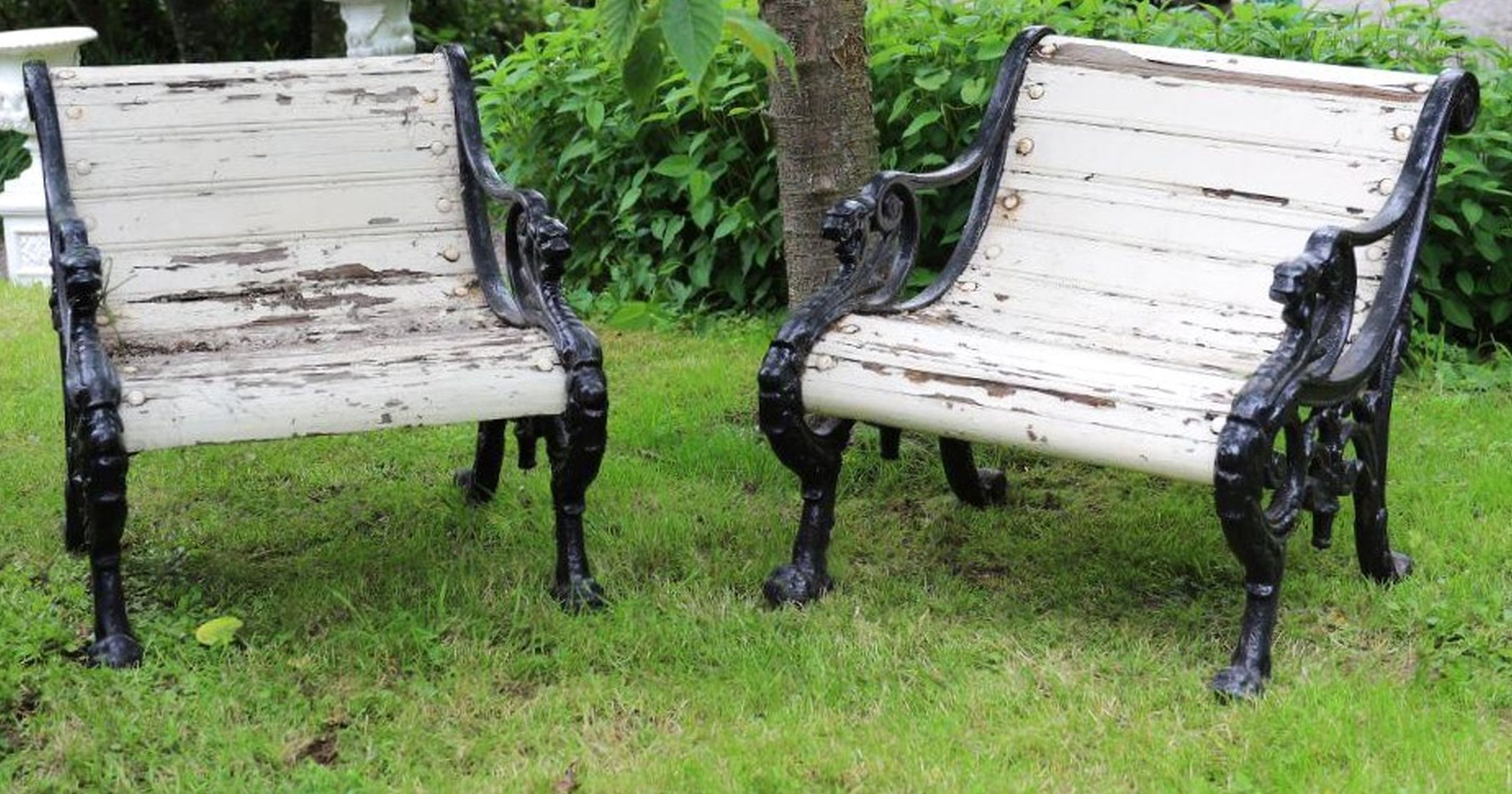 A pair of 19th century cast iron garden or patio armchairs, each with scrolling openwork sides cast with lion head terminals and paw feet, fitted with wooden slats to the seats and backs, now showing weathered patination and flaking paint consistent with age.