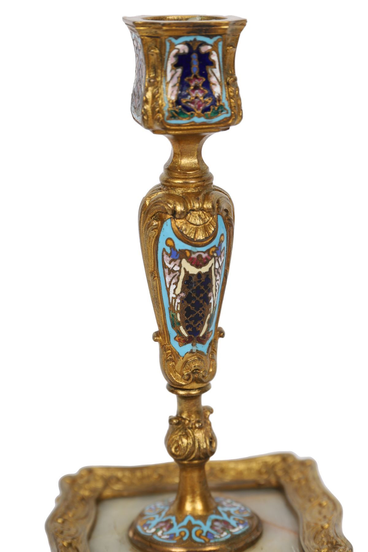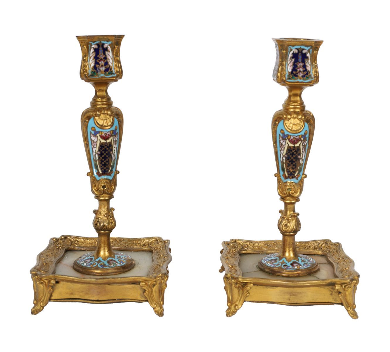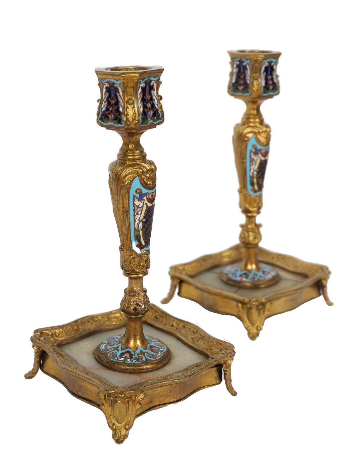 A pair of 19th-century cloisonné enamel and onyx candlesticks, ormolu-mounted, each with square base raised on foliate feet and tapering stem with enamel panels.