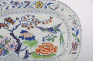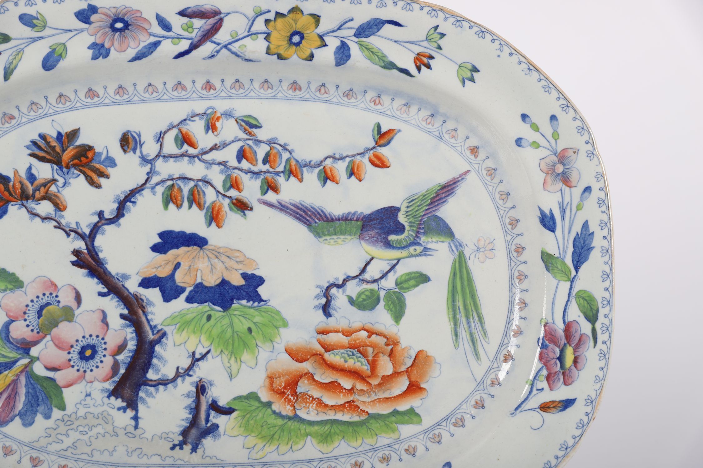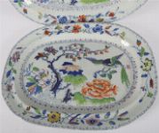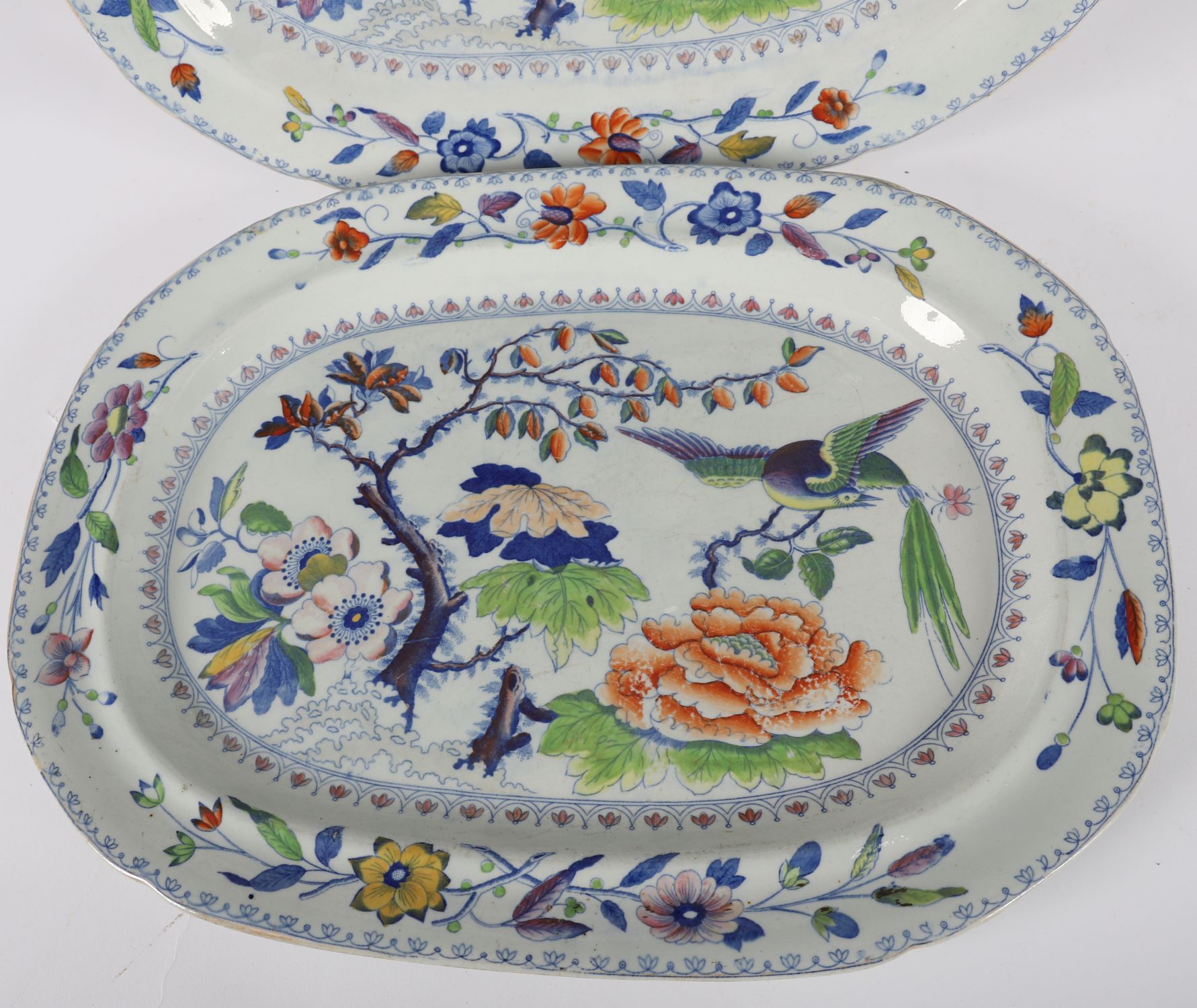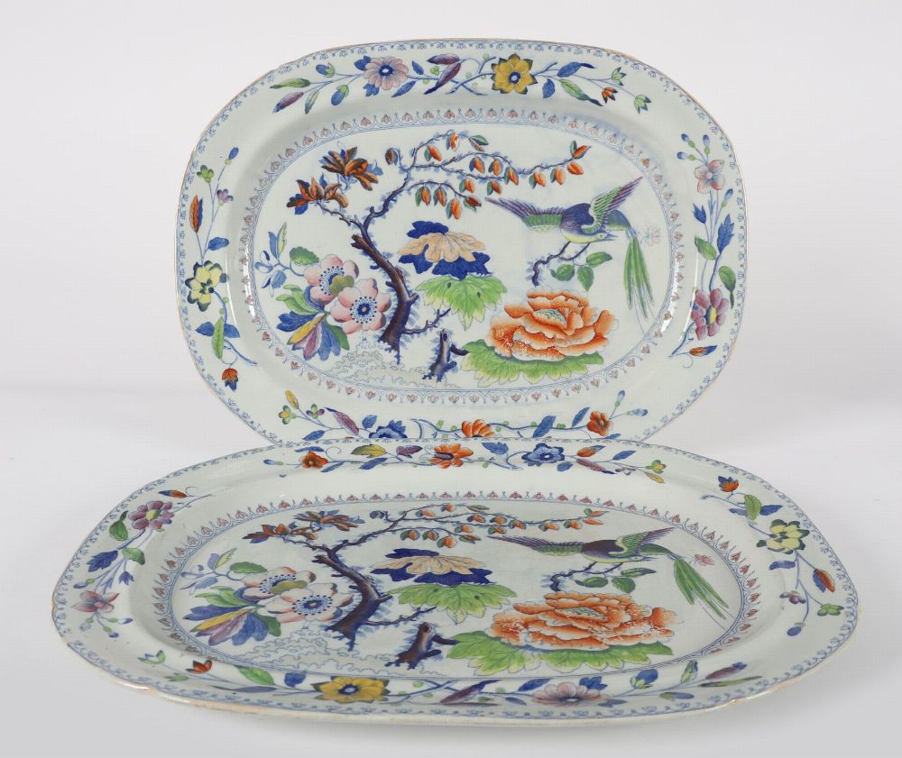 A pair of 19th-century porcelain meat platters by Davenport, each of oval form with floral and bird decoration in underglaze blue and enamelled overglaze colours. Characteristic tree branch and peony design with border detailing.