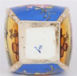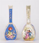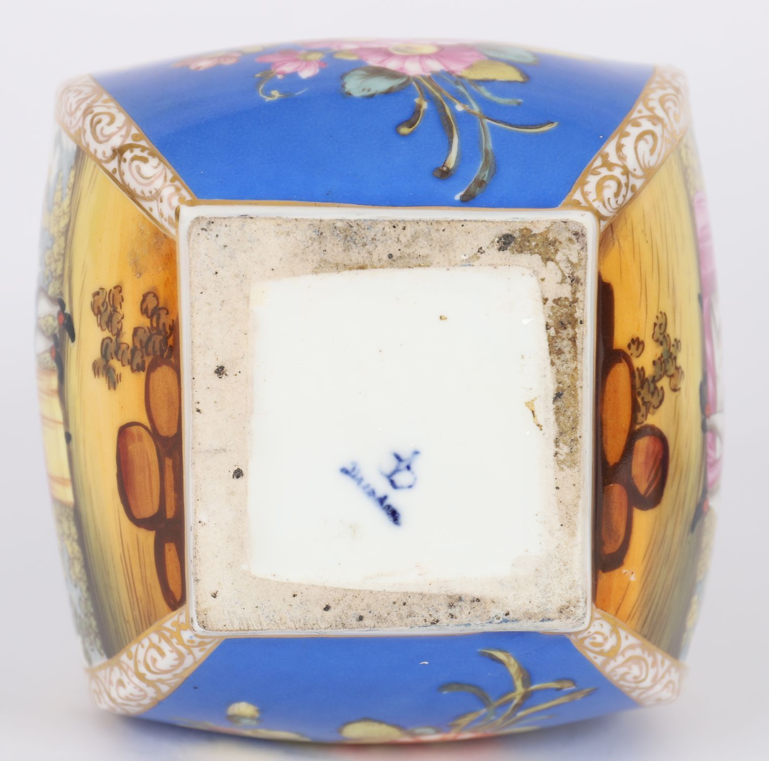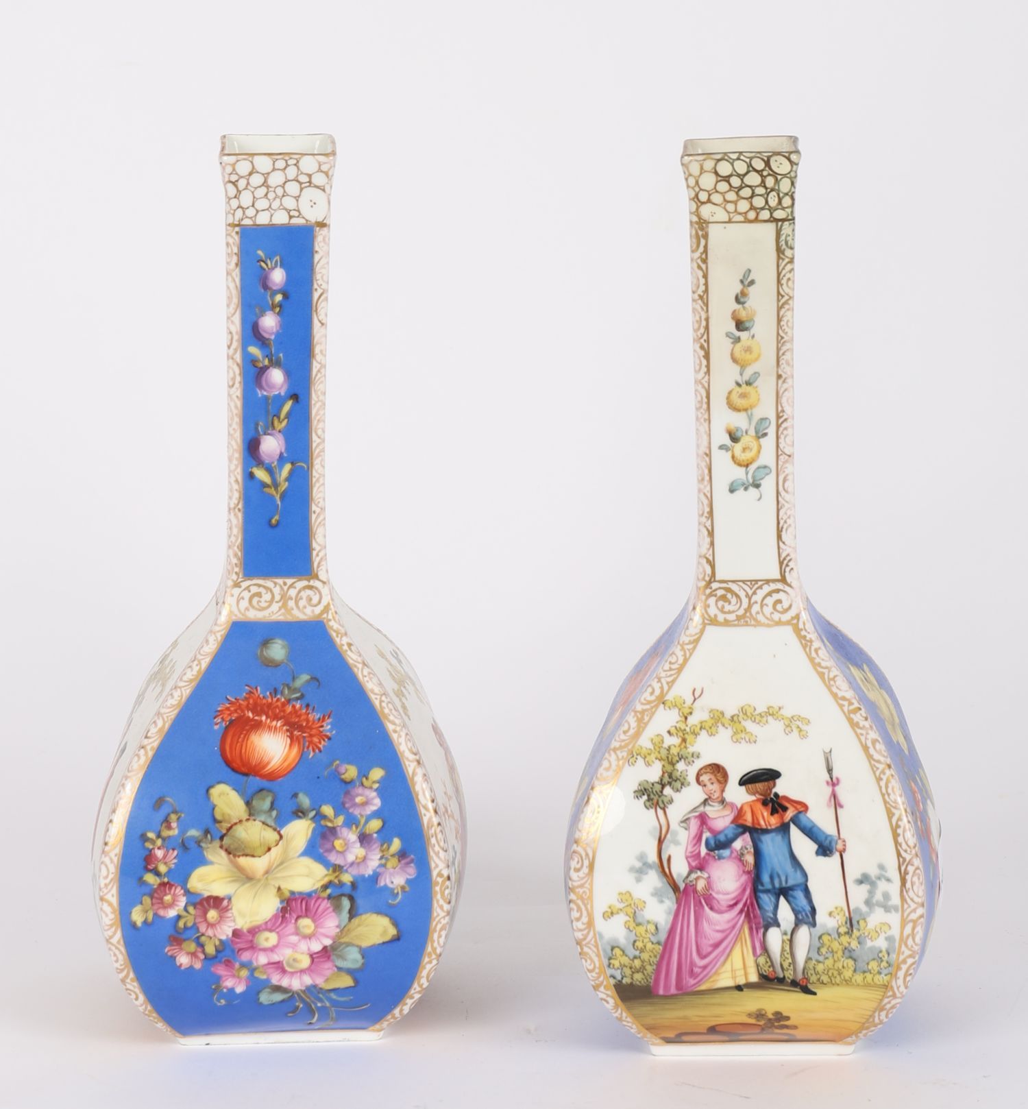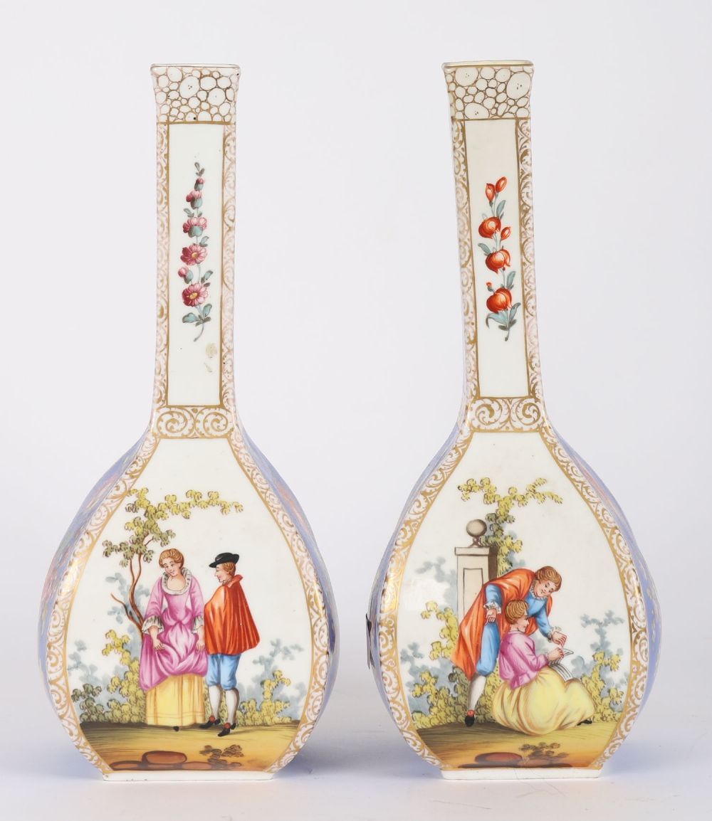 Each of elongated square-section form with chamfered edges, finely painted panels depicting 18th-century romantic couples in pastoral settings, alternating with floral sprays on cobalt and white grounds within gilt scroll borders. The necks with honeycomb gilt decoration and further floral detailing. The reverse panels with complementary floral arrangements.