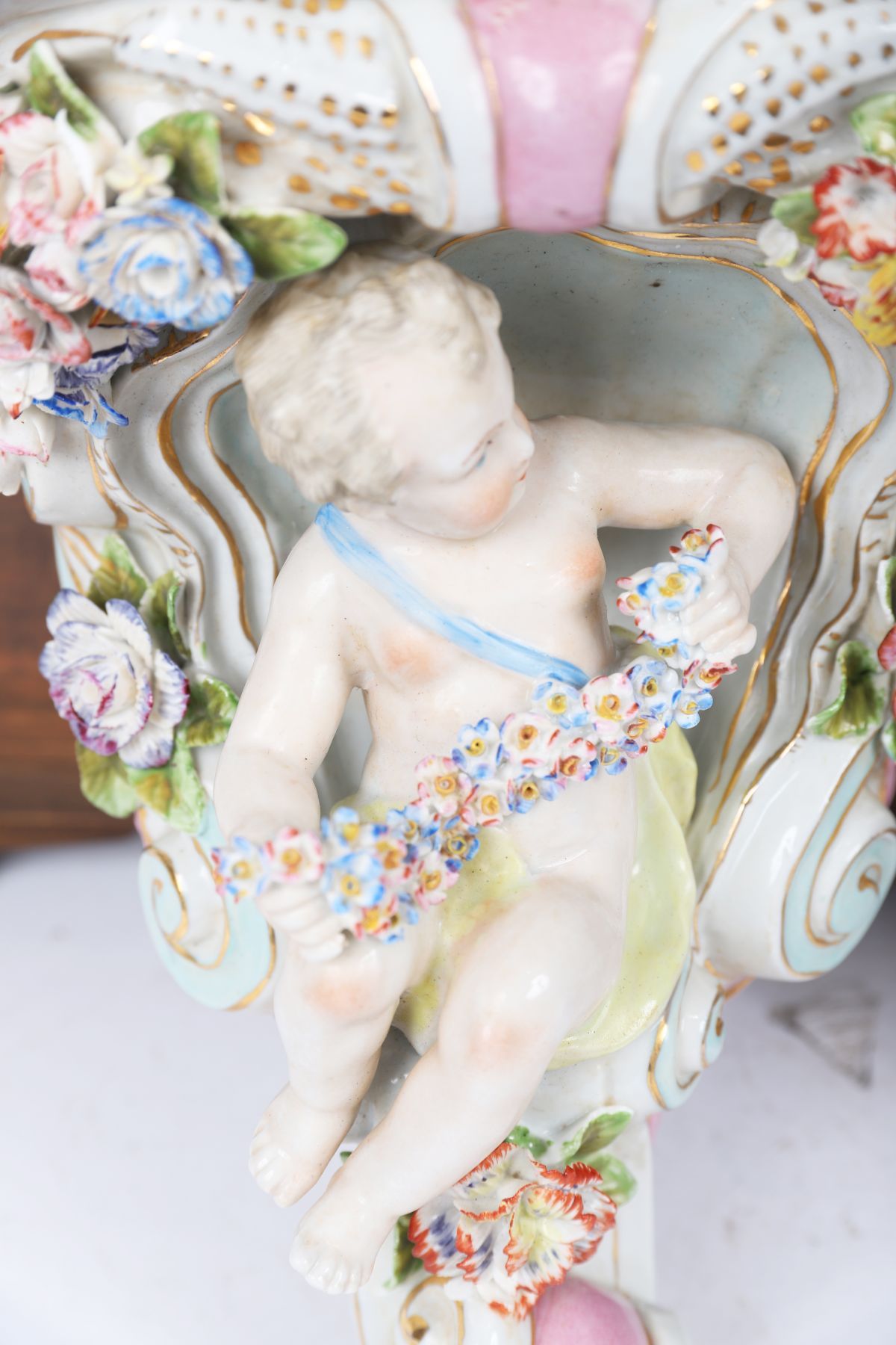 A decorative pair of 19th-century Dresden porcelain wall brackets, each with a pierced and floral-encrusted bowl supported by a winged putto, hand-painted with pastoral and courting scenes within blue and gilt borders.