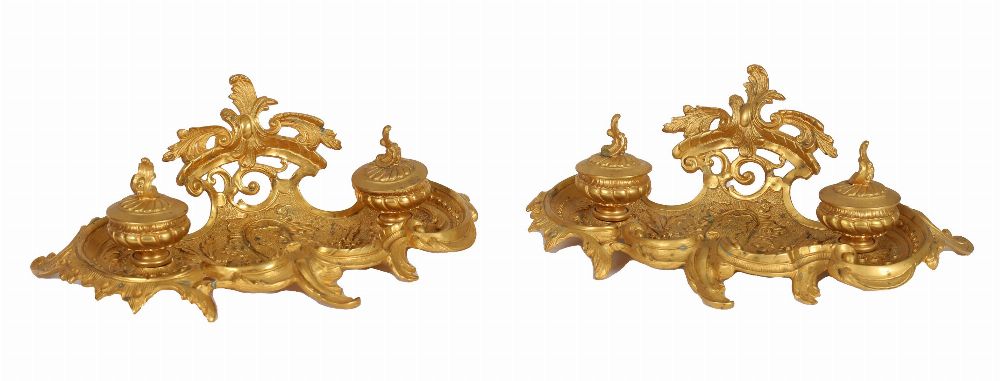 A pair of 19th-century French ormolu pen and ink stands, each of shaped rococo form, richly cast and chased with scrolling acanthus, floral motifs and shell ornament, the centres with oval cartouches, flanked by fitted lidded inkwells with foliate finials.