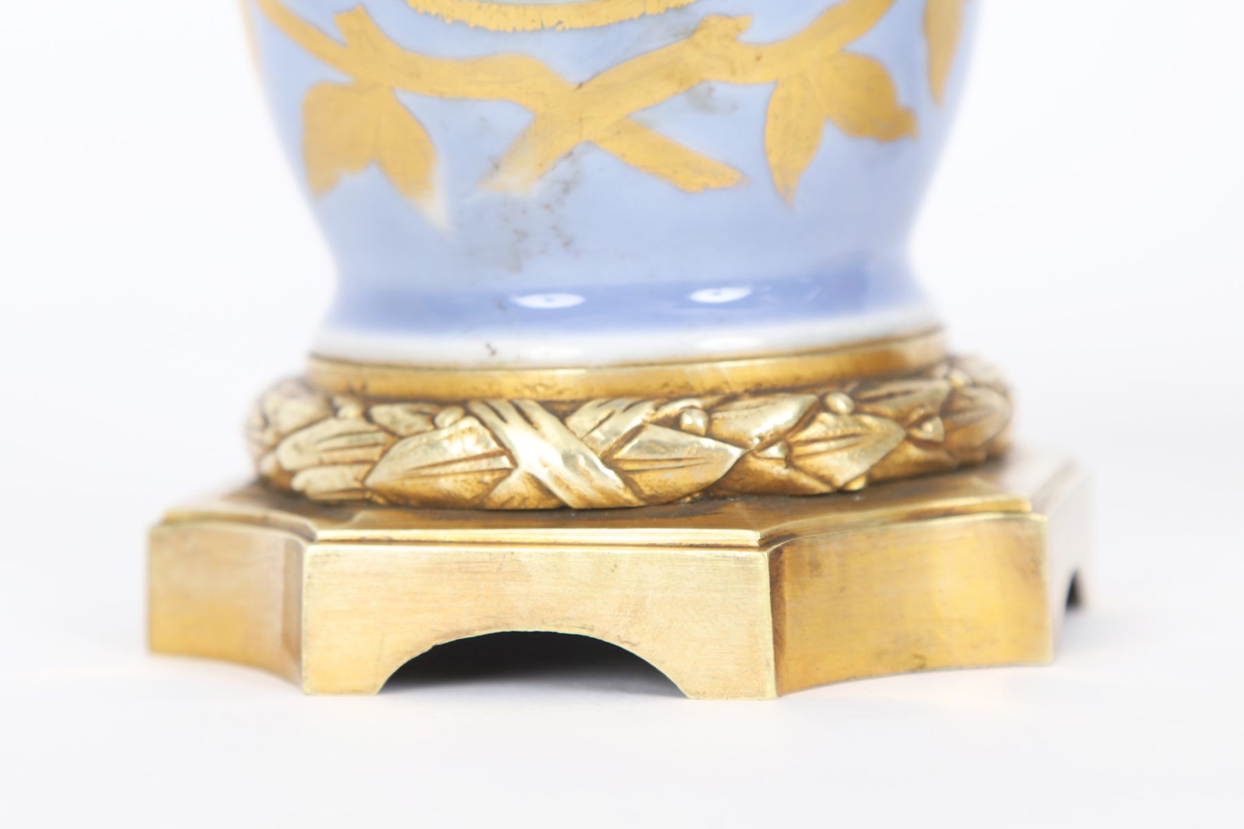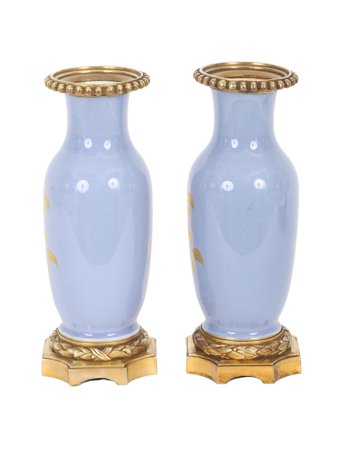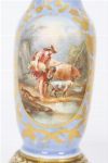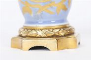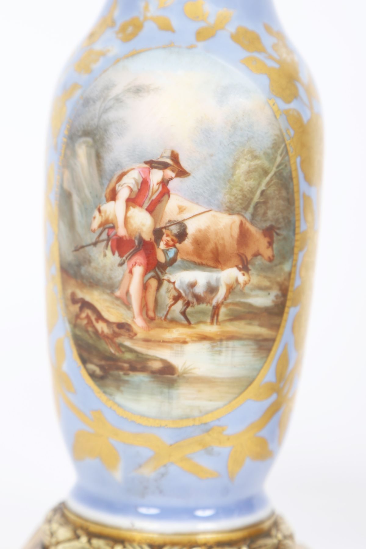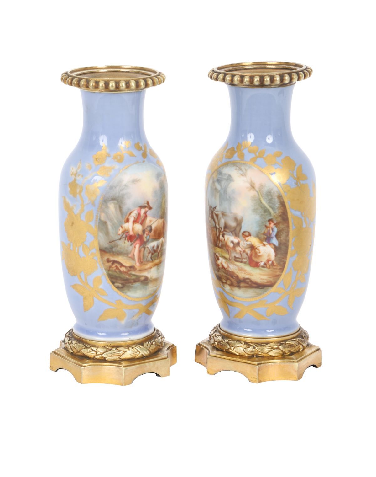 each of baluster form, painted with pastoral scenes within gilt reserves on a blue ground, mounted on gilt metal bases.