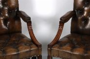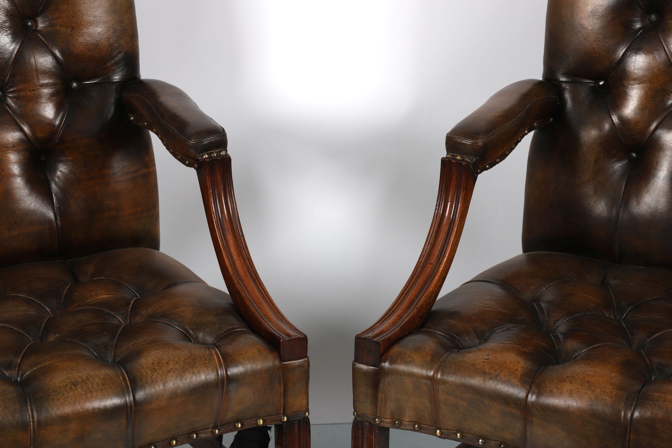 A handsome pair of 19th-century Gainsborough library armchairs, each with mahogany show-wood frames and upholstered in rich buttoned brown leather. The shaped backs and generous seats are deeply tufted, with close brass studding to the edges. The scrolled open arms are carved and reeded, raised on square tapering front legs and outswept rear supports, all terminating in brass castors.