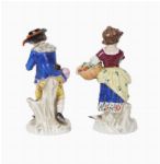 Pair of finely painted 19th century German porcelain figures depicting romantic couples in period dress with gilt and floral embellishment.